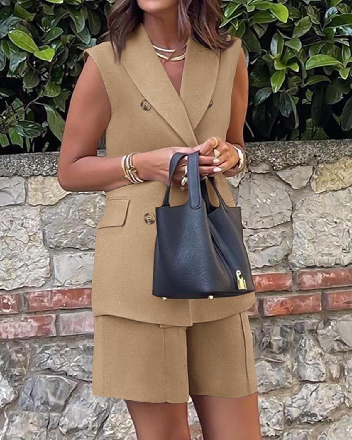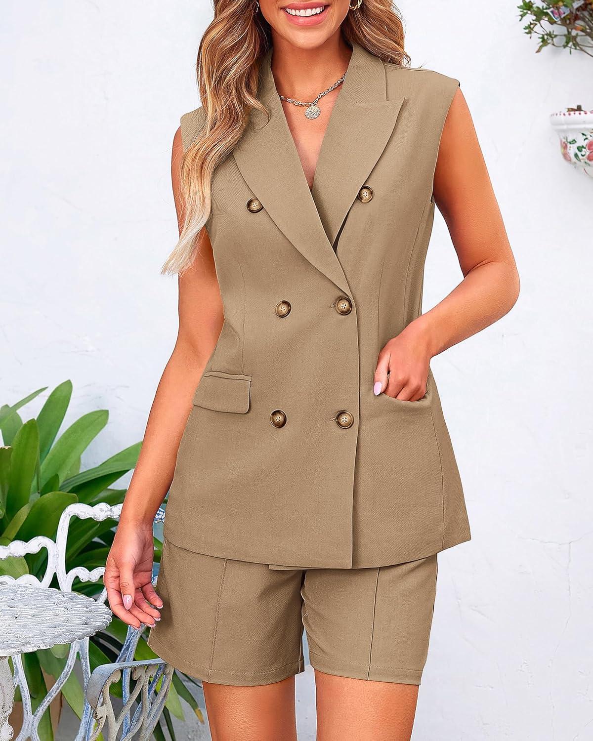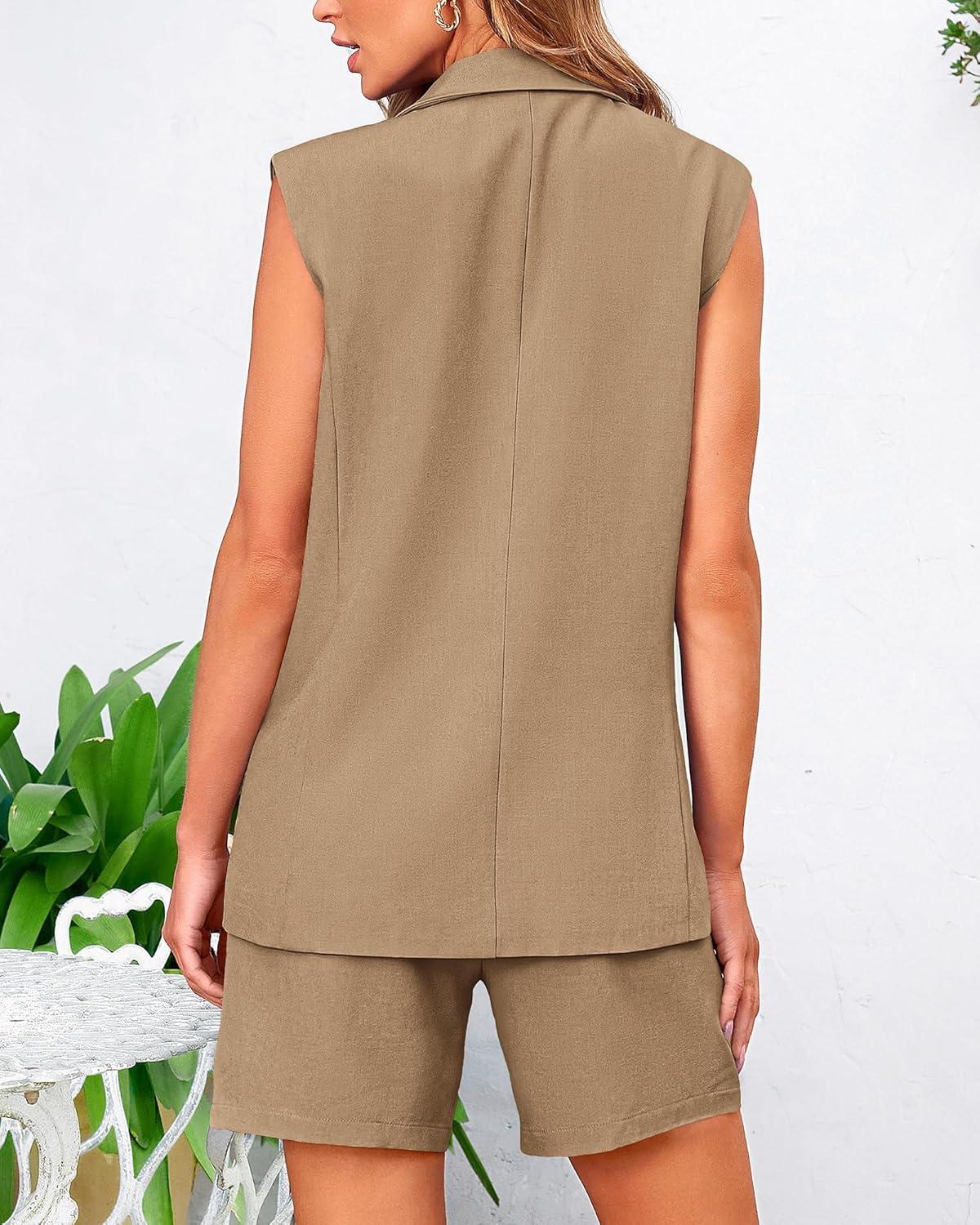 BTFBM Two Piece Sets For Women Summer 2025 Pockets Button Down Sleeveless Vest And Shorts Work Business Casual Outfits(Khaki)