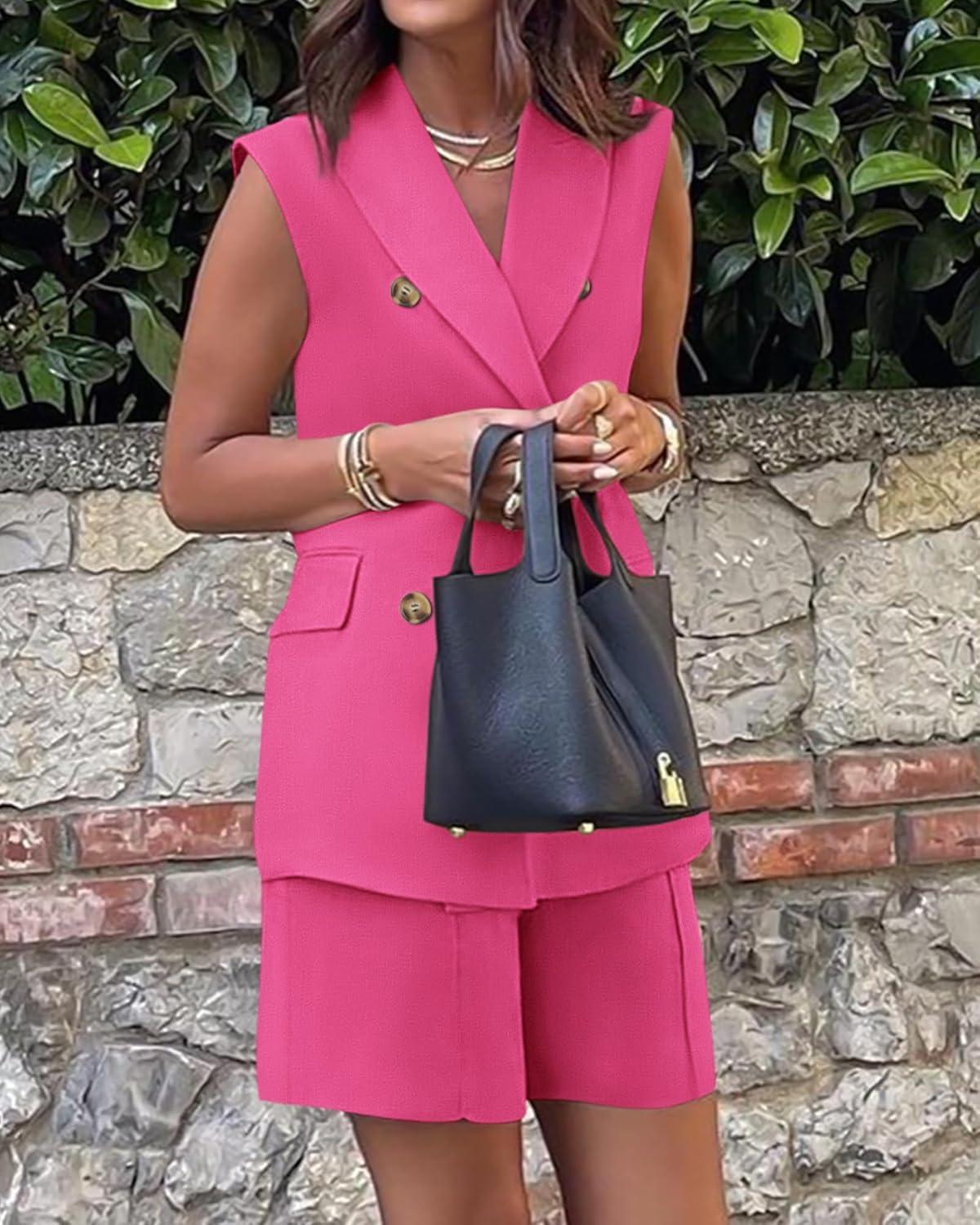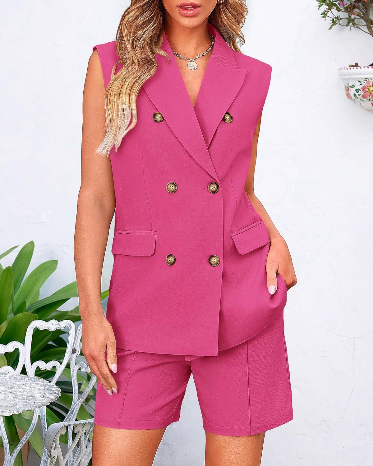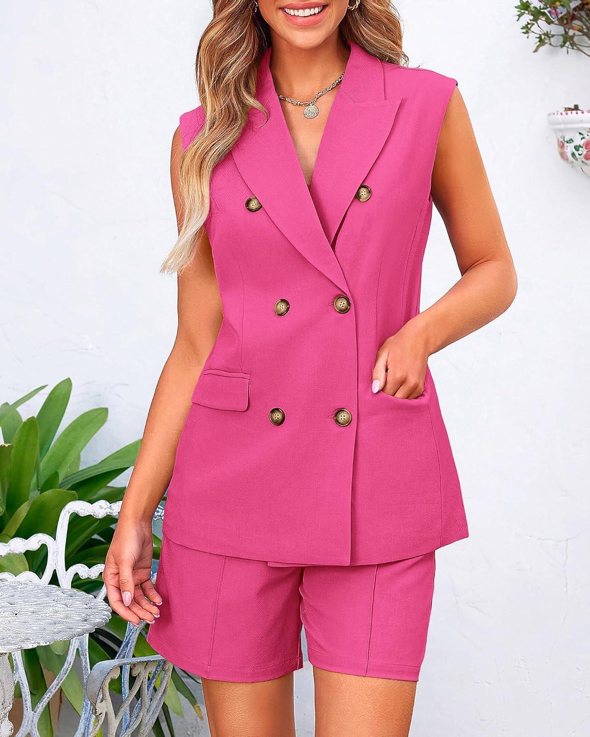 BTFBM Two Piece Sets For Women Summer 2025 Pockets Button Down Sleeveless Vest And Shorts Work Business Casual Outfits(Rose Red)