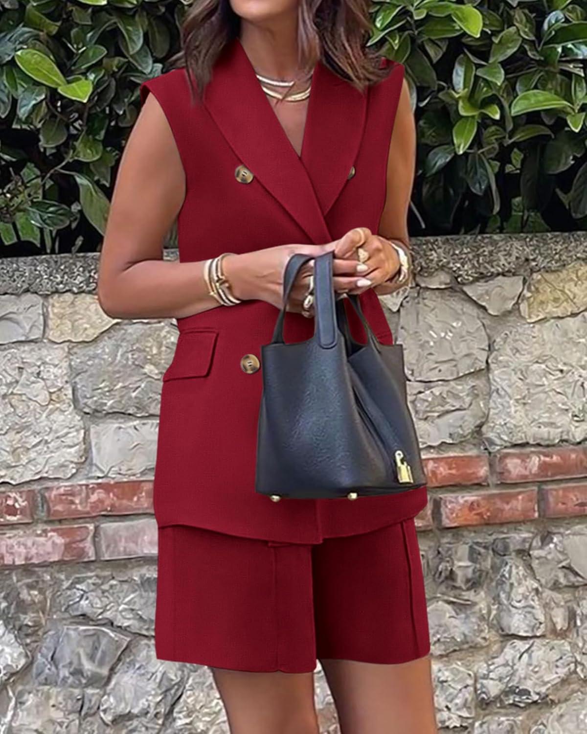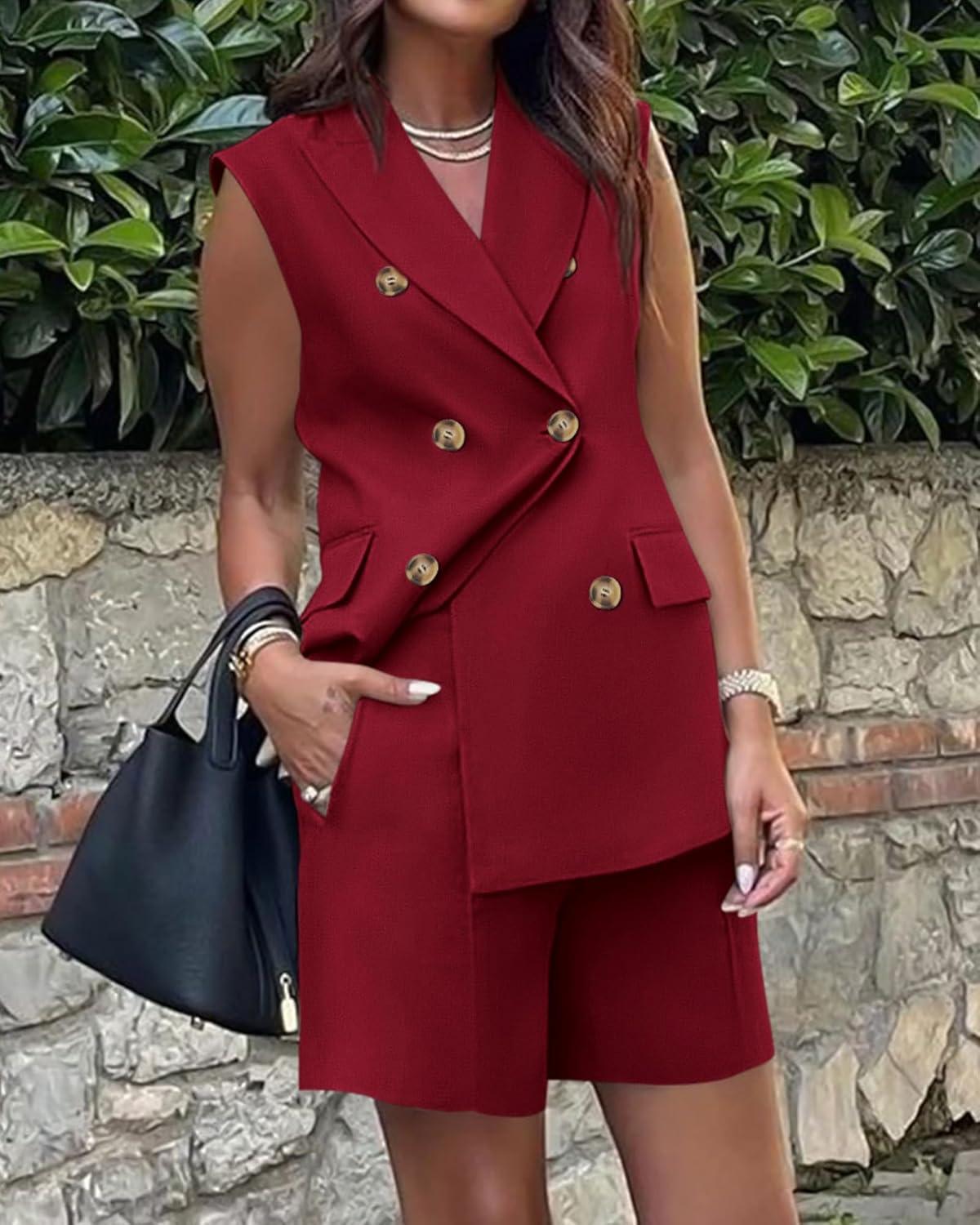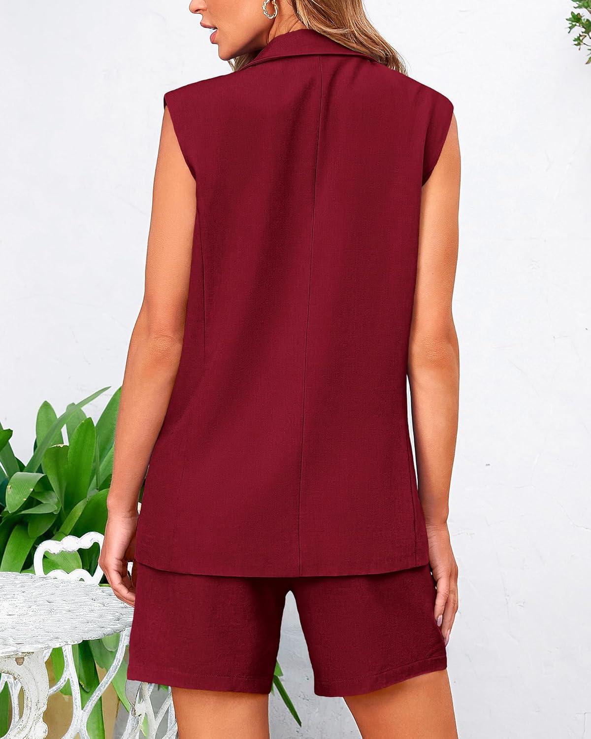 BTFBM Two Piece Sets For Women Summer 2025 Pockets Button Down Sleeveless Vest And Shorts Work Business Casual Outfits(Wine Red)