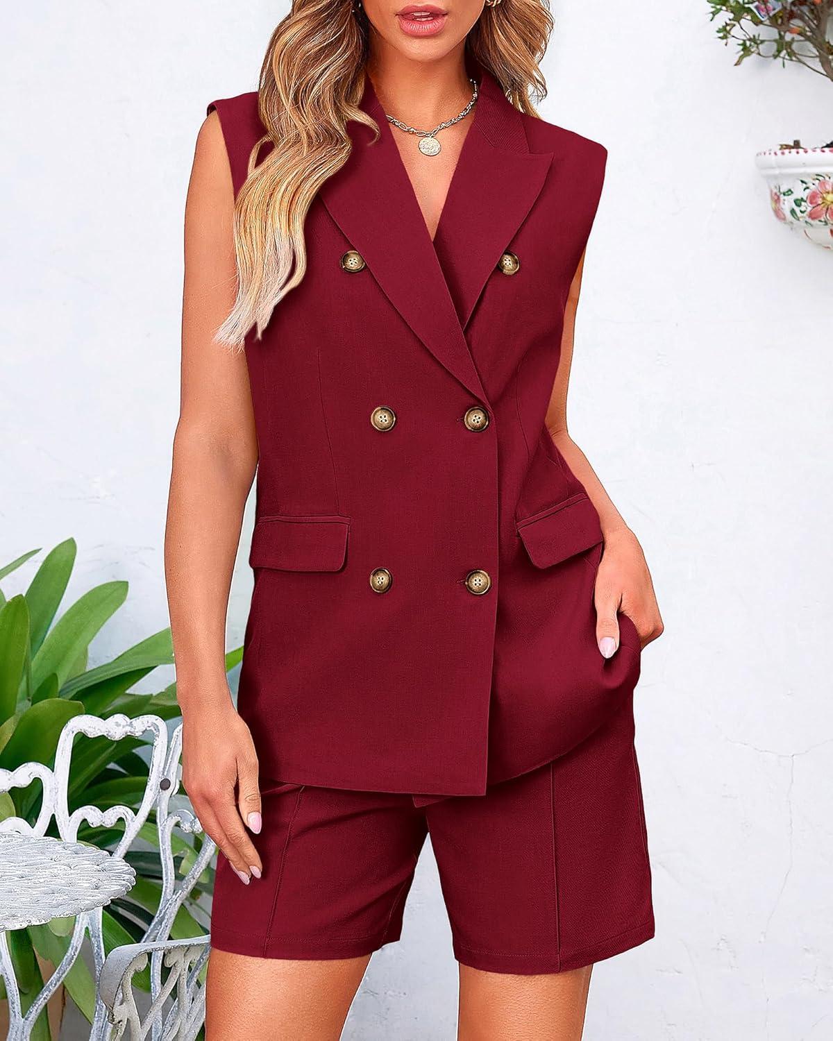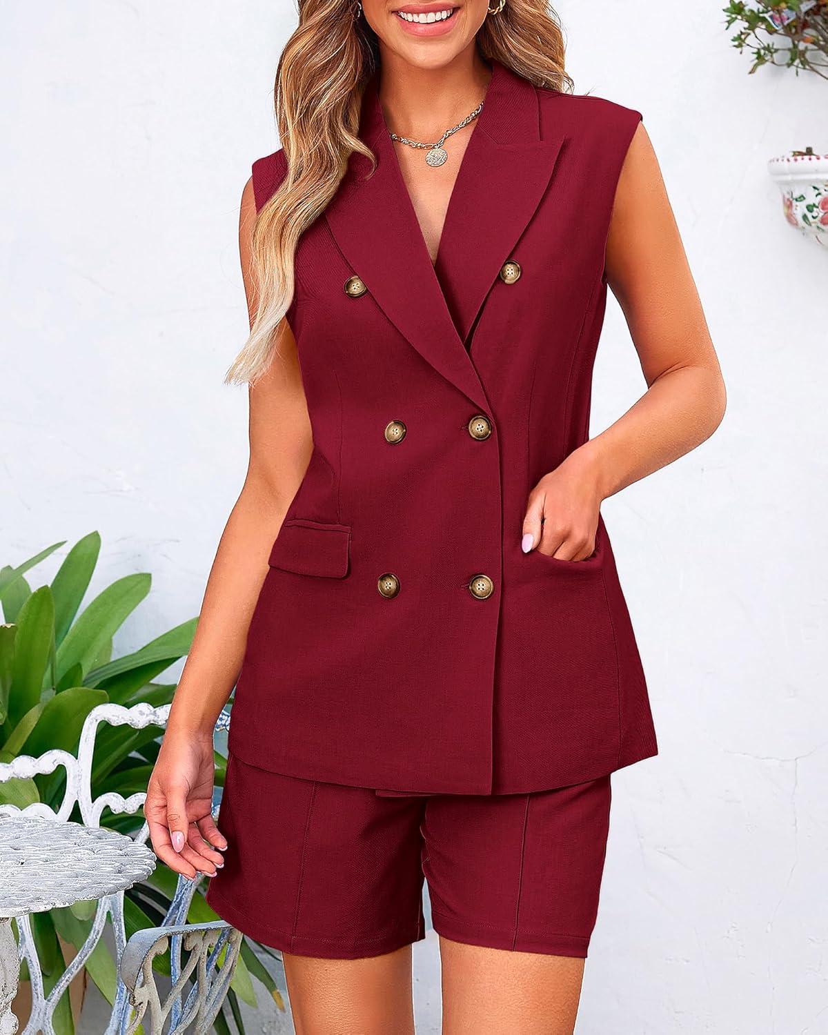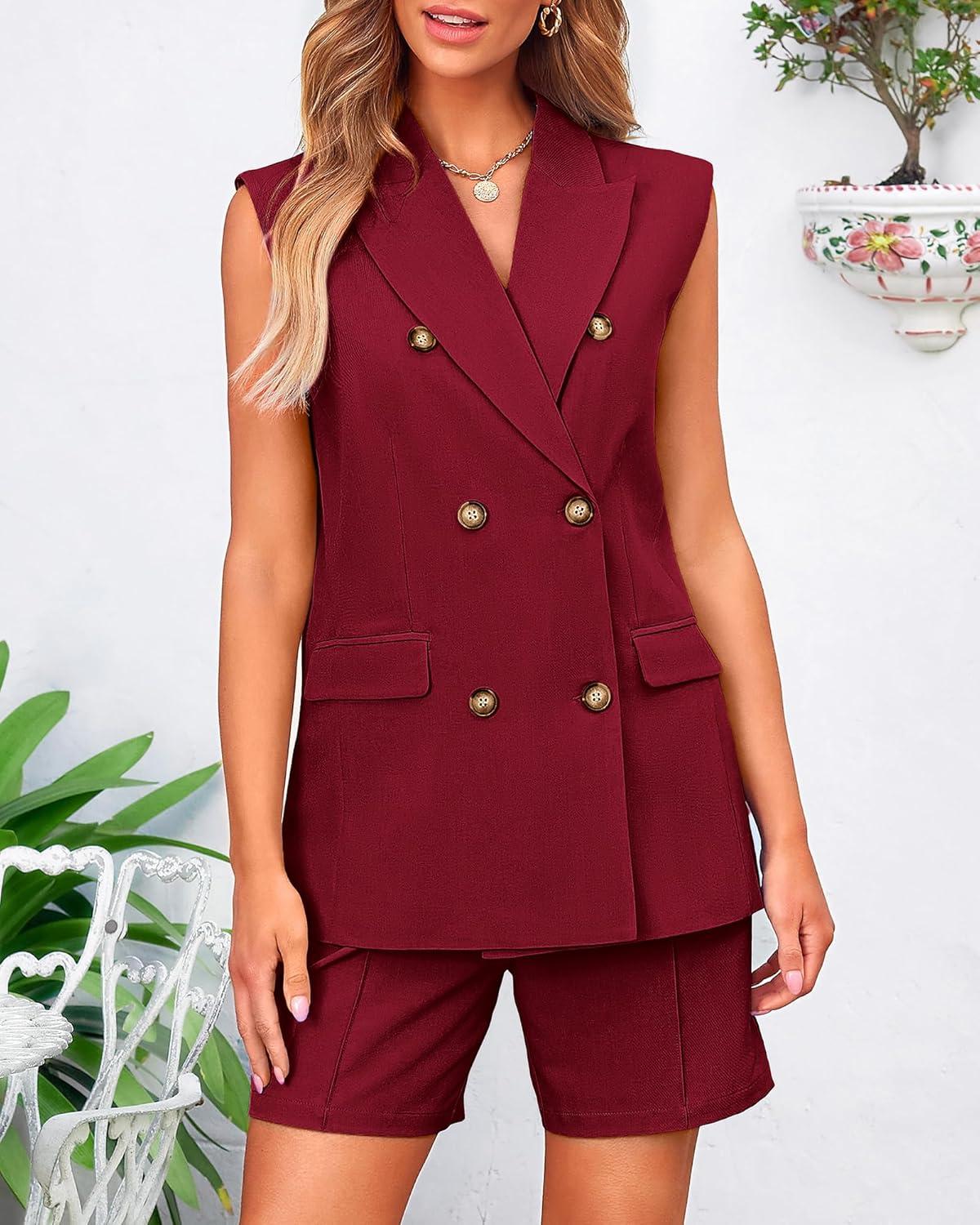 BTFBM Two Piece Sets For Women Summer 2025 Pockets Button Down Sleeveless Vest And Shorts Work Business Casual Outfits(Wine Red)