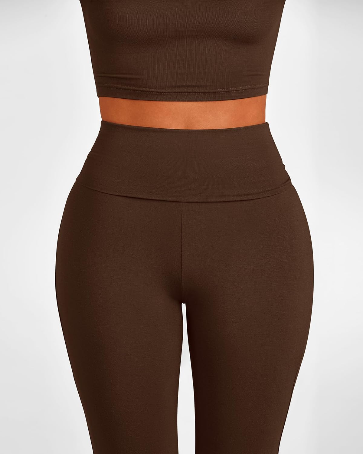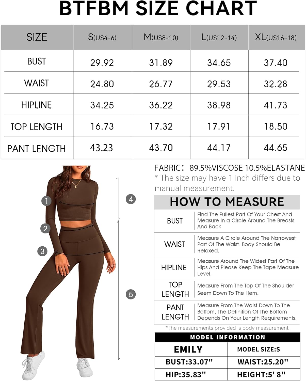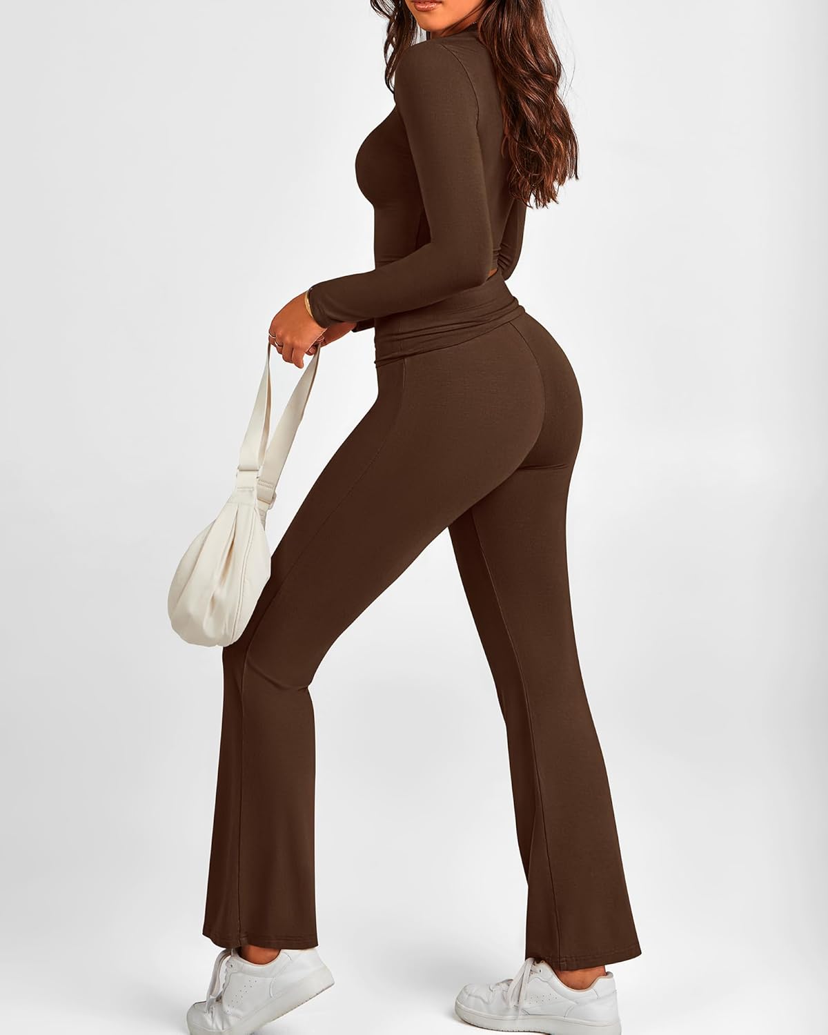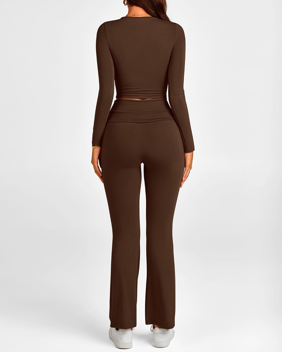 BTFBM Women 2 Piece Lounge Sets Fold Over Yoga Pants Long Sleeve Cropped Top Matching Set Two Piece Tracksuit Pajamas(Solid Coffee)