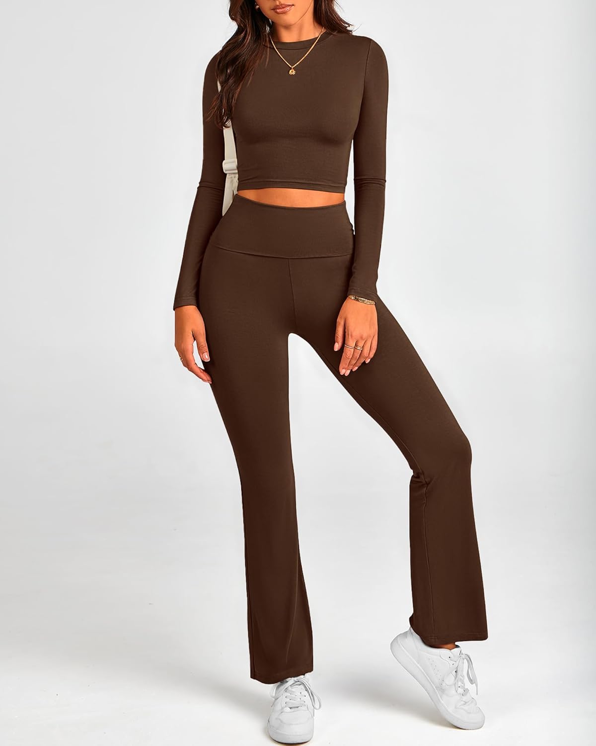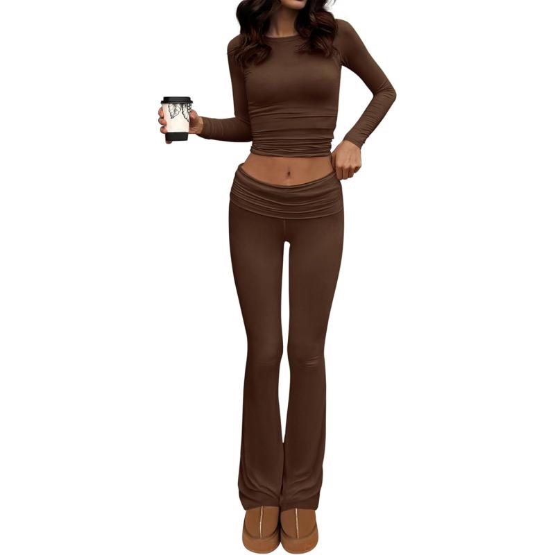 BTFBM Women 2 Piece Lounge Sets Fold Over Yoga Pants Long Sleeve Cropped Top Matching Set Two Piece Tracksuit PajamasSolid Coffee