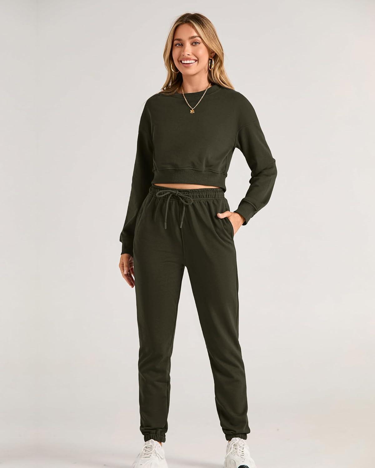 BTFBM Women 2 Piece Outfits Long Sleeve Crop Top Pullover Drawstring Pant Jogger Set Casual Sweatsuits Tracksuit Pockets(Army Green)