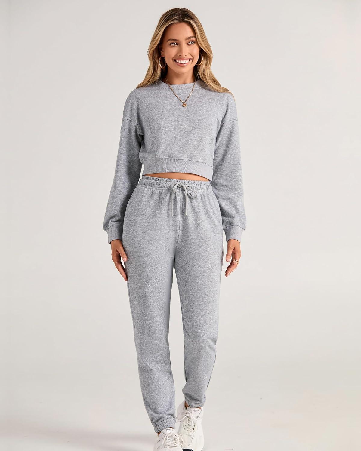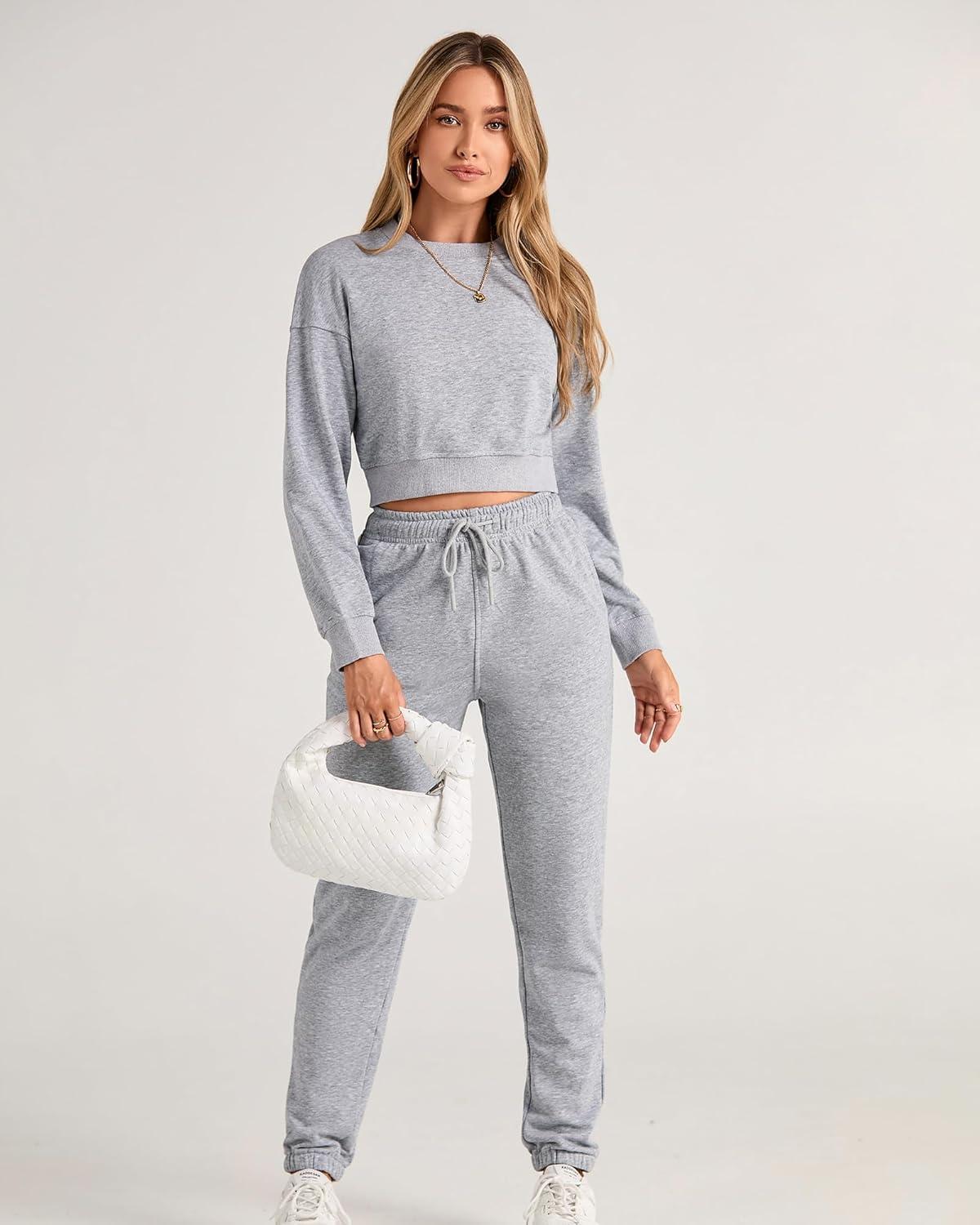 BTFBM Women 2 Piece Outfits Long Sleeve Crop Top Pullover Drawstring Pant Jogger Set Casual Sweatsuits Tracksuit Pockets(Grey)