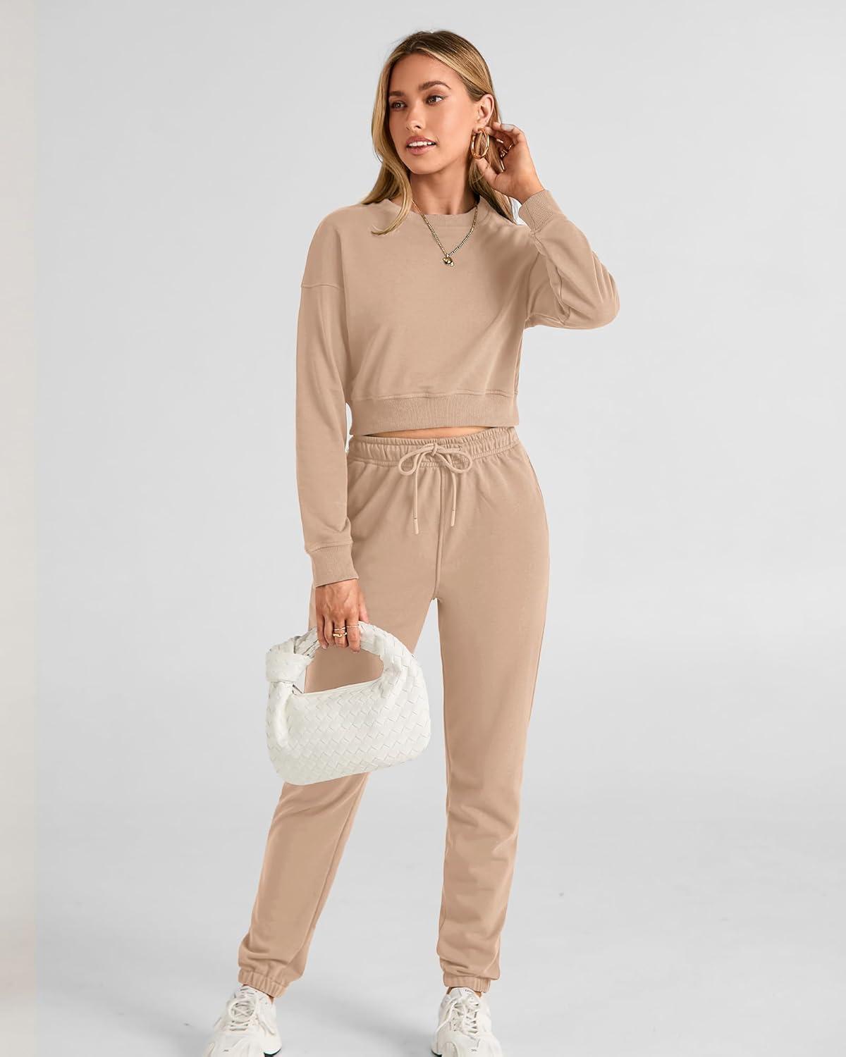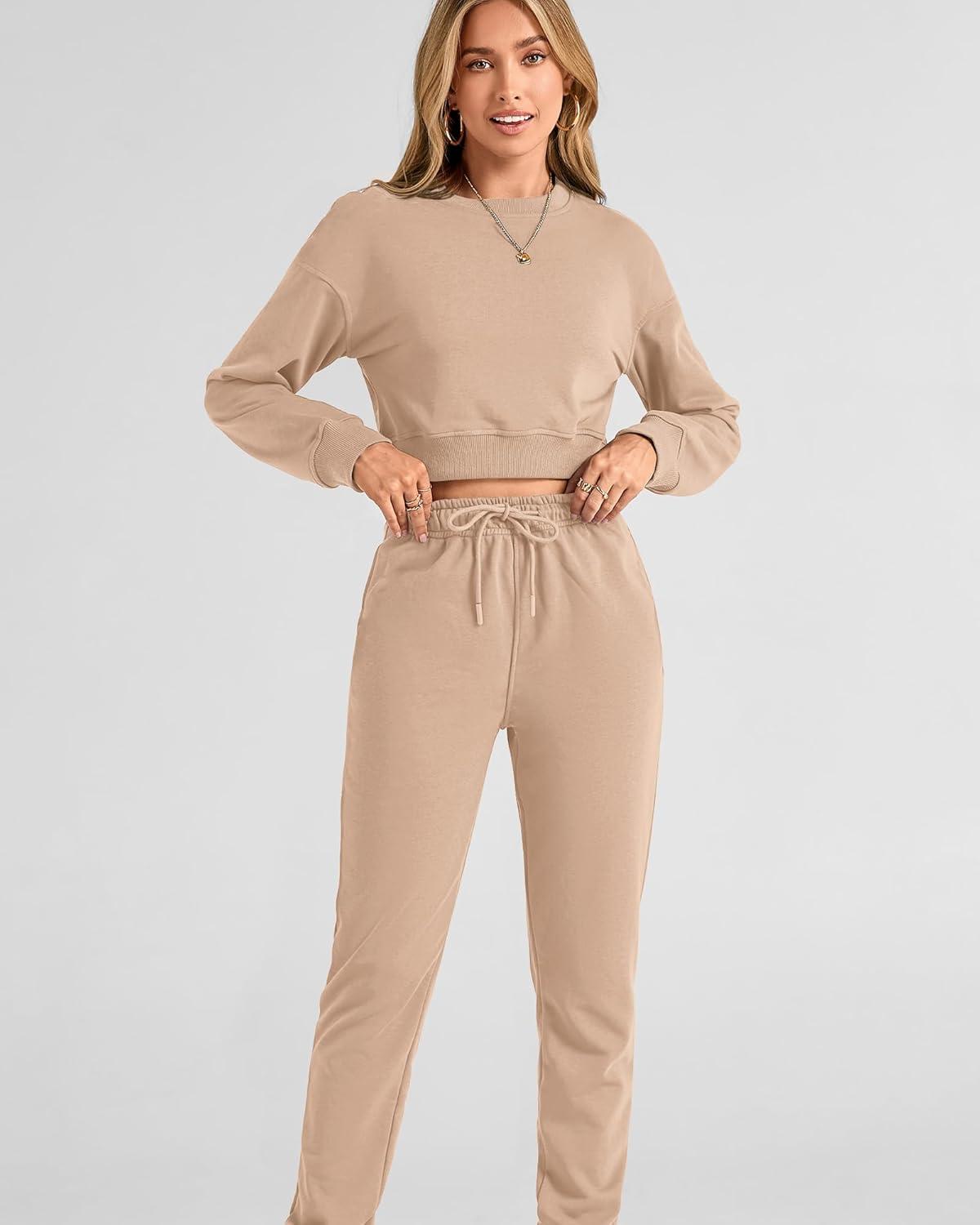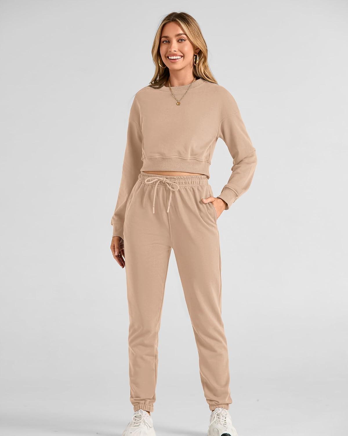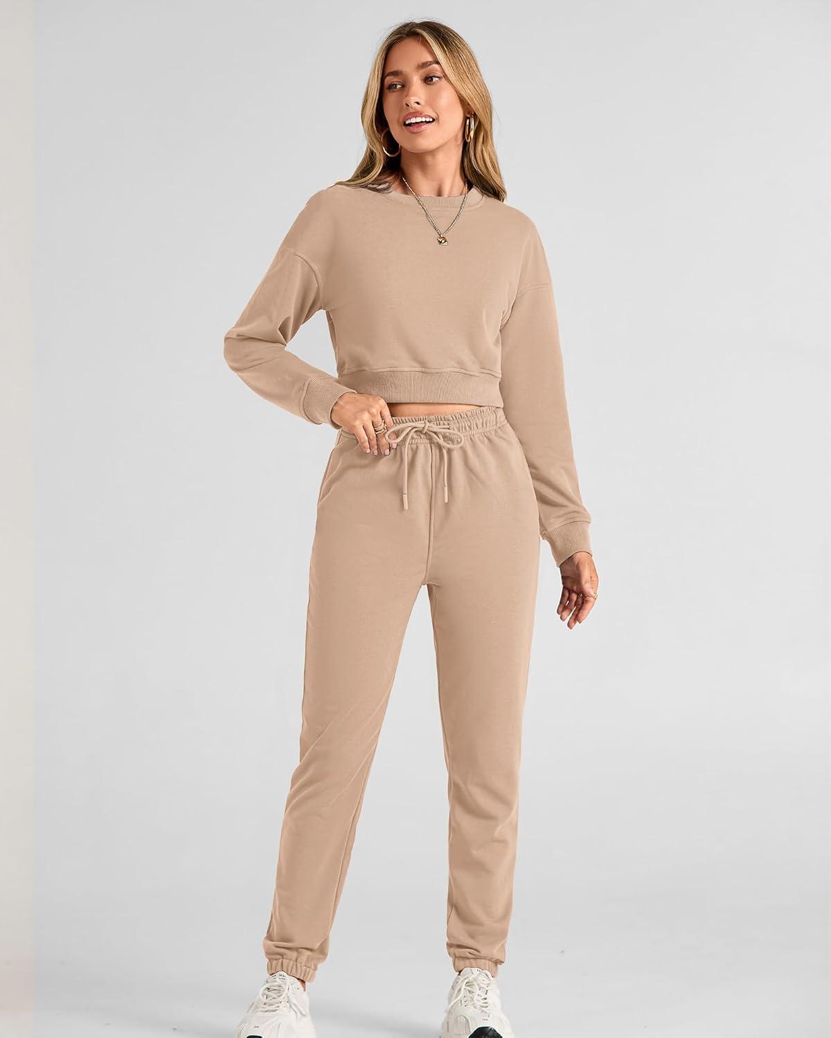 BTFBM Women 2 Piece Outfits Long Sleeve Crop Top Pullover Drawstring Pant Jogger Set Casual Sweatsuits Tracksuit Pockets(Khaki)
