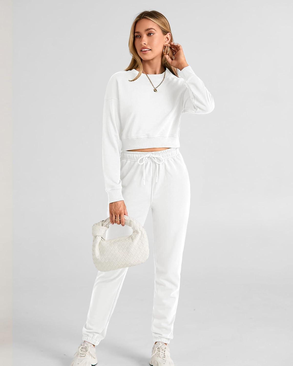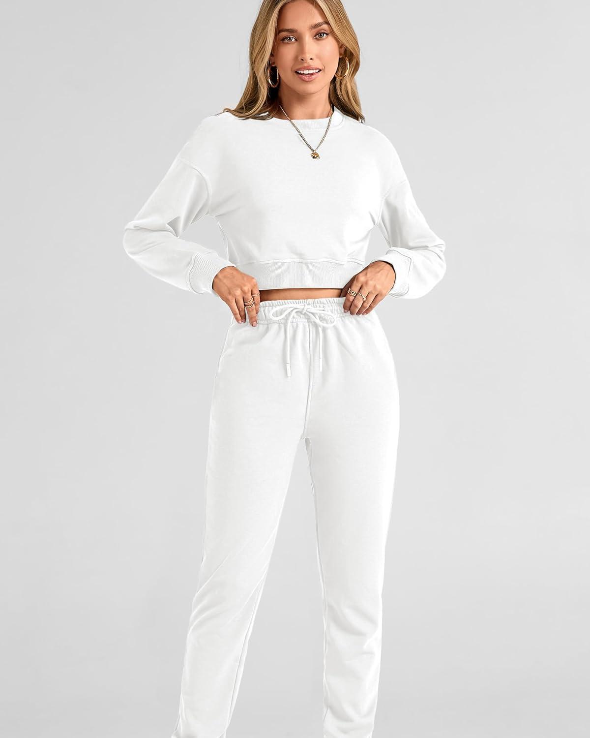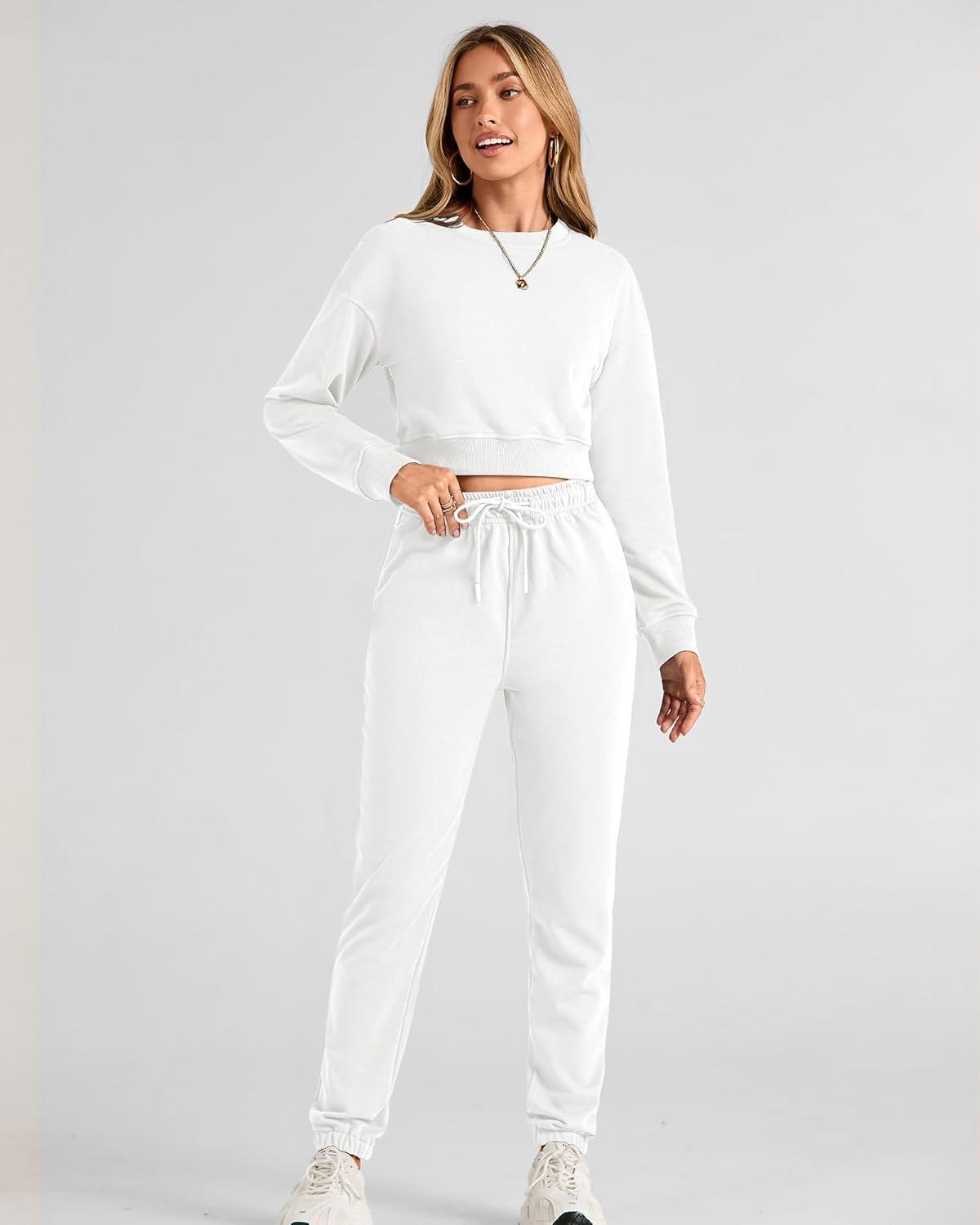 BTFBM Women 2 Piece Outfits Long Sleeve Crop Top Pullover Drawstring Pant Jogger Set Casual Sweatsuits Tracksuit Pockets(White)