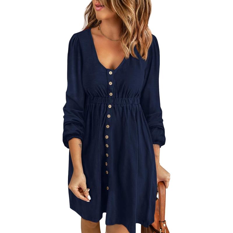 BTFBM Women 2024 Casual Button Down Summer Fall Dresses Long Sleeve Crew Neck Solid High Waist Short Tunic Mini DressLong Buttons Navy