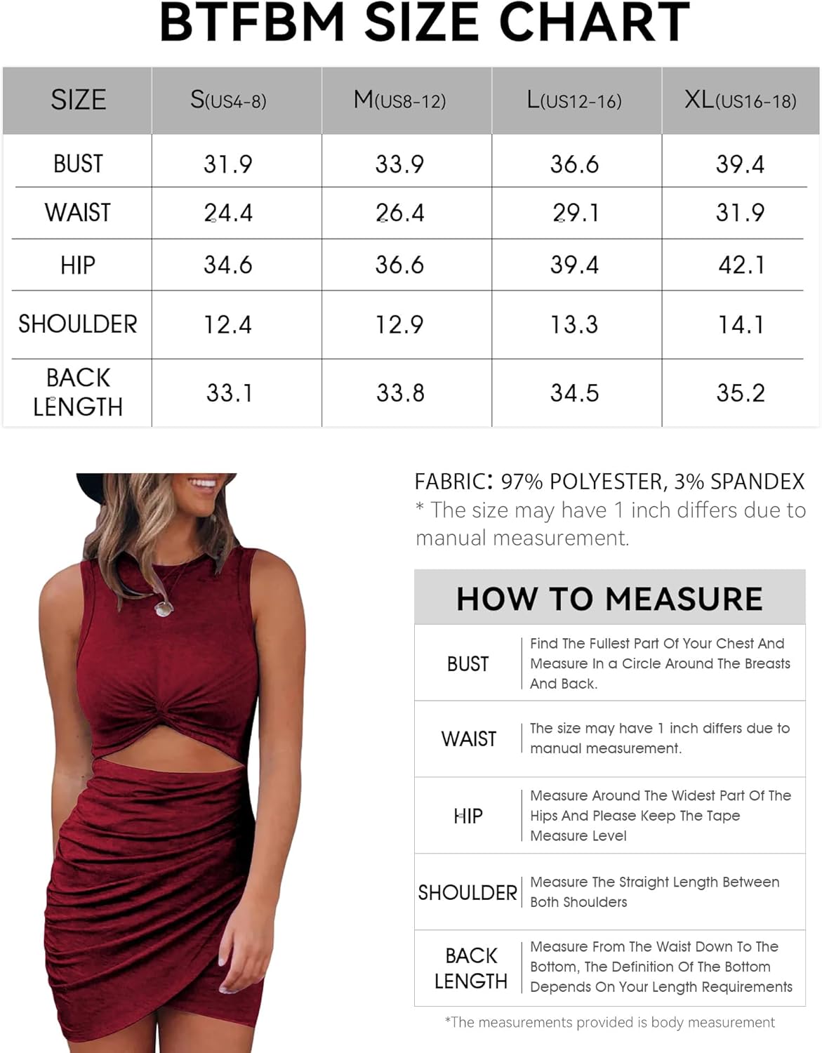 Be the first to review “BTFBM Women 2024 Summer Sleeveless Casual Crewneck Bodycon Tank Dress Cutout Twist Slim Wrap Club Party Evening Dresses(Wine Red)”