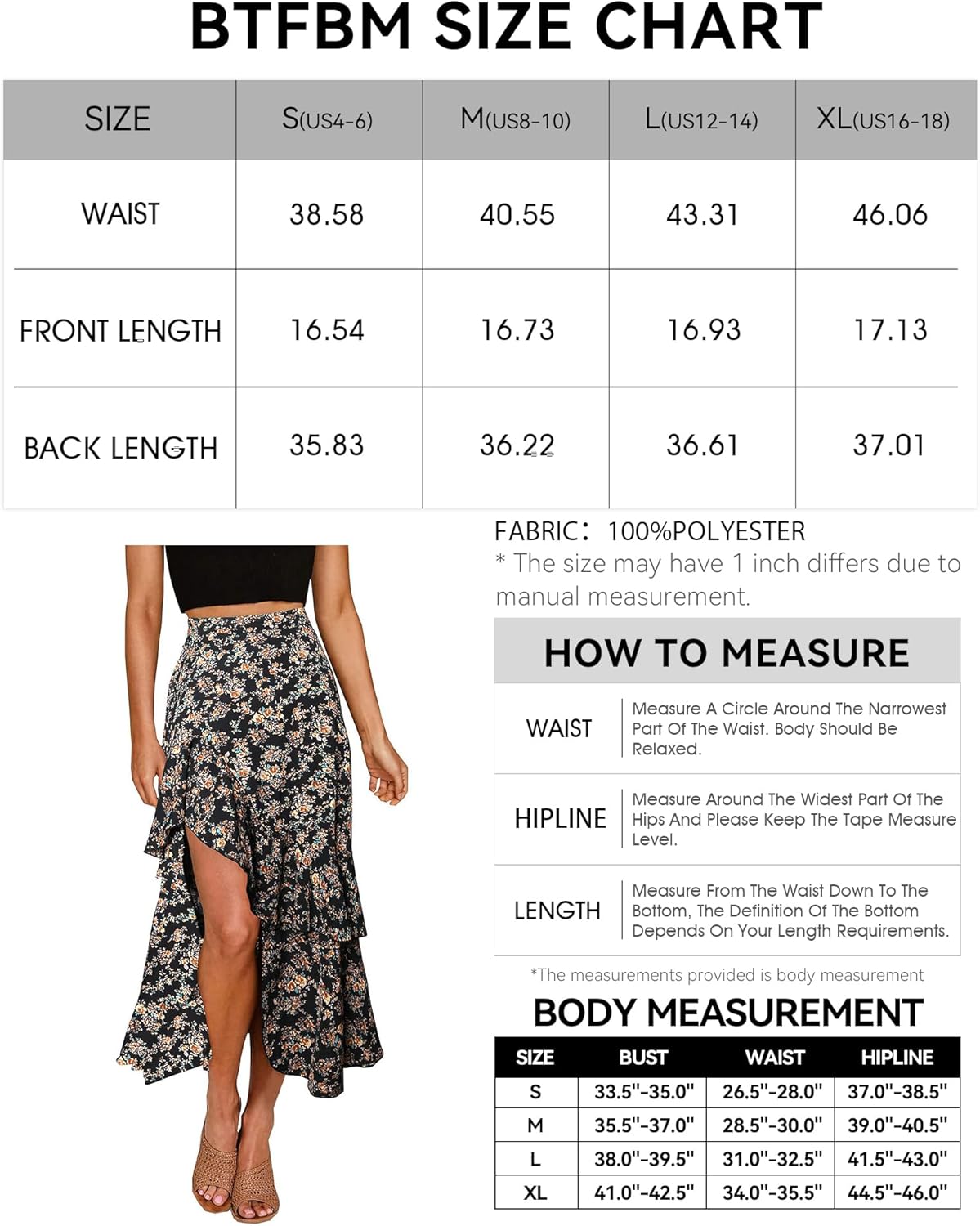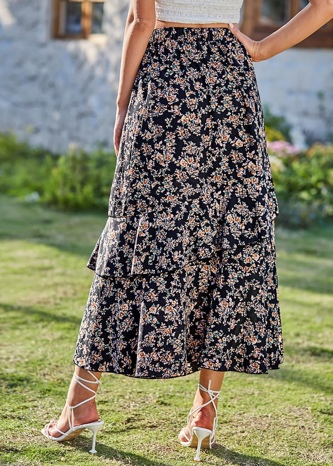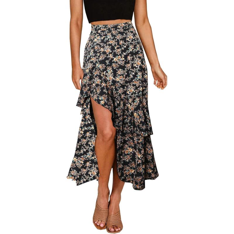 BTFBM Women 2024 Summer Spring Boho Long Skirts Dress Floral Print Elastic Waist Split Ruffle High Low Beach Maxi SkirtPrint Floral Black