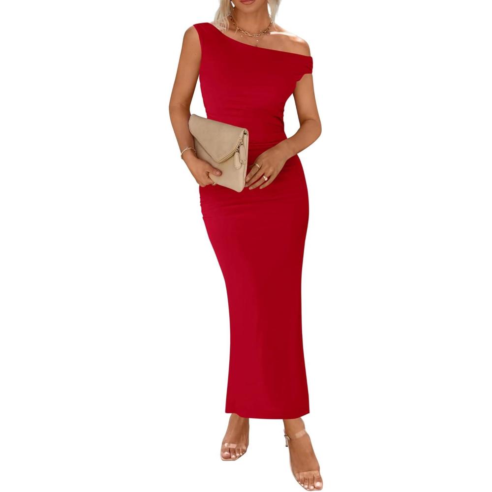 Get up to 50% off on BTFBM Women 2025 Summer One Shoulder Bodycon Ruched Maxi Dress Slit Mesh Long Formal Cocktail Fall Wedding Guest Dresses(Red) styles during our spring sale event.