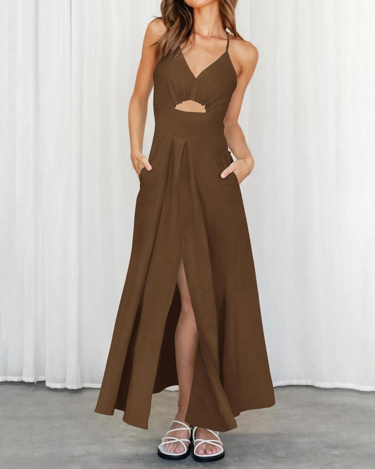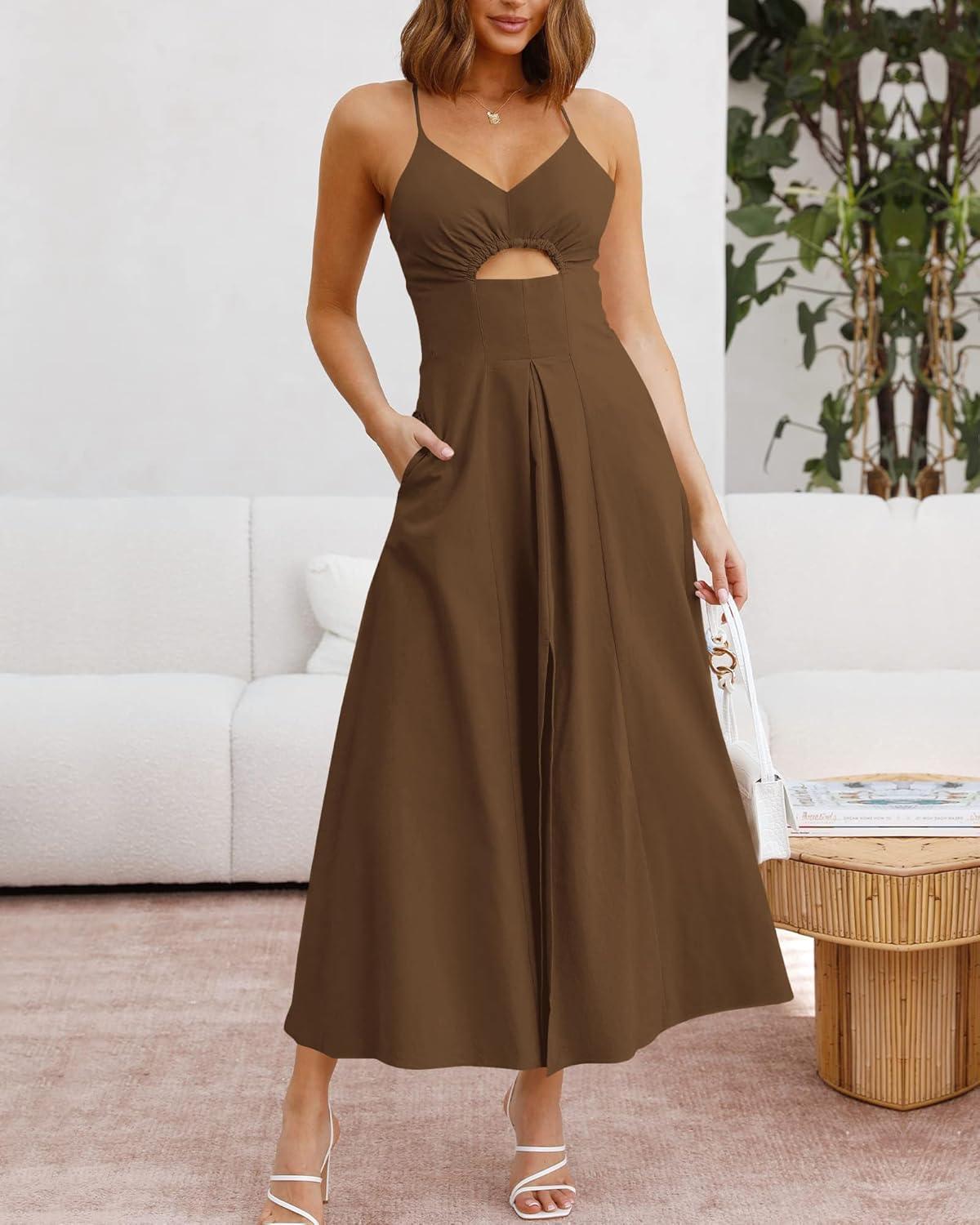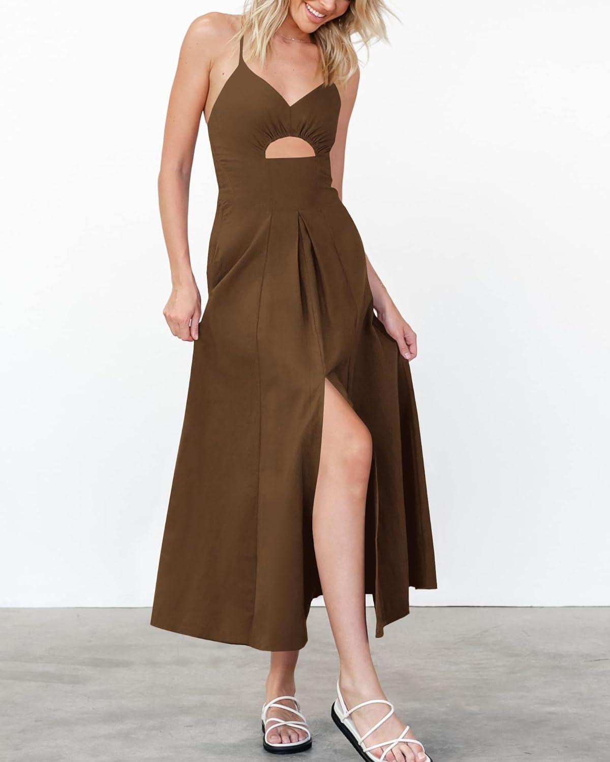 BTFBM Women 2025 Summer Spaghetti Strap Midi Dress Sleeveless V Neck Cutout Slit Casual Beach Party Maxi Dresses Pockets(Brown)