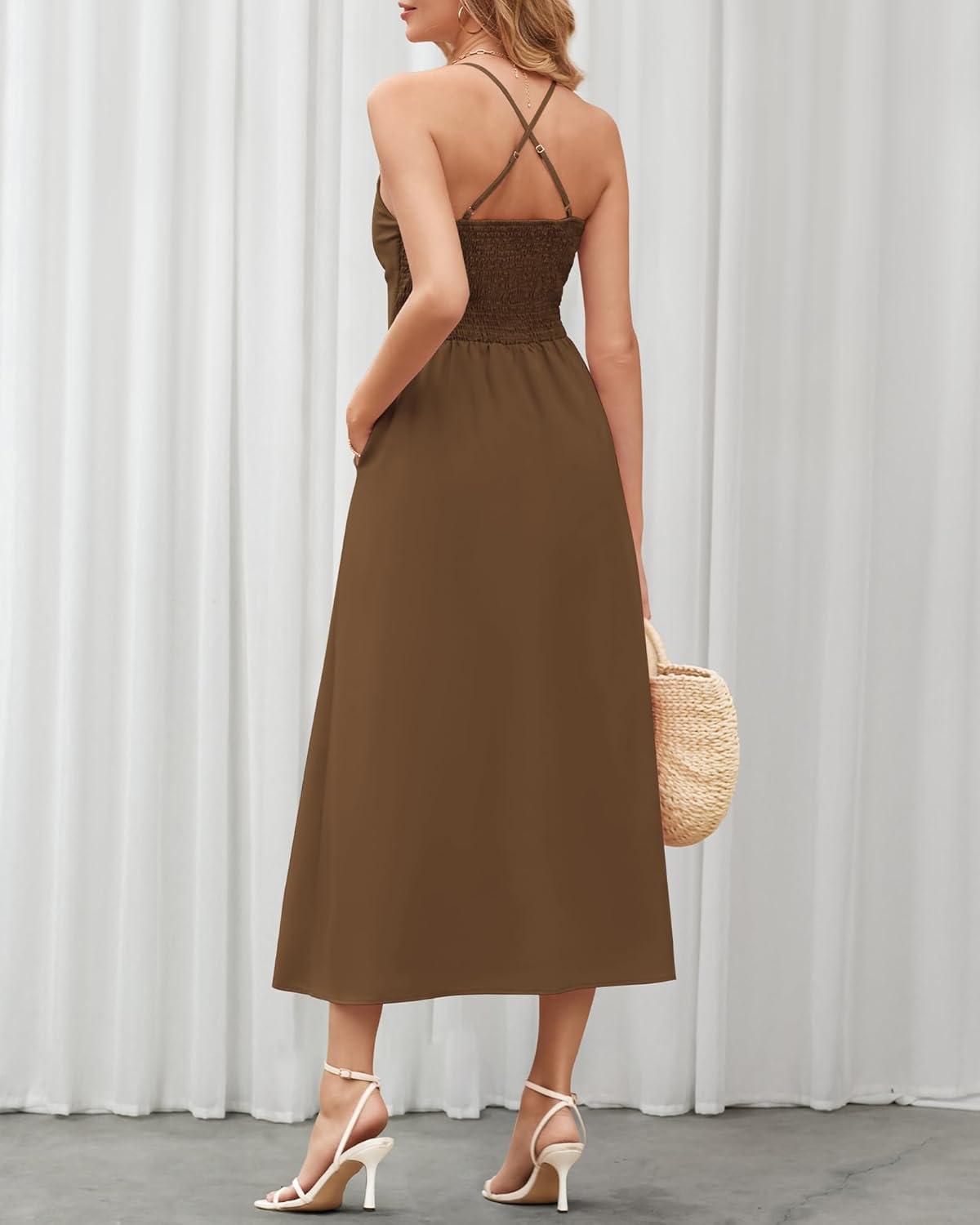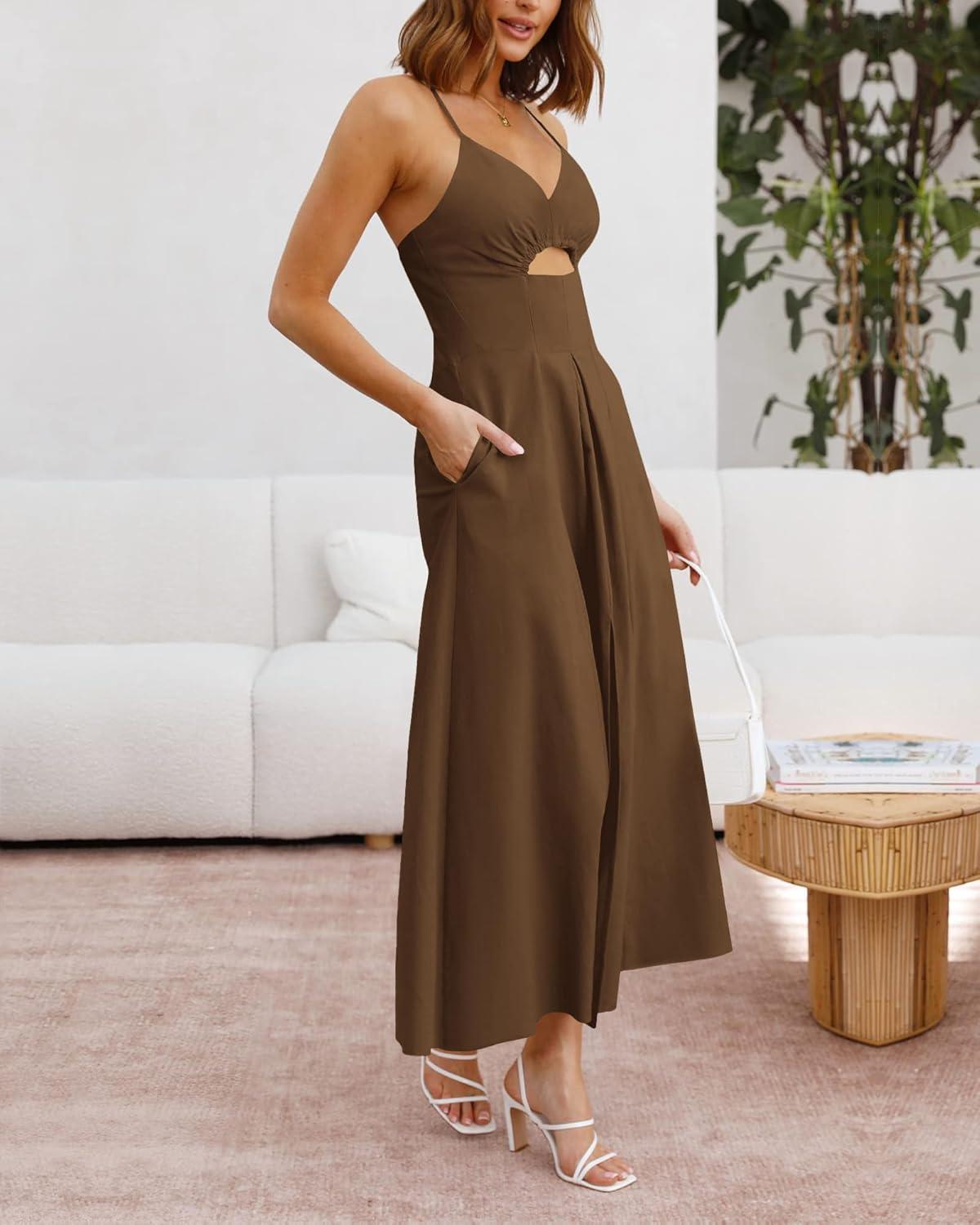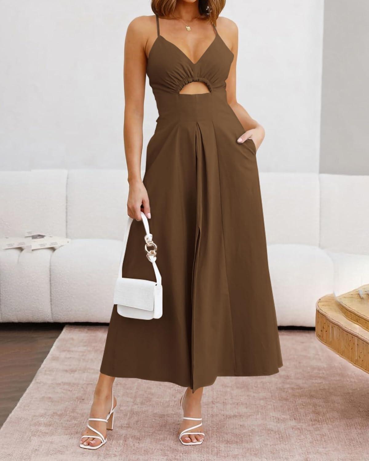 BTFBM Women 2025 Summer Spaghetti Strap Midi Dress Sleeveless V Neck Cutout Slit Casual Beach Party Maxi Dresses Pockets(Brown)