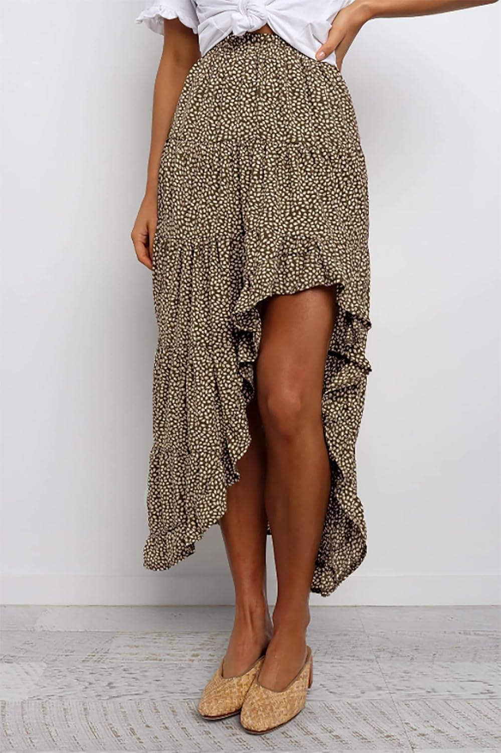 BTFBM Women 2025 Summer Spring Boho Long Skirts Dress Floral Print Elastic Waist Split Ruffle High Low Beach Maxi Skirt(Coffee)