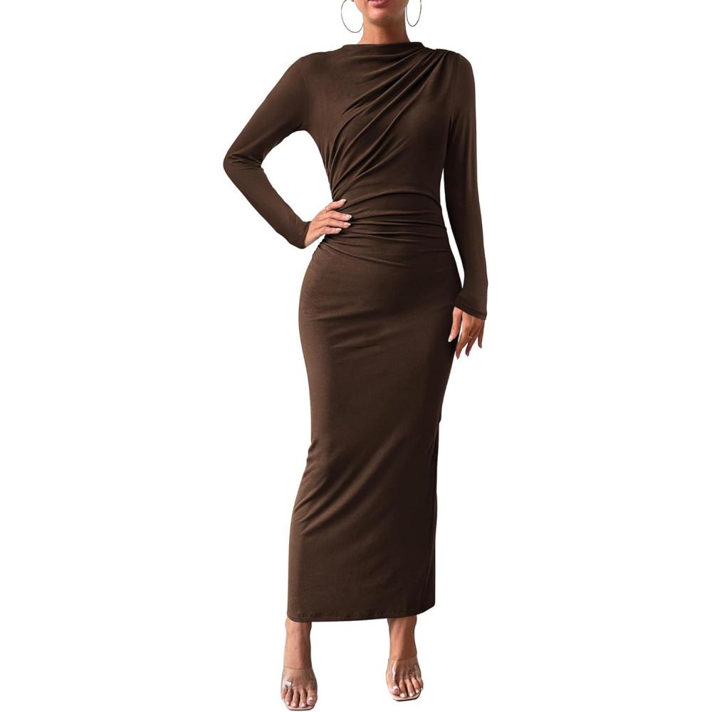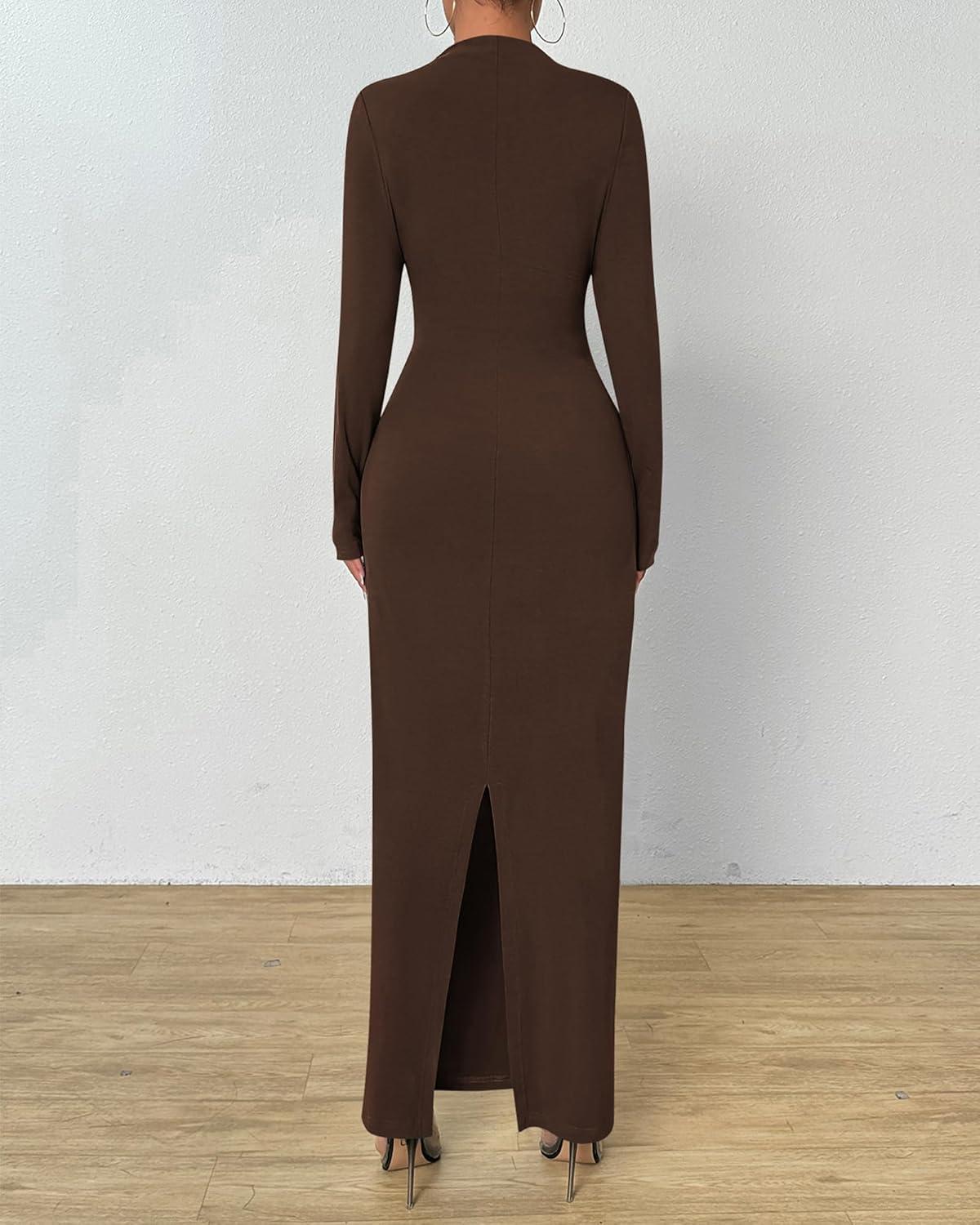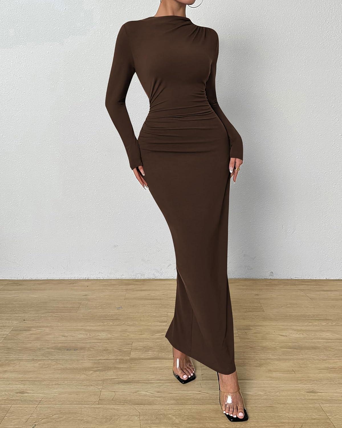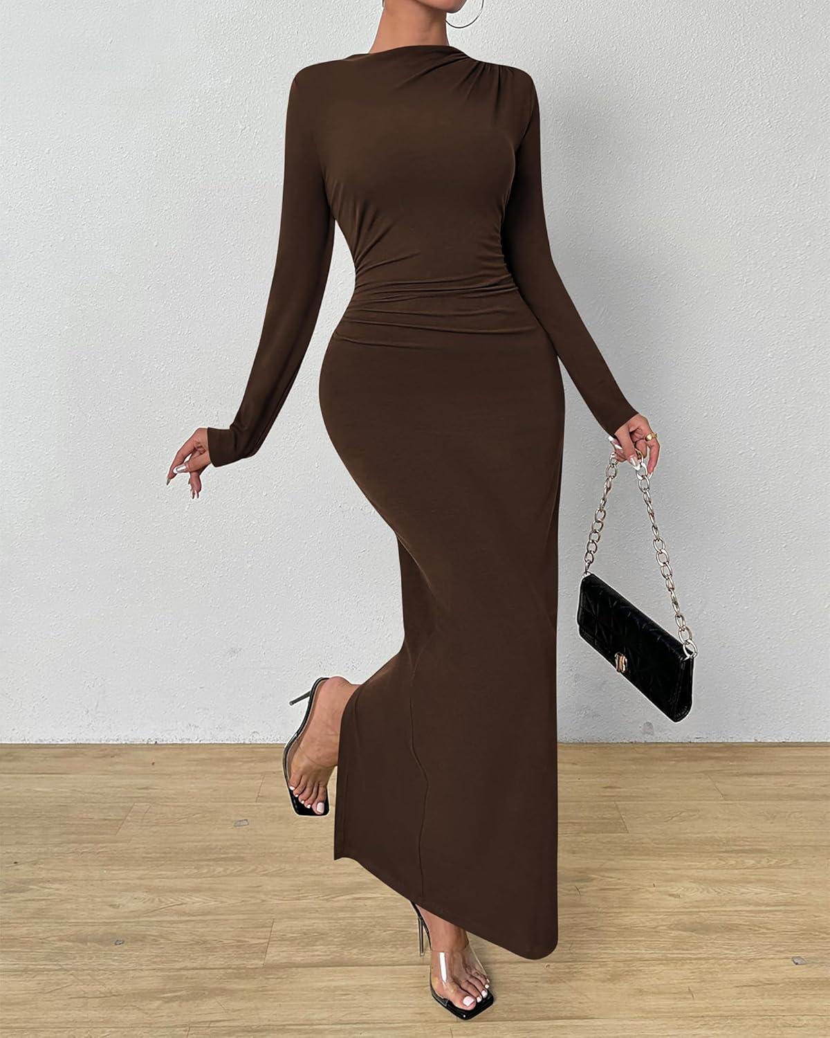 BTFBM Women Bodycon Maxi Dress Long Sleeve Back Slit Ruched Elegant Party Cocktail Formal Fall Wedding Guest Dresses(Brown)