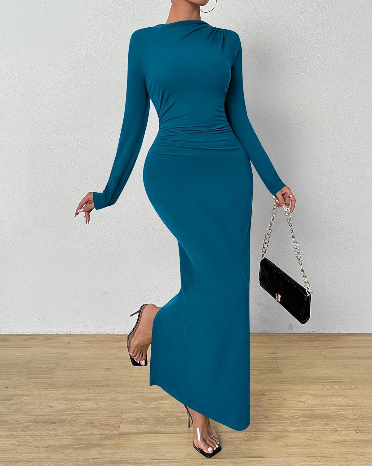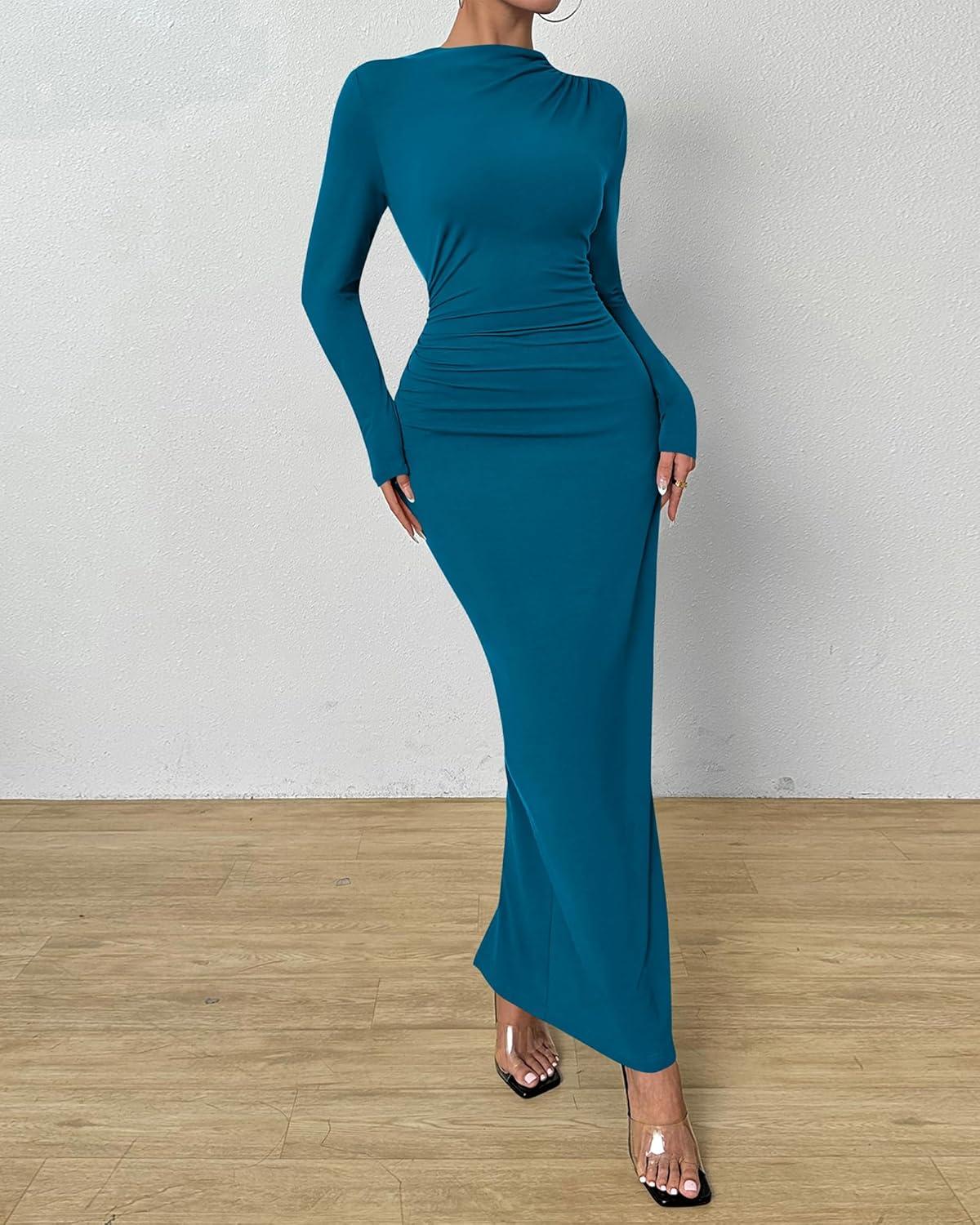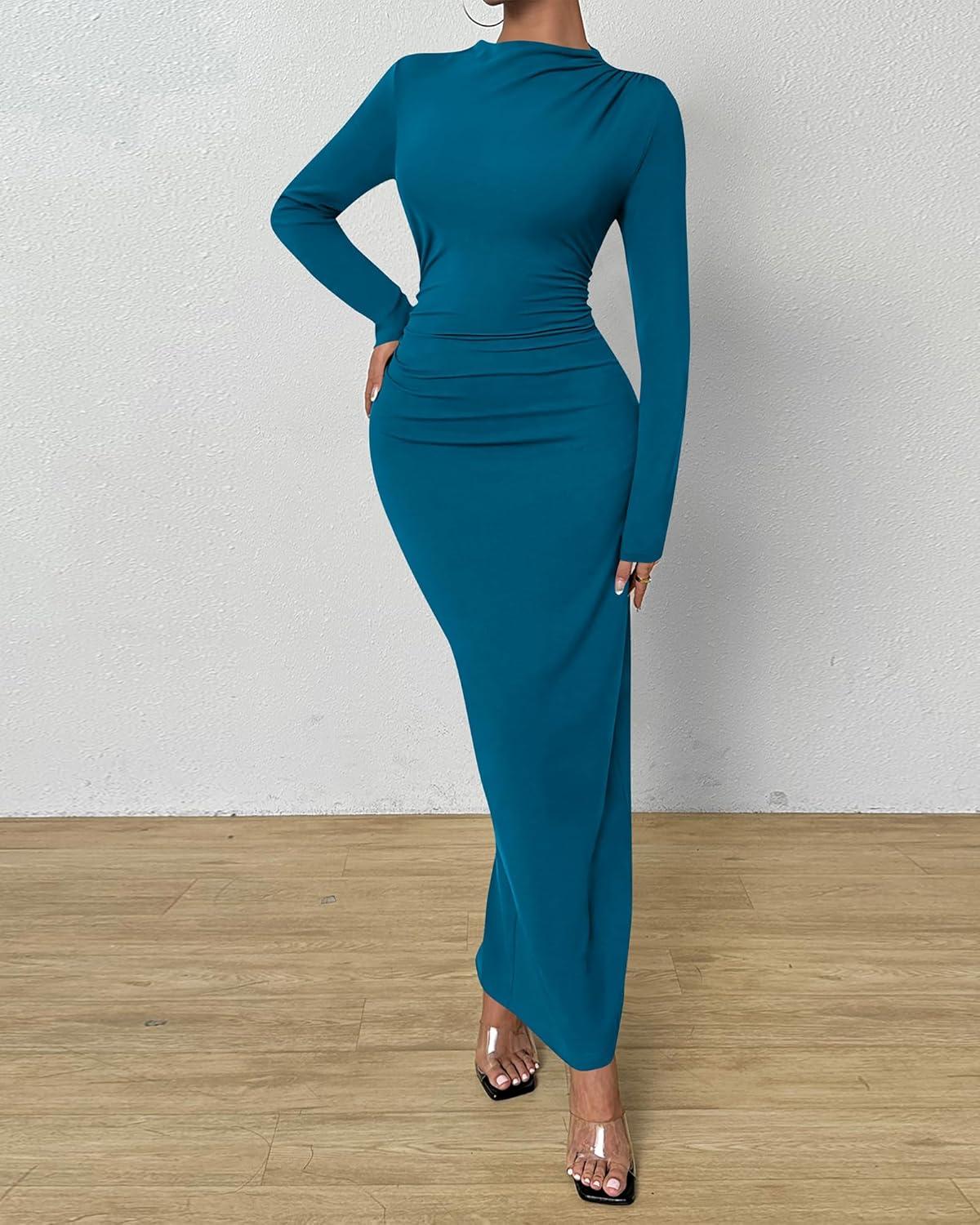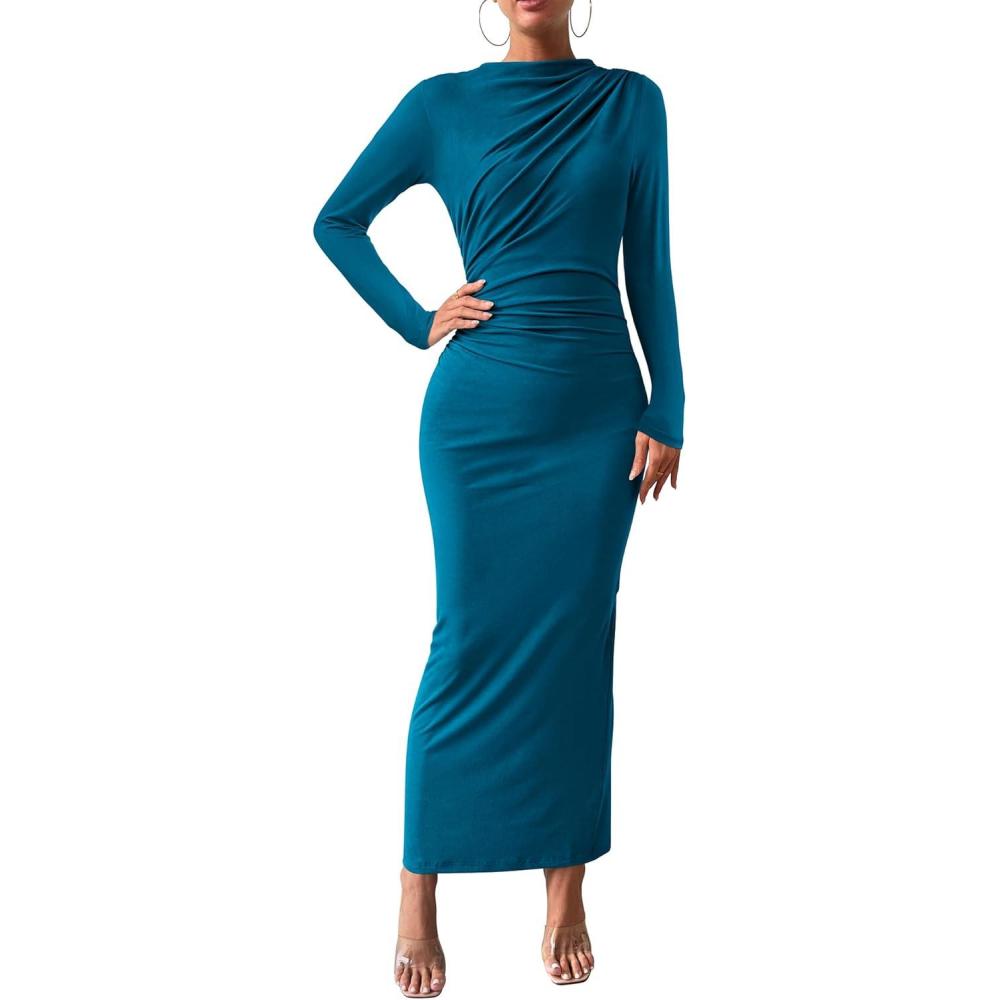 BTFBM Women Bodycon Maxi Dress Long Sleeve Back Slit Ruched Elegant Party Cocktail Formal Fall Wedding Guest Dresses(Lake Blue)