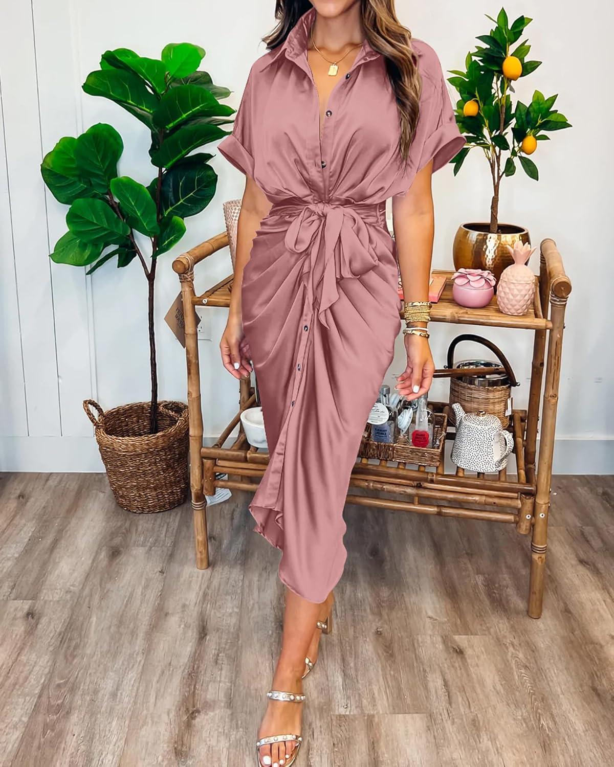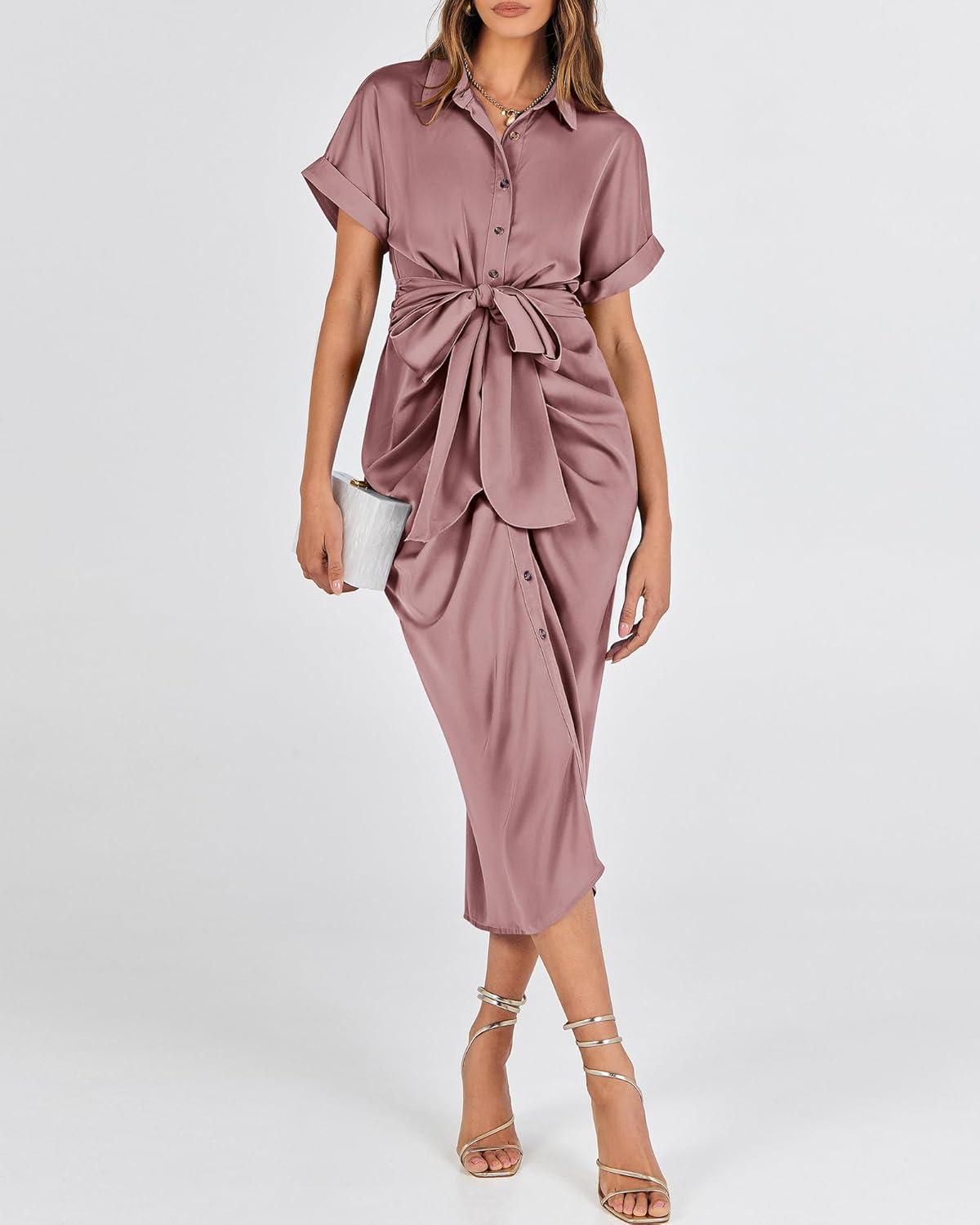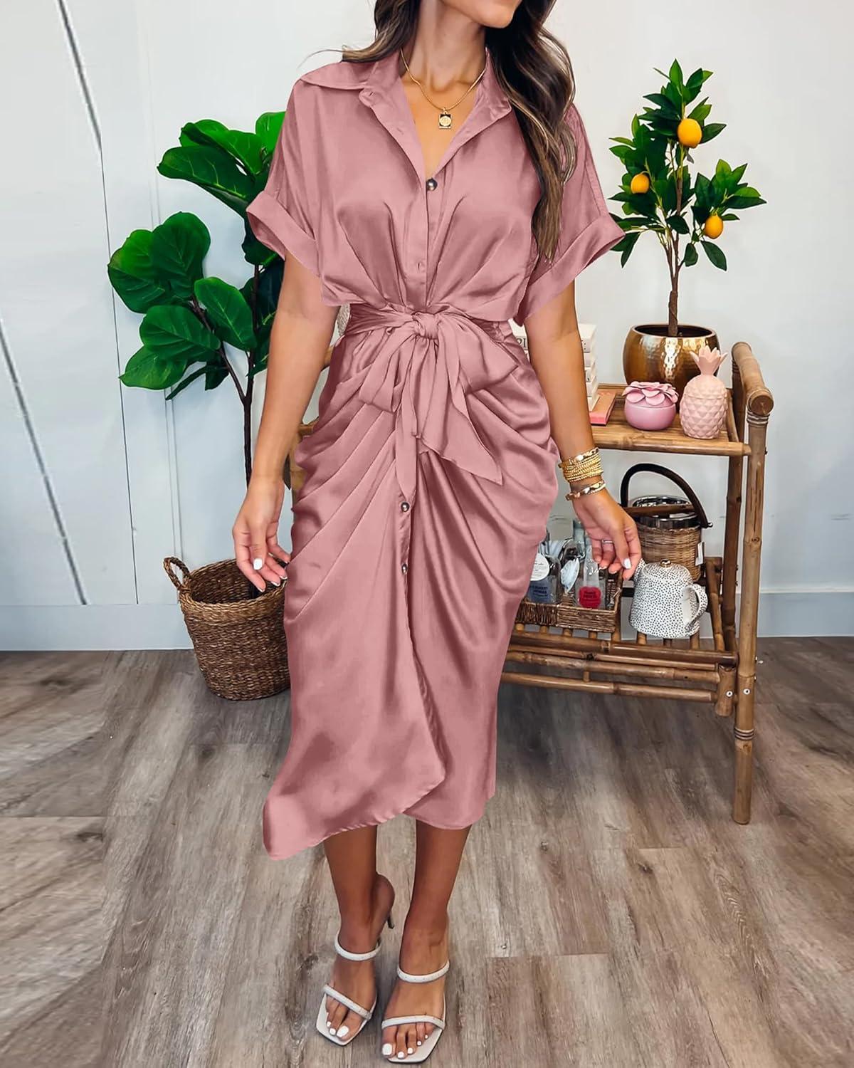 BTFBM Women Button Down Ruched Shirt Dresses Satin Short Sleeve Lapel V Neck Summer Maxi Dress 2025 Party Wedding Guest(Pink)