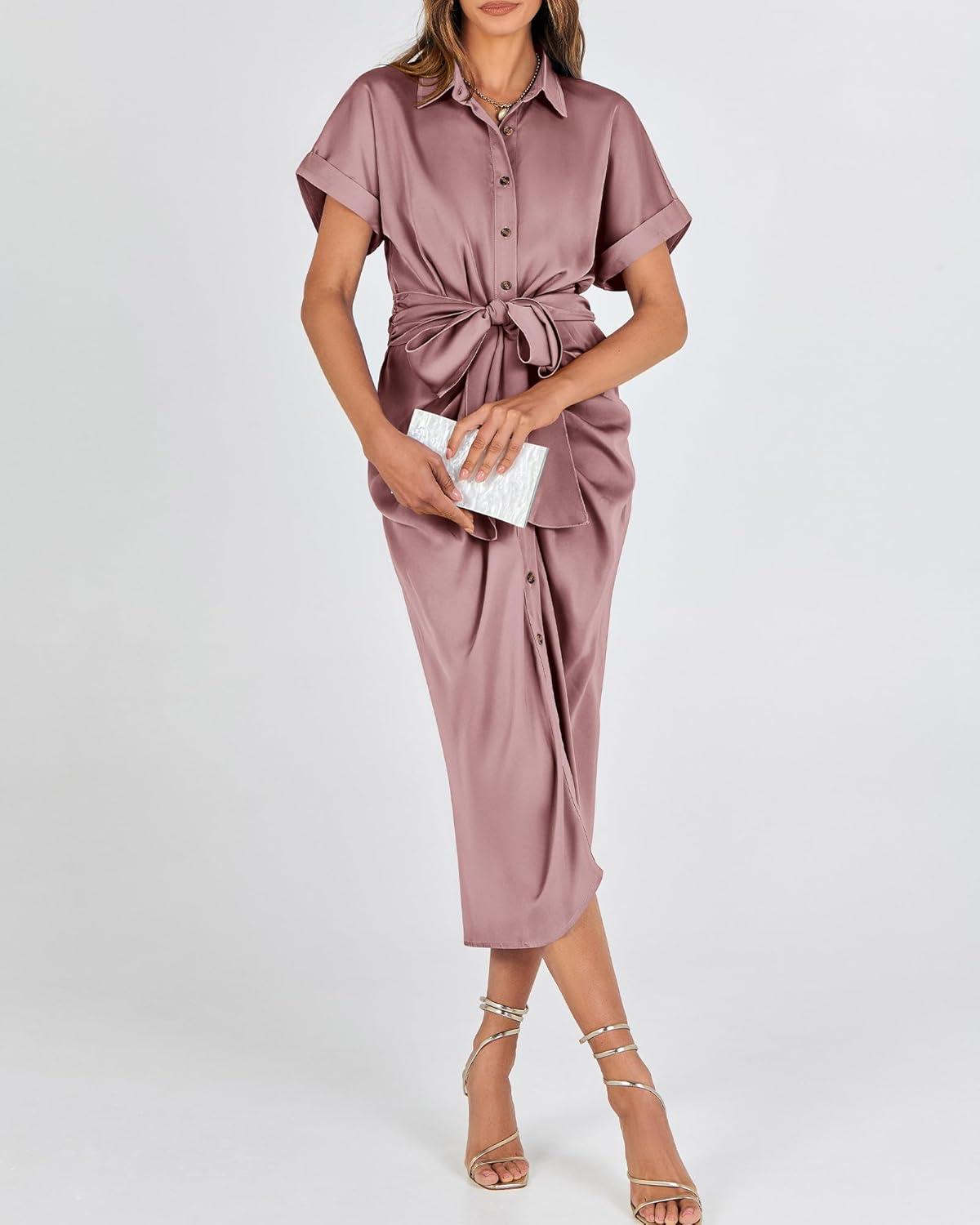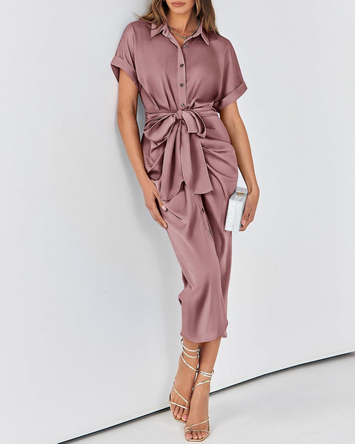 Get up to 50% off on BTFBM Women Button Down Ruched Shirt Dresses Satin Short Sleeve Lapel V Neck Summer Maxi Dress 2025 Party Wedding Guest(Pink) styles during our spring sale event.