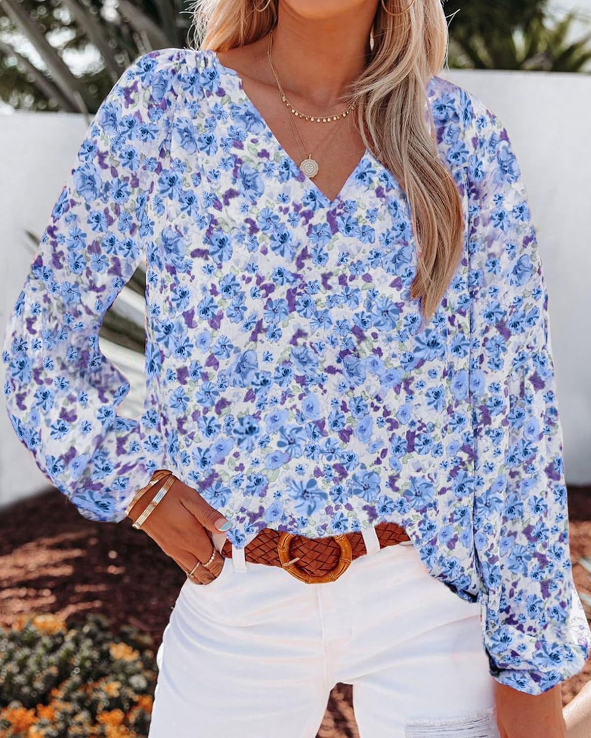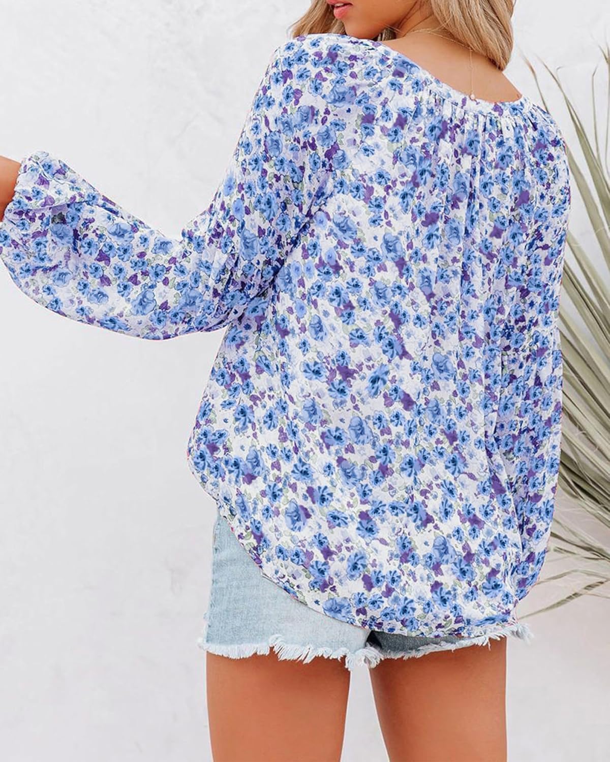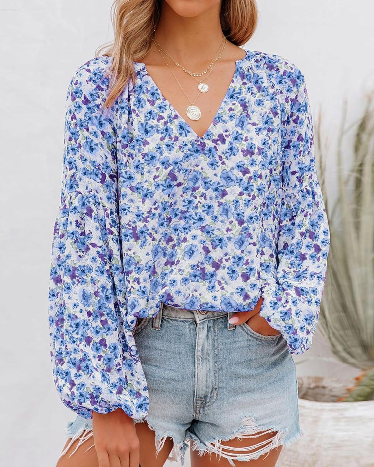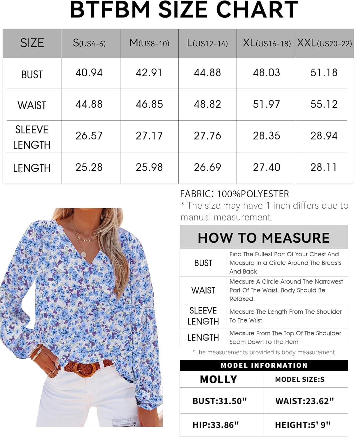 BTFBM Women Casual Boho Blouse Fashion Floral Shirts V Neck Long Puff Sleeve Lightweight Chiffon Summer Fall Tops 2024Floral Dark Blue