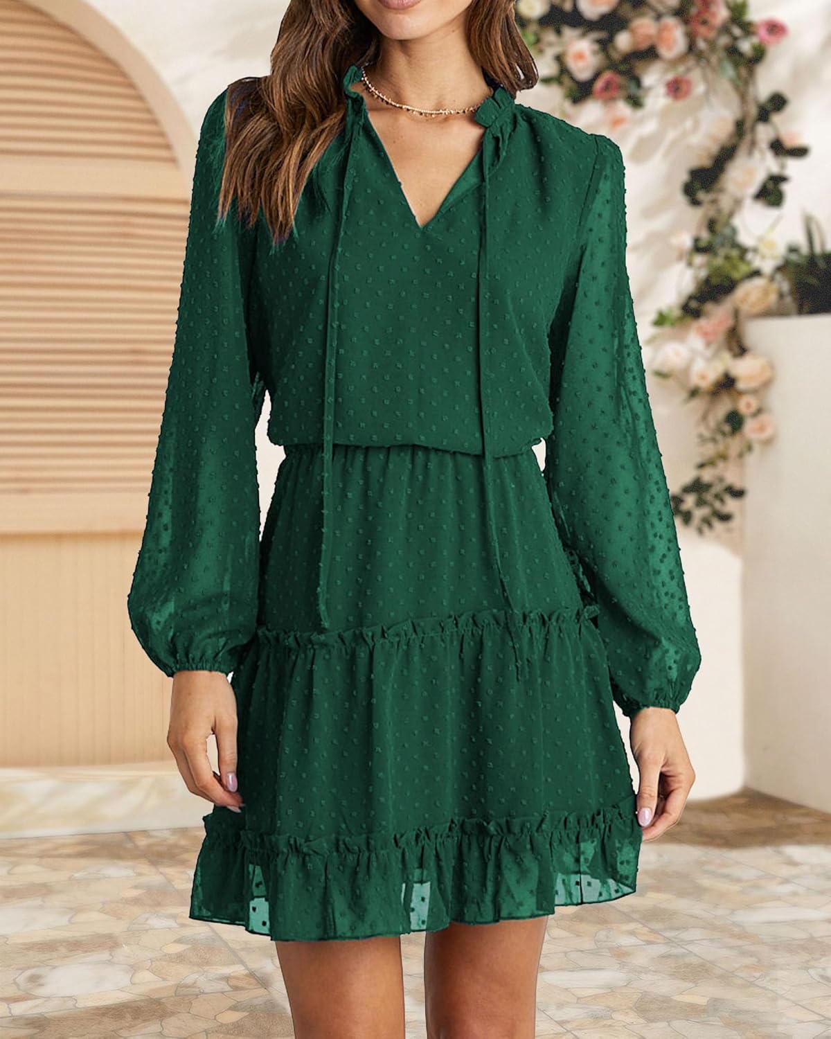 BTFBM Women Casual Summer Fall Dresses Tie V Neck Long Sleeve High Waist Ruffle Tiered A Line Swing Tunic Mini DressDot Green