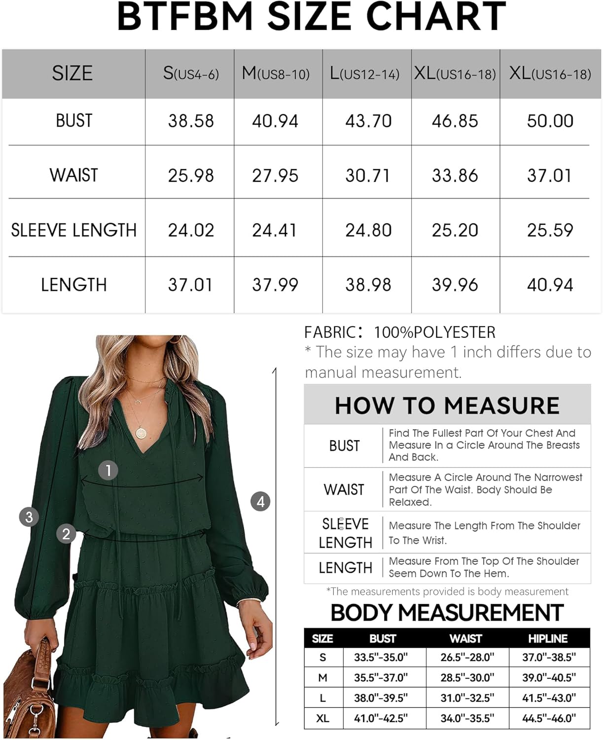 BTFBM Women Casual Summer Fall Dresses Tie V Neck Long Sleeve High Waist Ruffle Tiered A Line Swing Tunic Mini DressDot Dark Green
