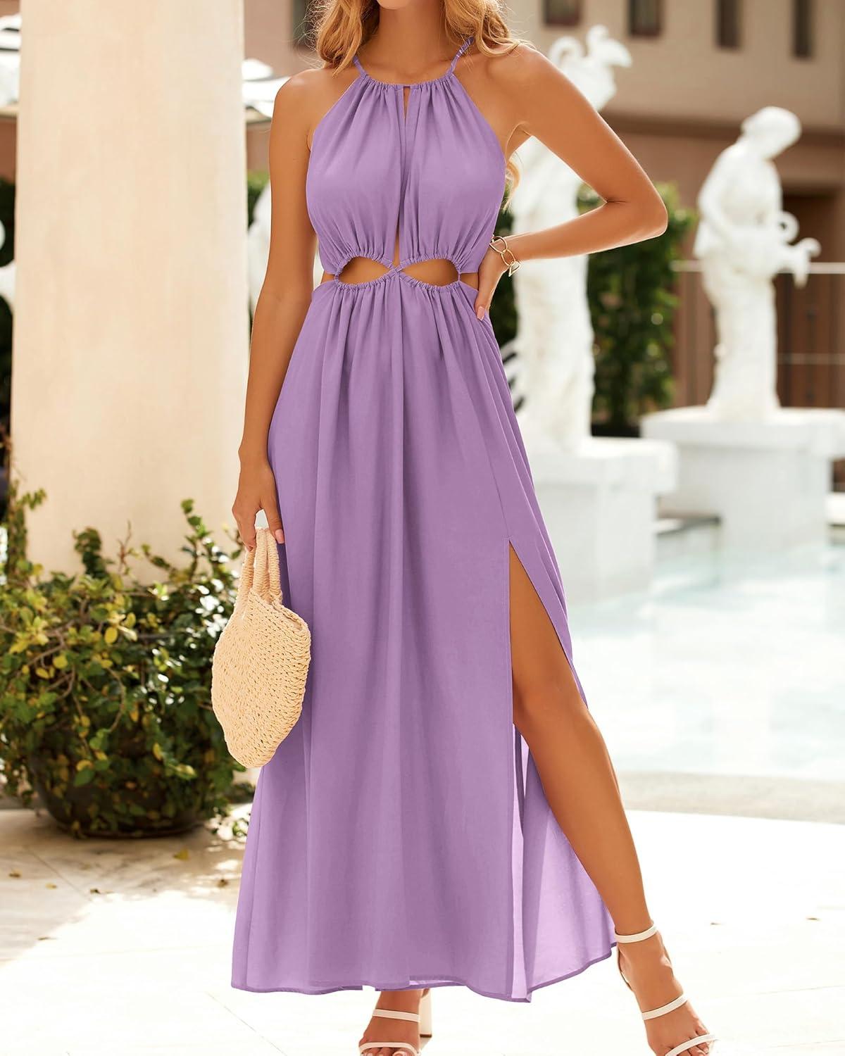 BTFBM Women Halter Summer Dresses 2025 Sleeveless Cutout Backless Sundress Slit Boho Casual Maxi Wedding Beach Dress(Purple)