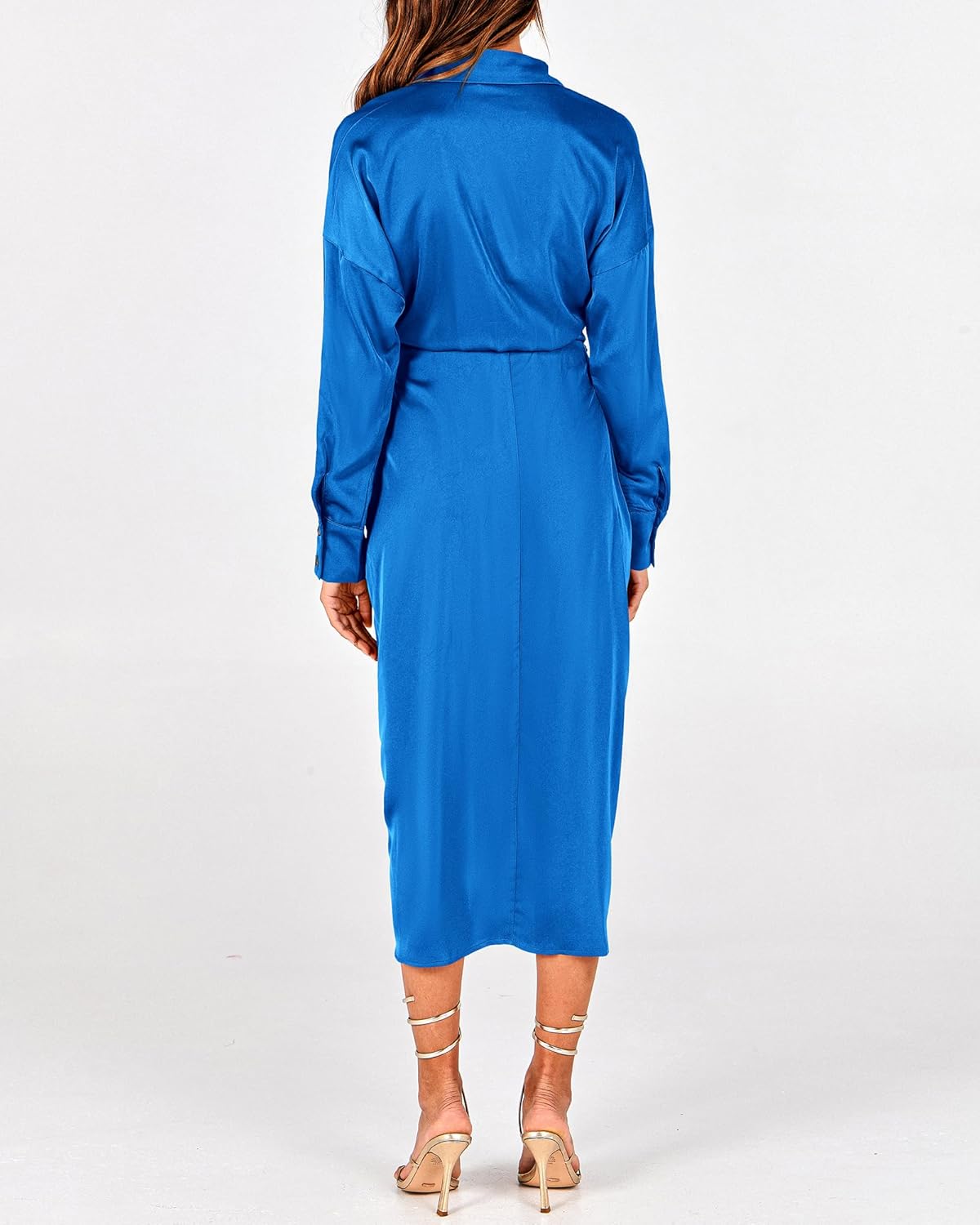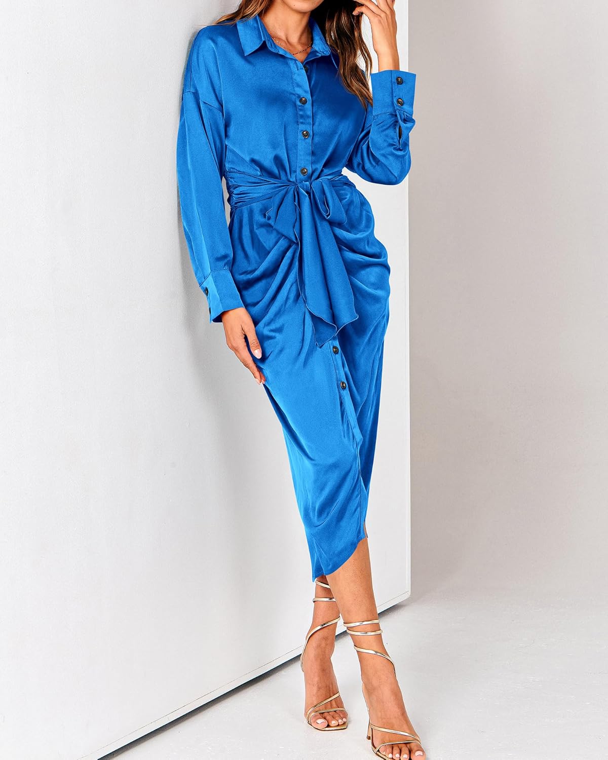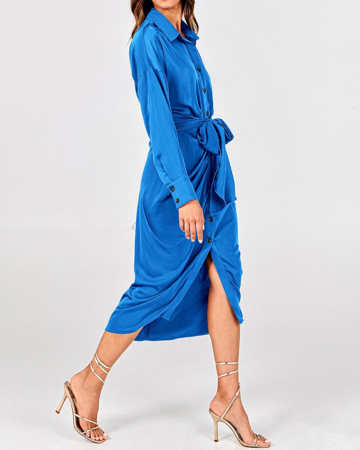 Get up to 50% off on BTFBM Women Long Sleeve Satin Dress 2024 Summer Fall Lapel V Neck Button Down Belted Elegant Ruched Maxi Shirt Dresses(Solid Brilliant Blue) styles during our spring sale event.