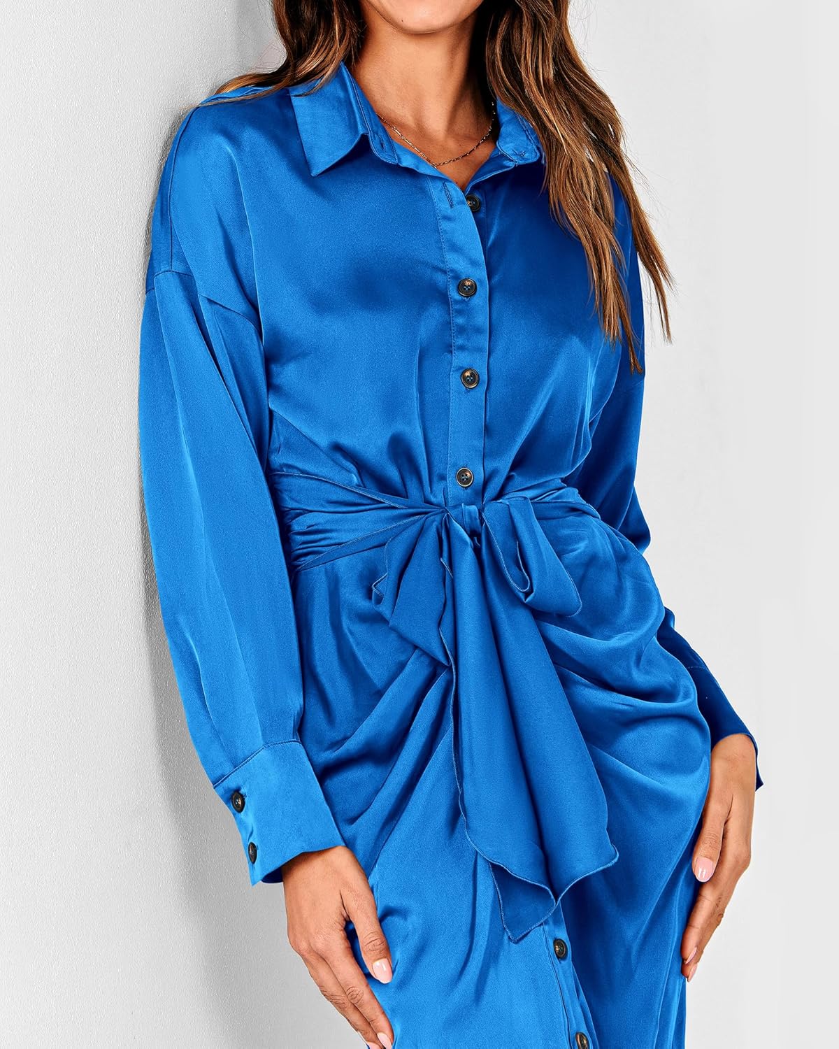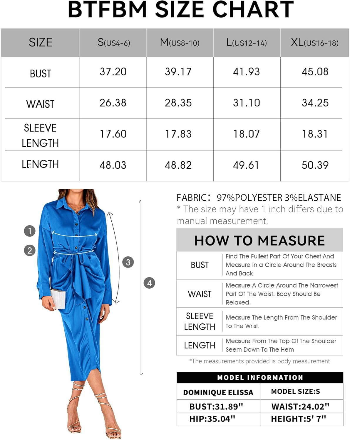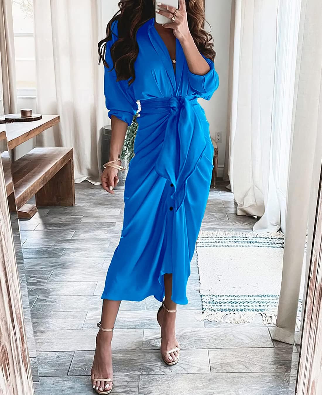 Get up to 50% off on BTFBM Women Long Sleeve Satin Dress 2024 Summer Fall Lapel V Neck Button Down Belted Elegant Ruched Maxi Shirt Dresses(Solid Brilliant Blue) styles during our spring sale event.