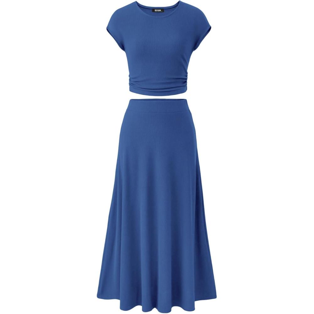 BTFBM Women Two Piece Skirt Set Summer 2025 Casual Vacation Crew Neck Short Sleeve Cropped Top Elastic Waist Midi Skirts(Deep Blue)