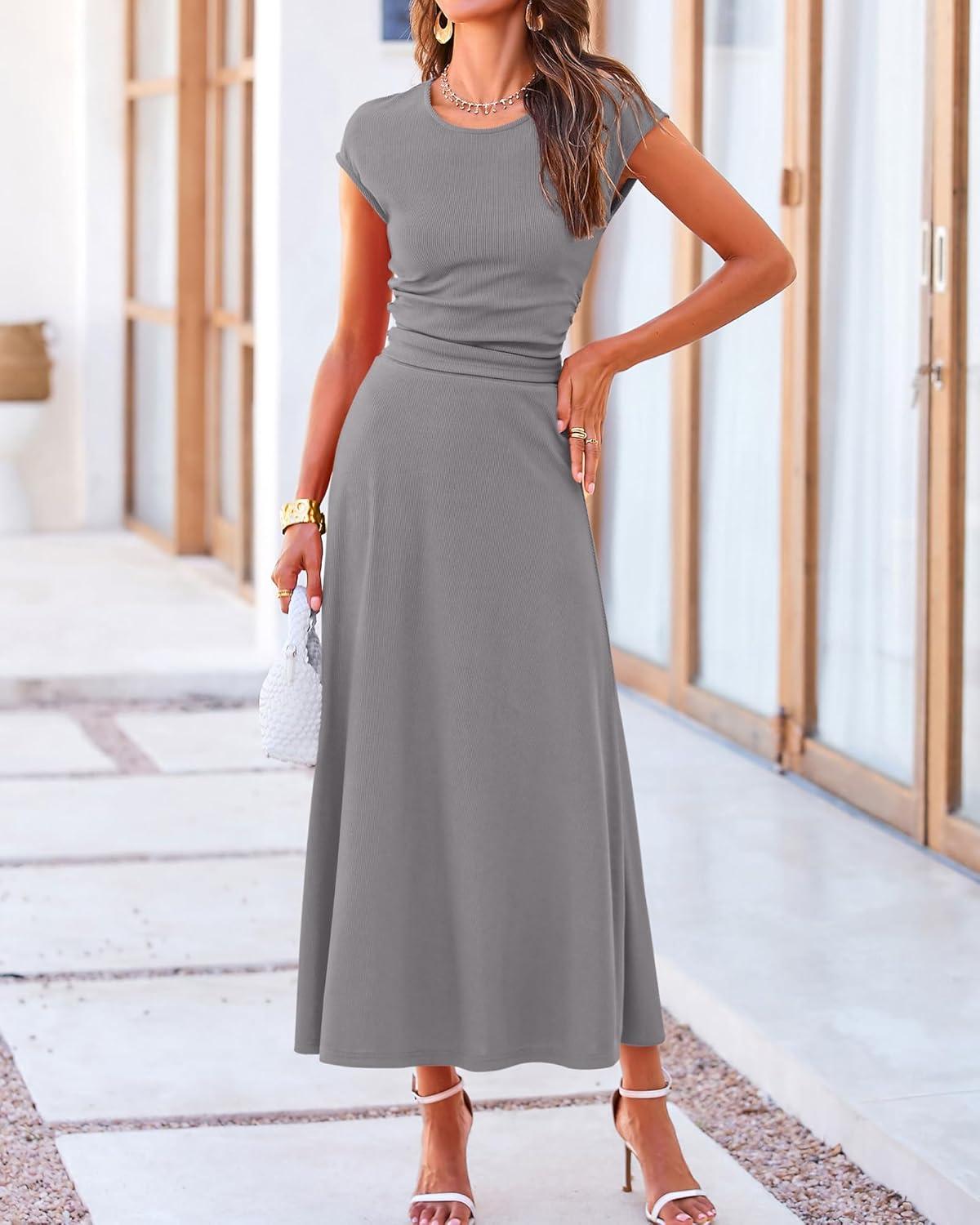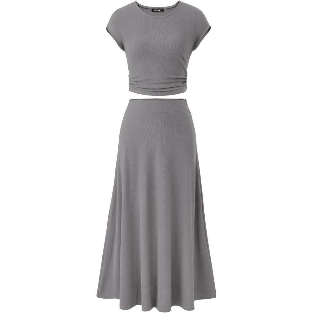 BTFBM Women Two Piece Skirt Set Summer 2025 Casual Vacation Crew Neck Short Sleeve Cropped Top Elastic Waist Midi Skirts(Grey)