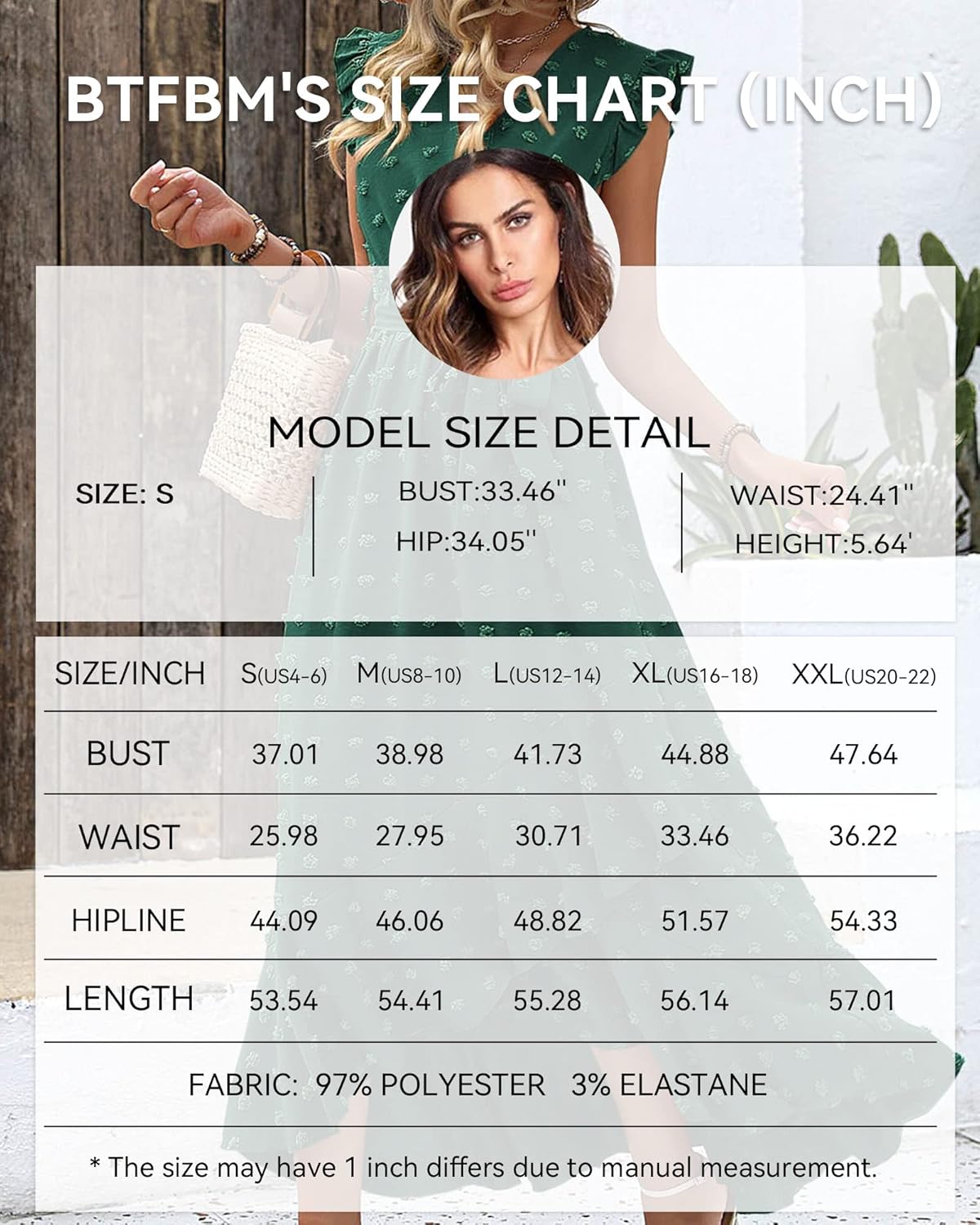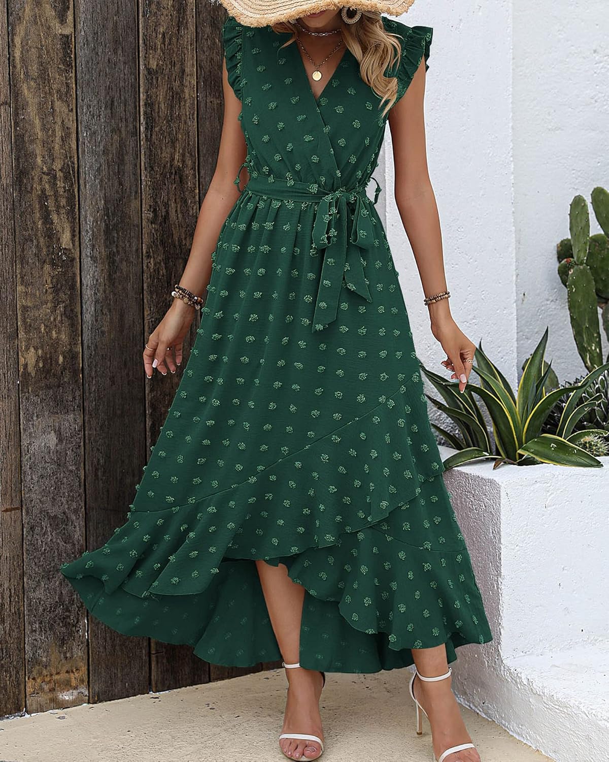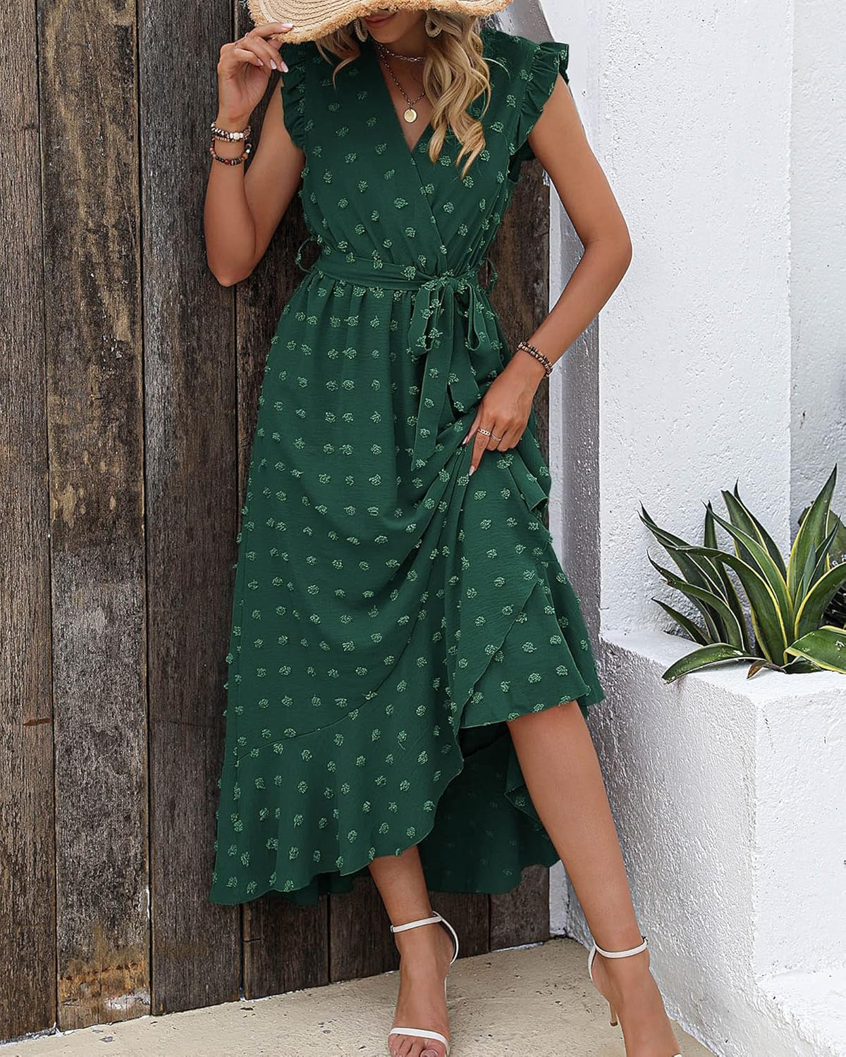 BTFBM Womens 2024 Summer Wrap V Neck Dress Ruffle Sleeve Swiss Dot Boho Ruffle Slit Beach Party Flowy Long Maxi DressesSwiss Dot Dark Green