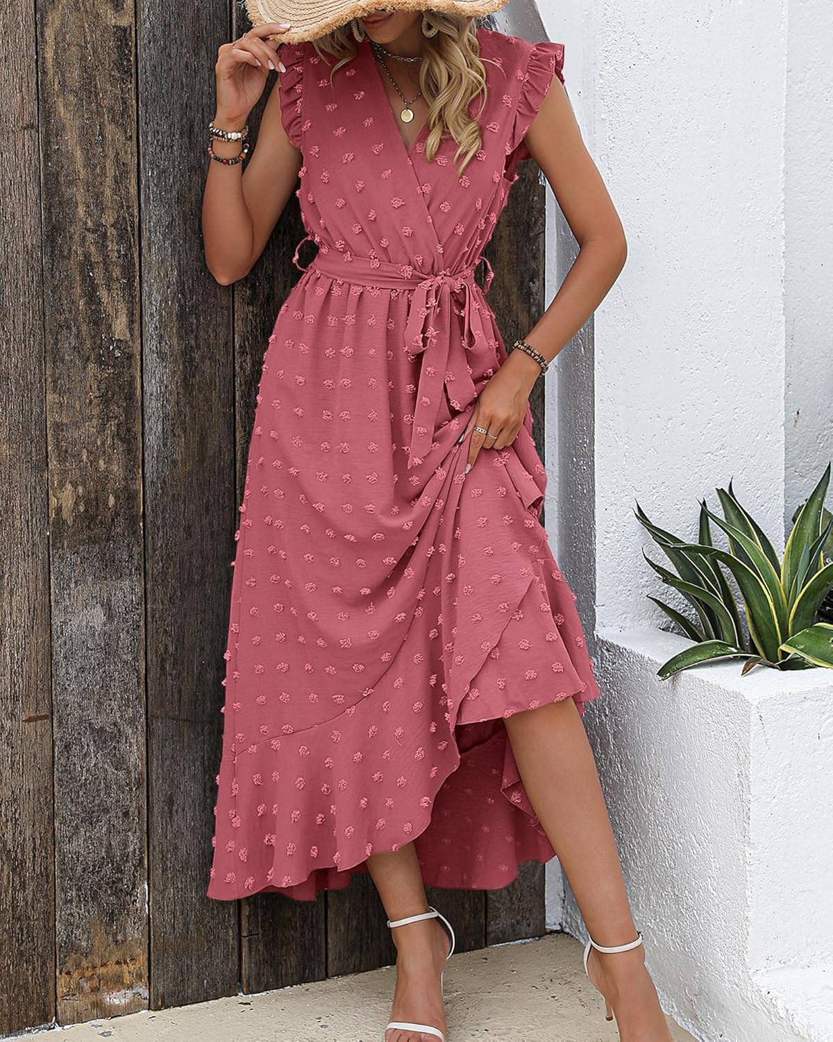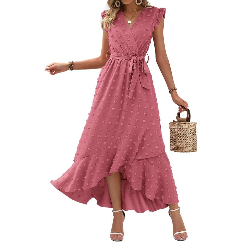 Get up to 50% off on BTFBM Women’s 2024 Summer Wrap V Neck Dress Ruffle Sleeve Swiss Dot Boho Ruffle Slit Beach Party Flowy Long Maxi Dresses(Swiss Dot Pink) styles during our spring sale event.