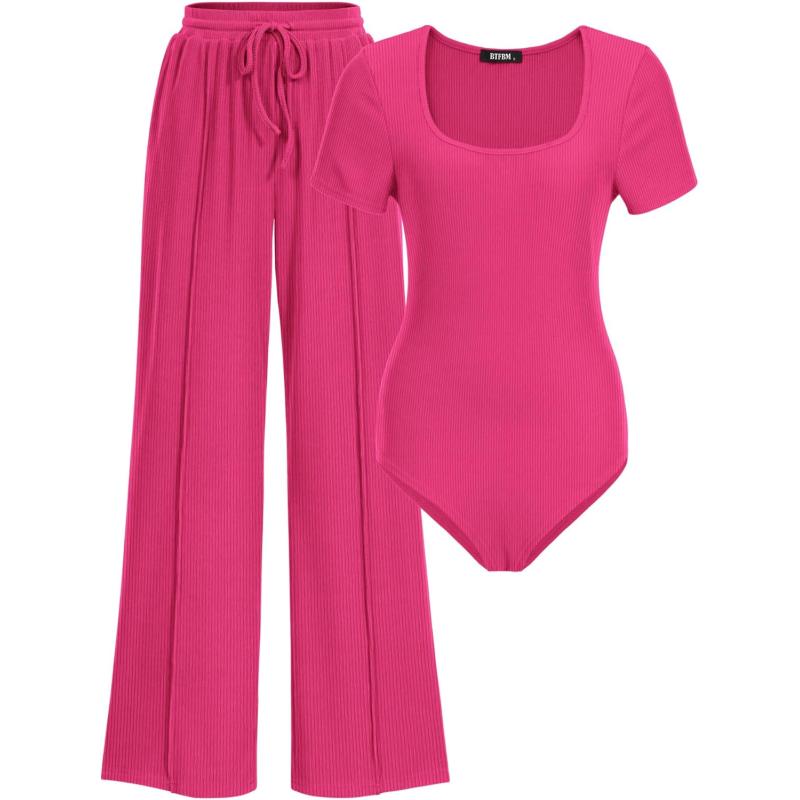 BTFBM Womens Casual 2 Pieces Outfits Square Neck Short Sleeve Shapewear Bodysuit Drawstring Pants Knit Matching SetsSolid Rose Red