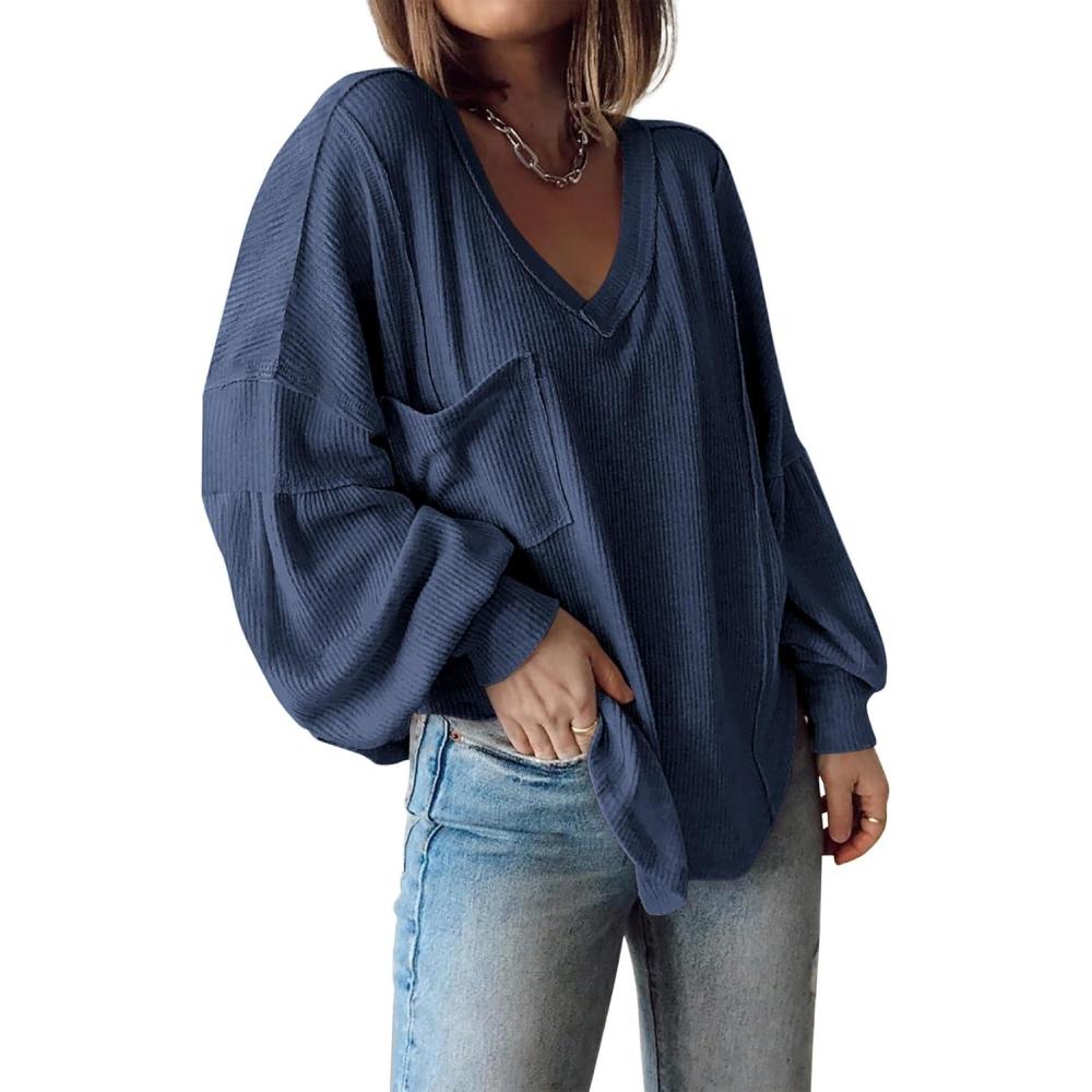 BTFBM Womens Fall Fashion 2025 Long Sleeve Shirts Casual V Neck Ribbed Knit Blouses Pullover Trendy Loose Fit Tunic Tops(Solid Blue)