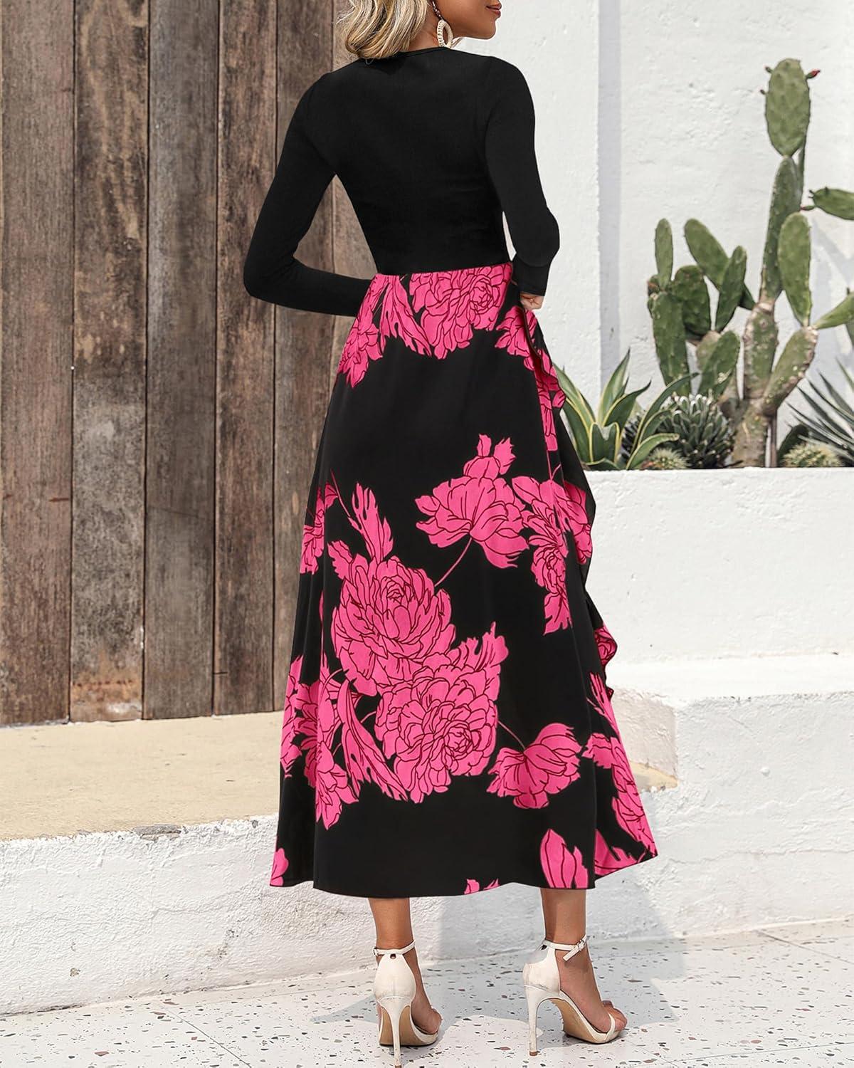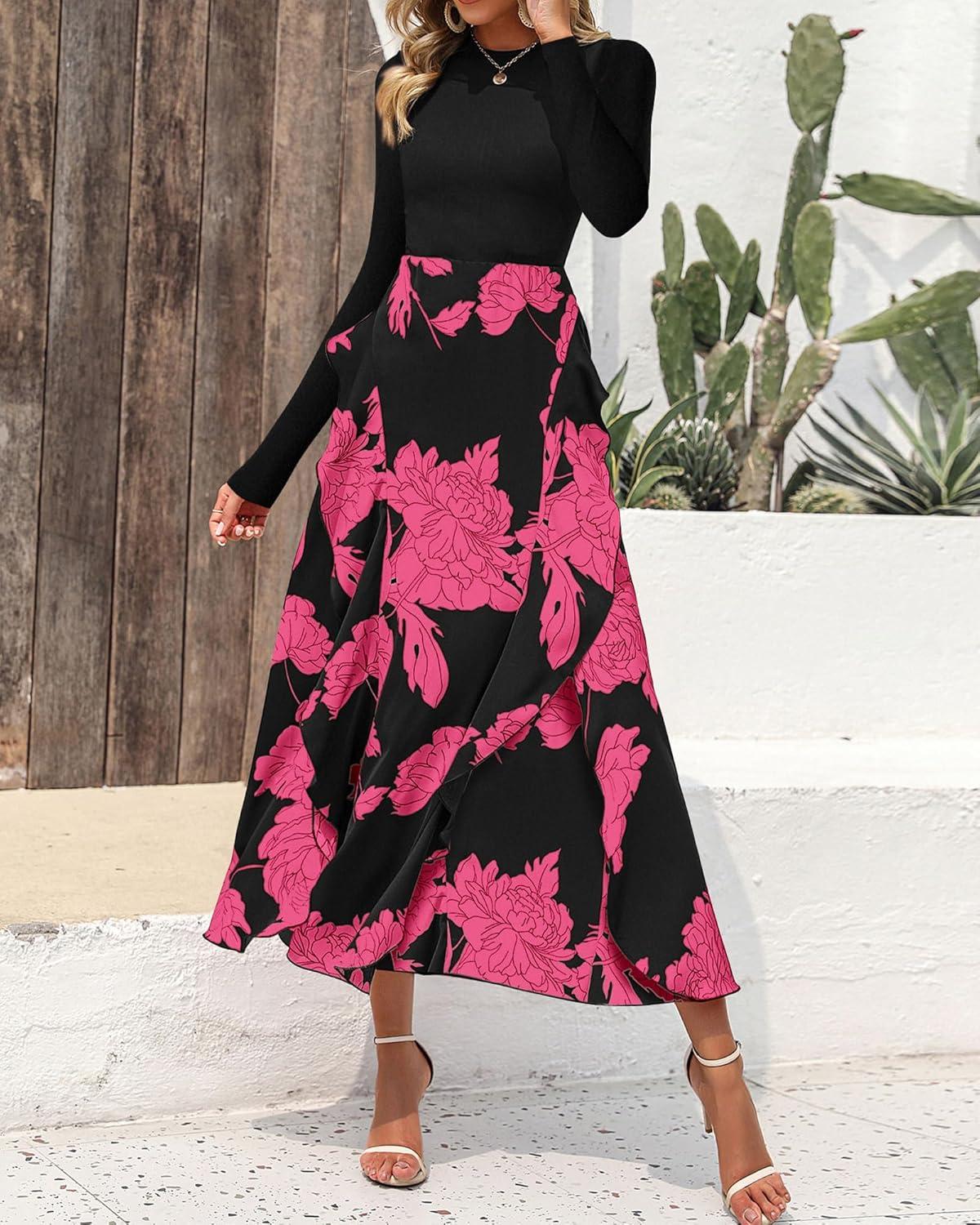 BTFBM Womens Floral Maxi Dress Fall Summer Casual Crewneck Long Sleeve Ruffle Flowy Cocktail Wedding Guest Dresses(Big Floral Rose Red)
