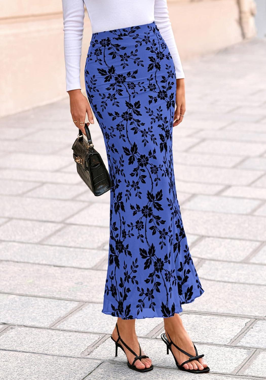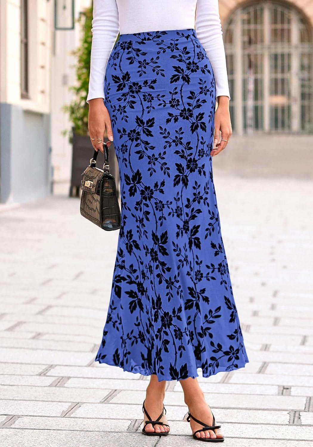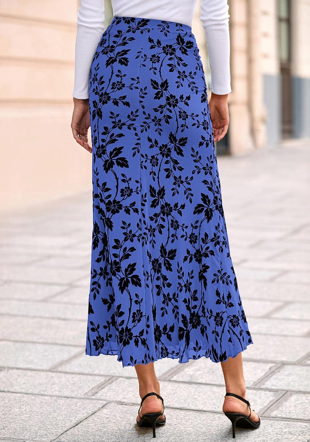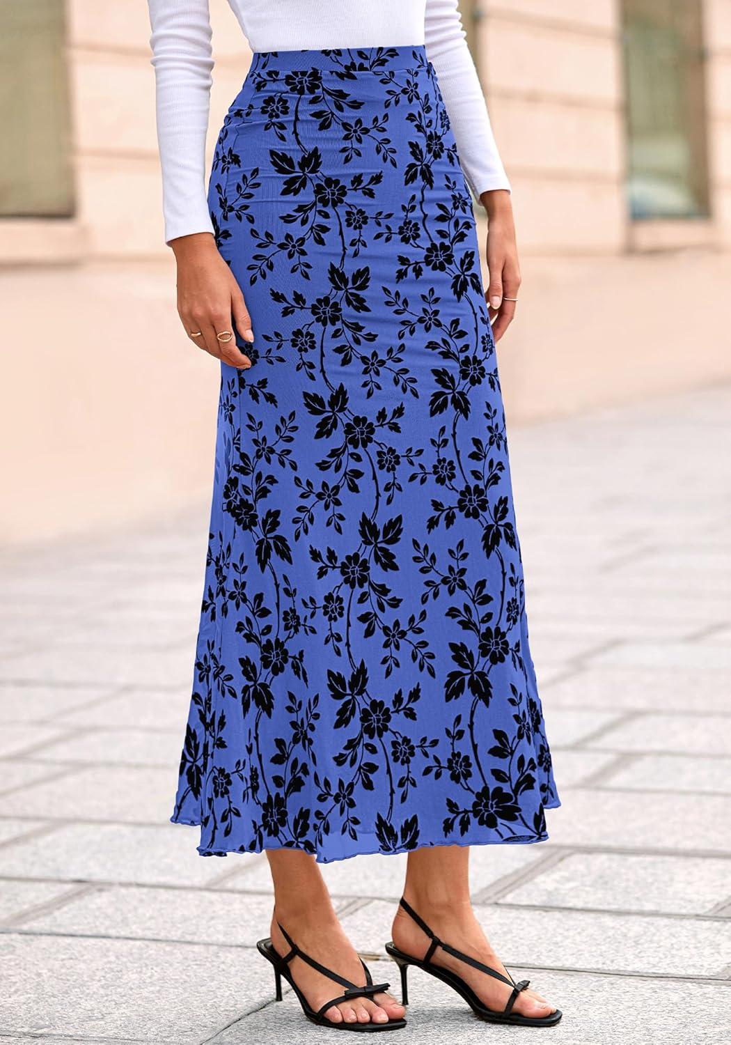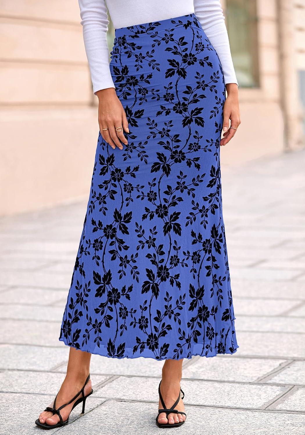 BTFBM Womens Floral Mesh Maxi Skirt Elastic High Waisted Boho Elegant Mermaid 2025 Summer Fall Long Skirts for Women(Royal Blue)