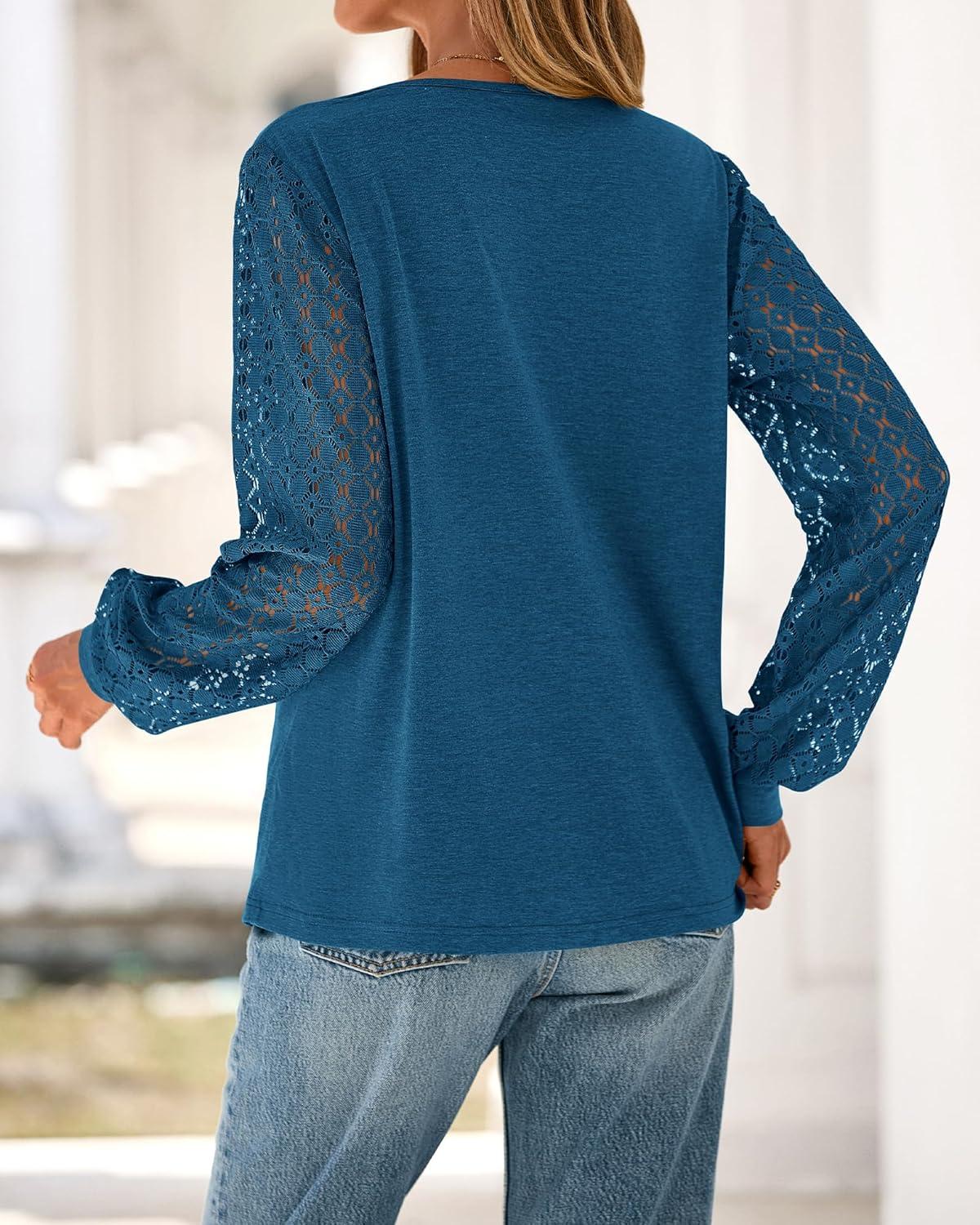 BTFBM Women’s Long Sleeve Shirts Dressy Lace Fall Tops 2025 Trendy Business Casual T-Shirts Cute Work Outfits Blouses(Dark Lake Blue)