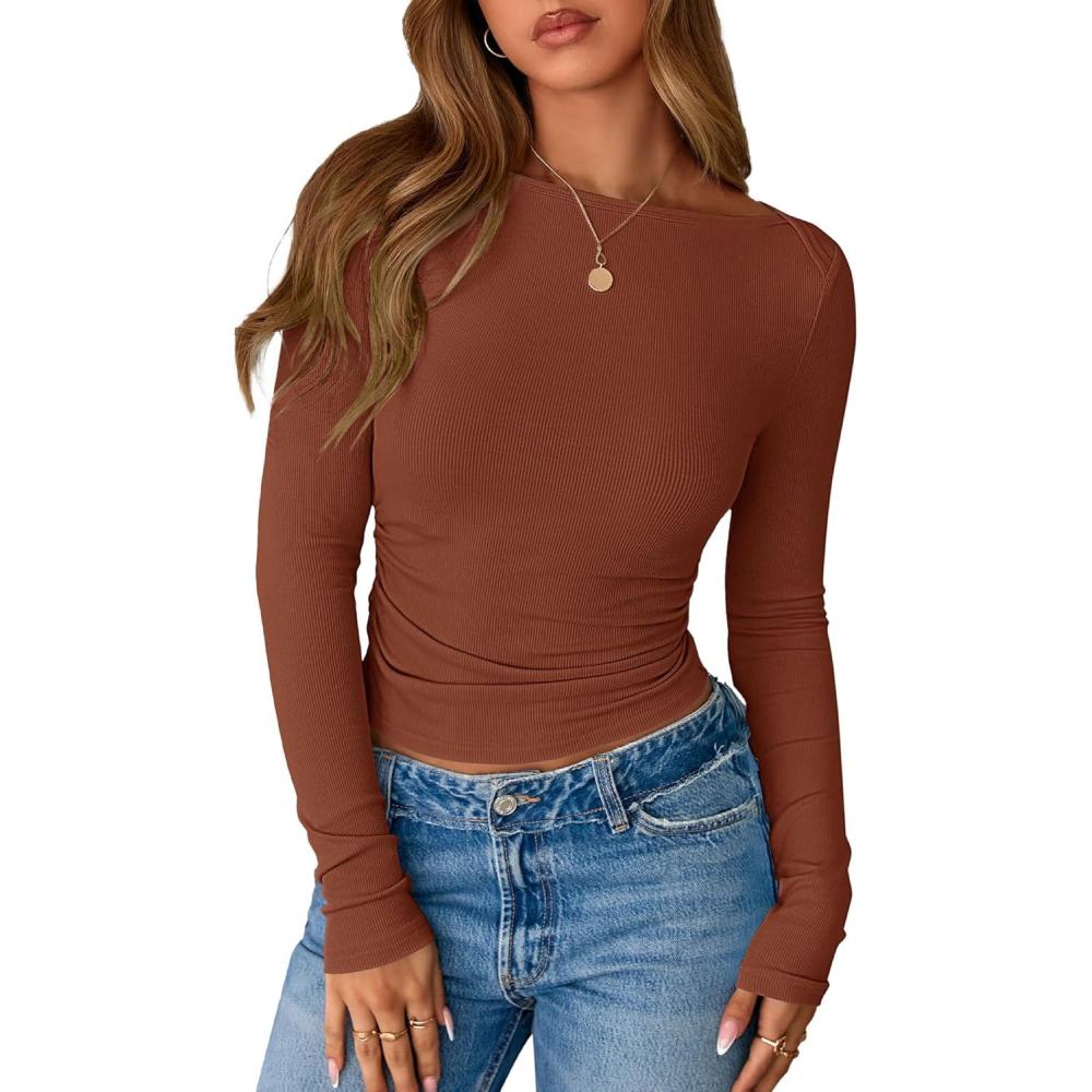 BTFBM Womens Long Sleeve T Shirts Fall Clothes 2025 Ribbed Slim Fit Y2K Boat Neck Casual Going Out Tops Workout Outfits(Brown)