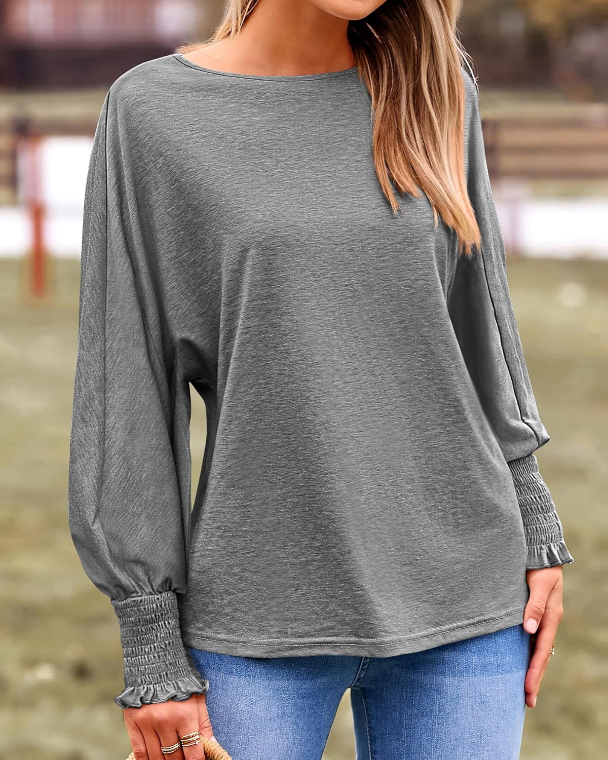 BTFBM Womens Long Sleeve Tops Fall Outfits 2024 Dressy Casual Crew Neck Tee Shirts Smocked Loose Top Tunic Blouse(Solid Grey)
