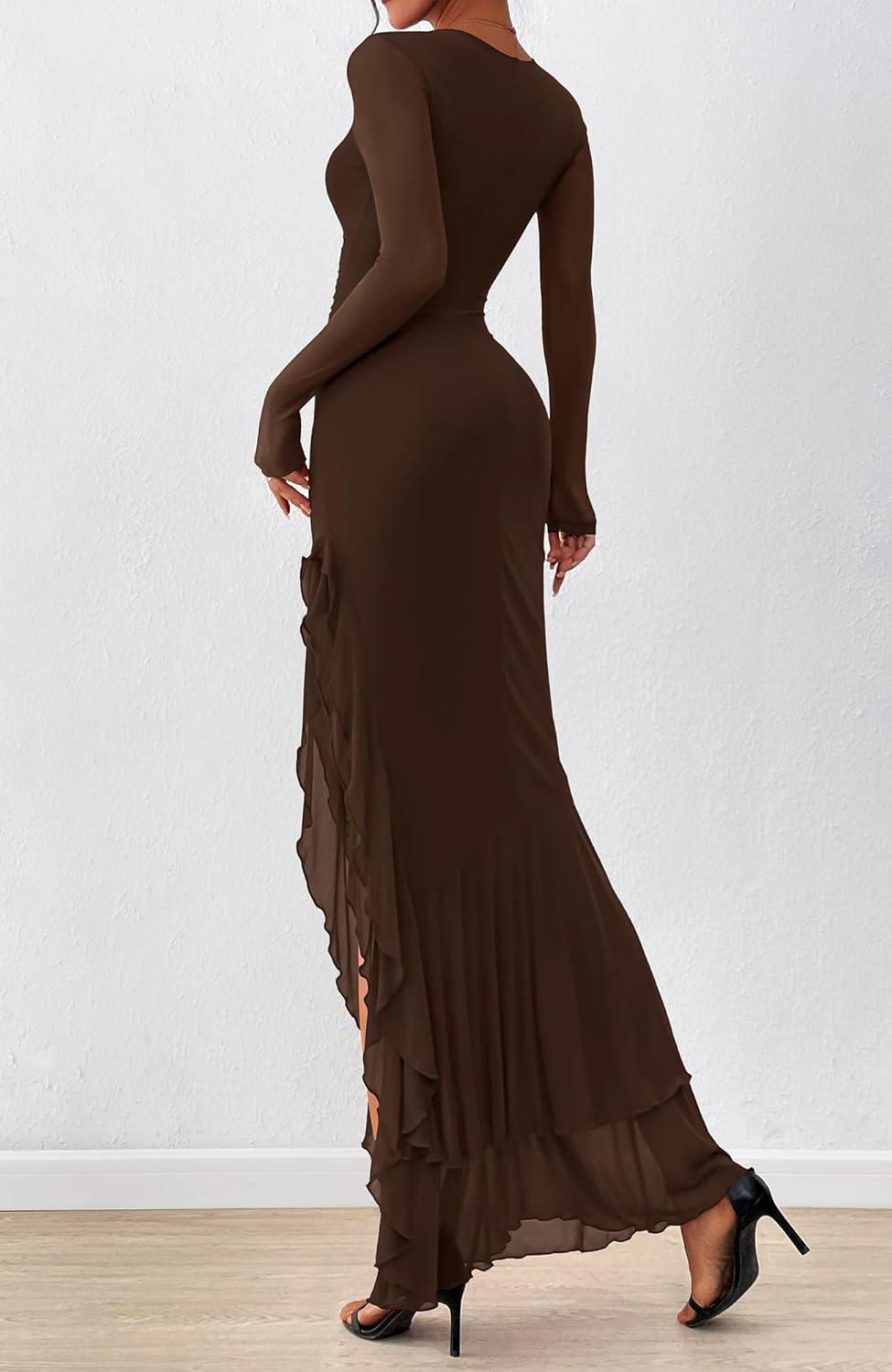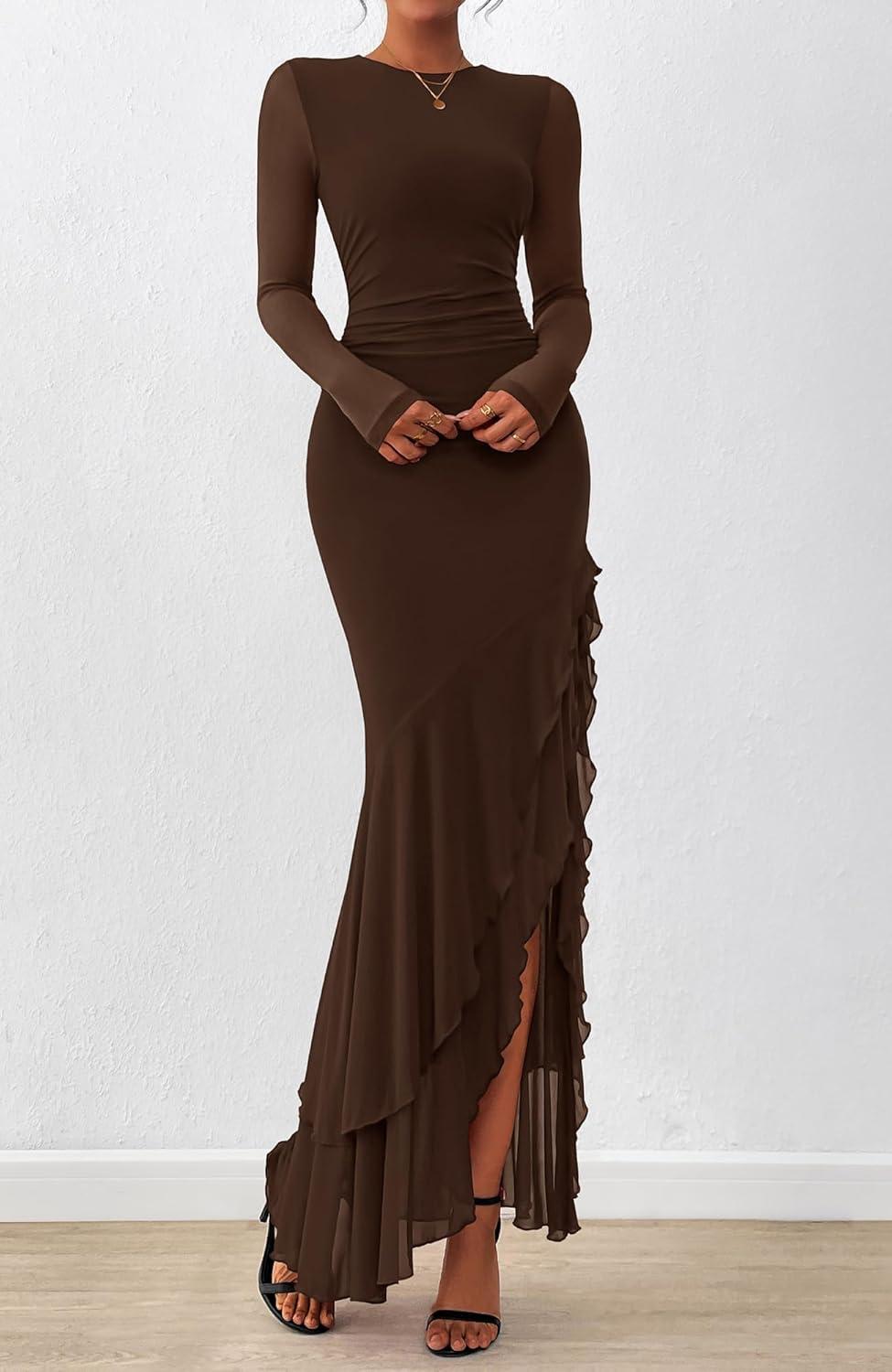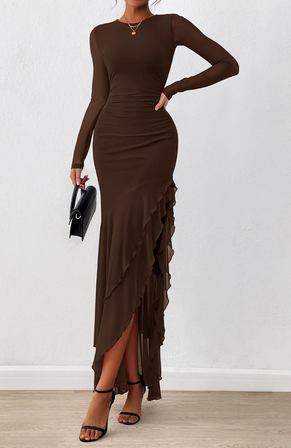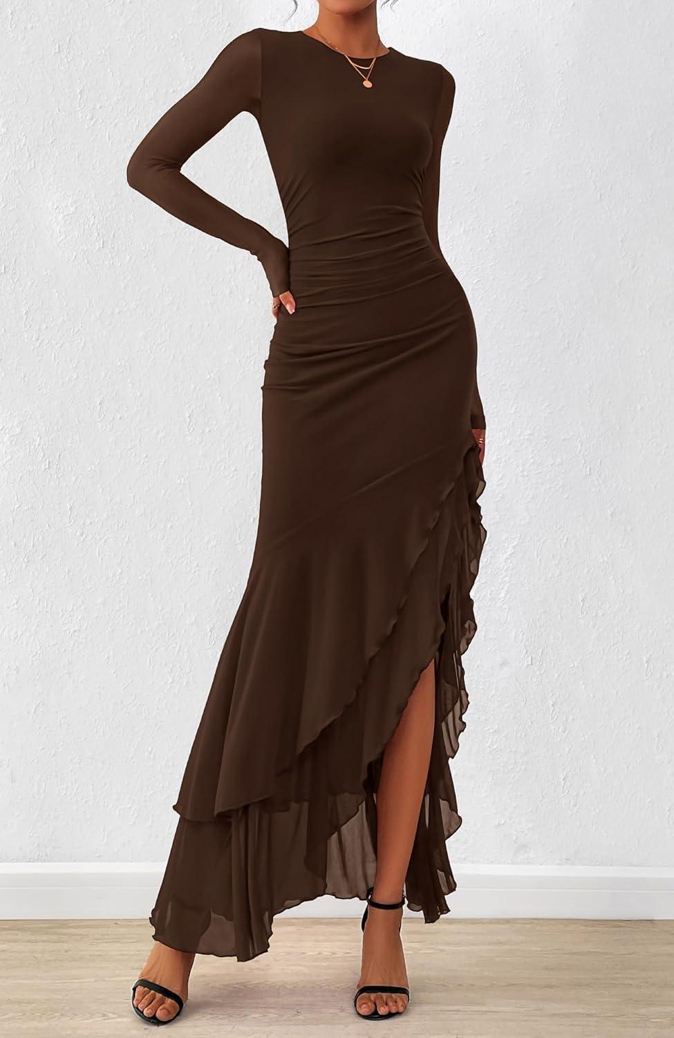 BTFBM Women’s Maxi Dresses Fall 2025 Long Sleeve Ruched Bodycon Solid Ruffle Mermaid Cocktail Wedding Guest Dress(Coffee)