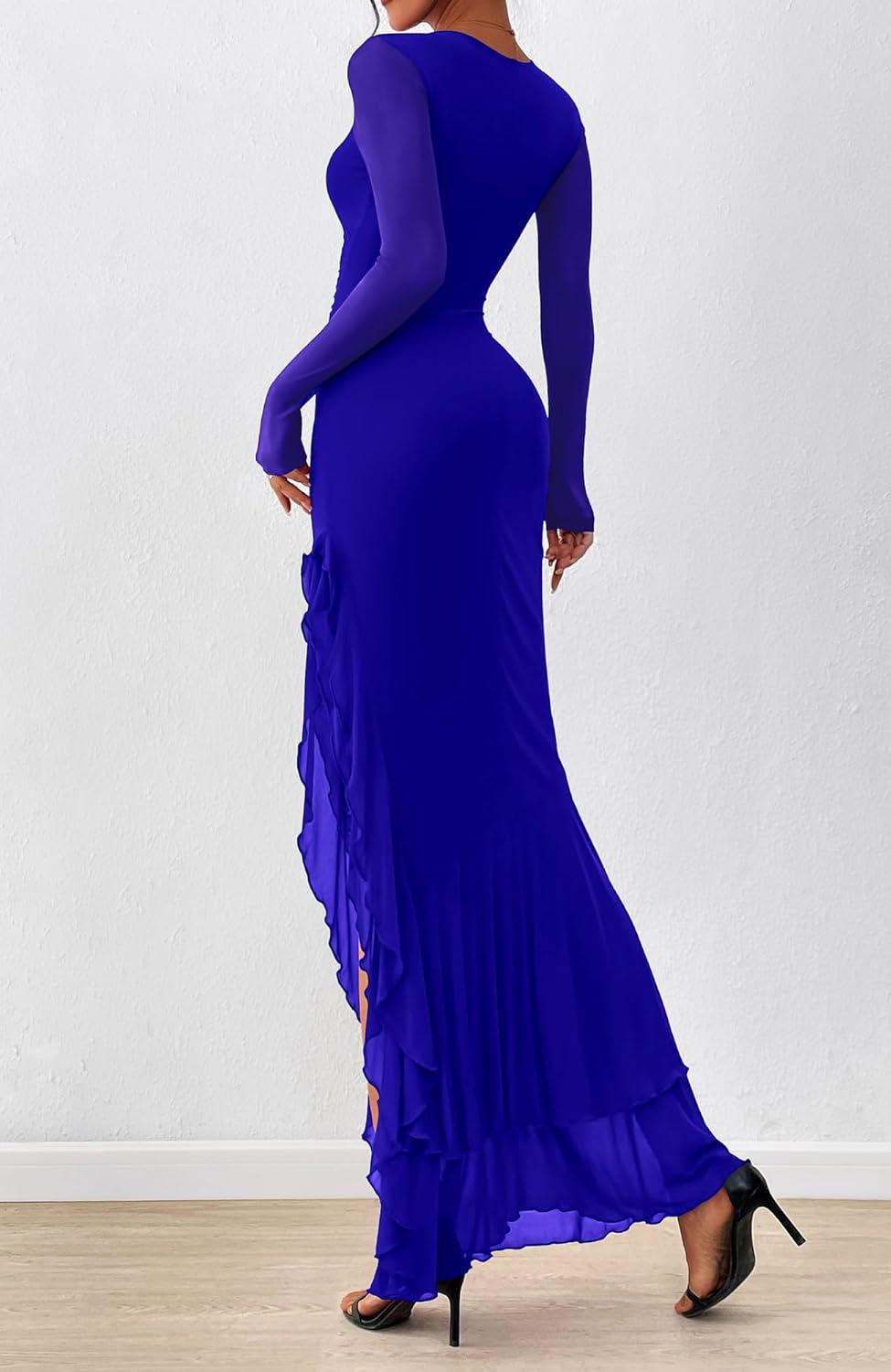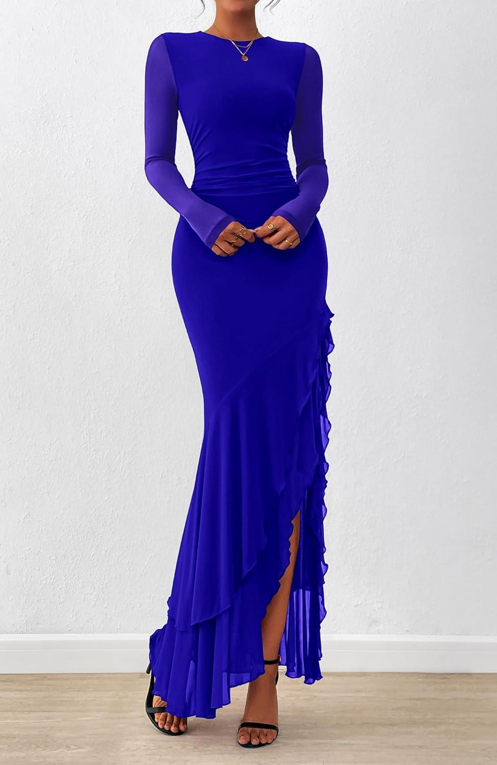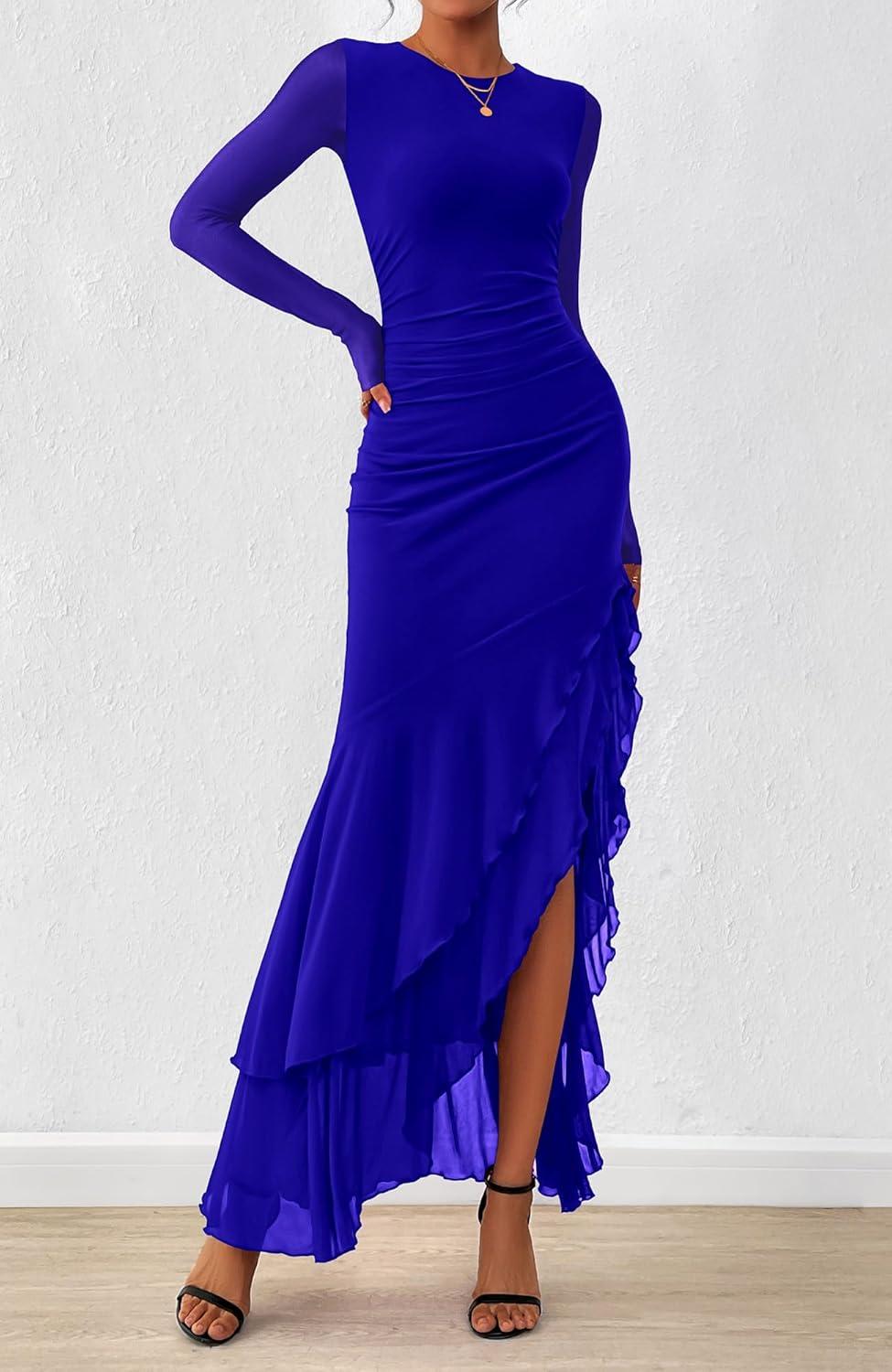 BTFBM Women’s Maxi Dresses Fall 2025 Long Sleeve Ruched Bodycon Solid Ruffle Mermaid Cocktail Wedding Guest Dress(Royal Blue)