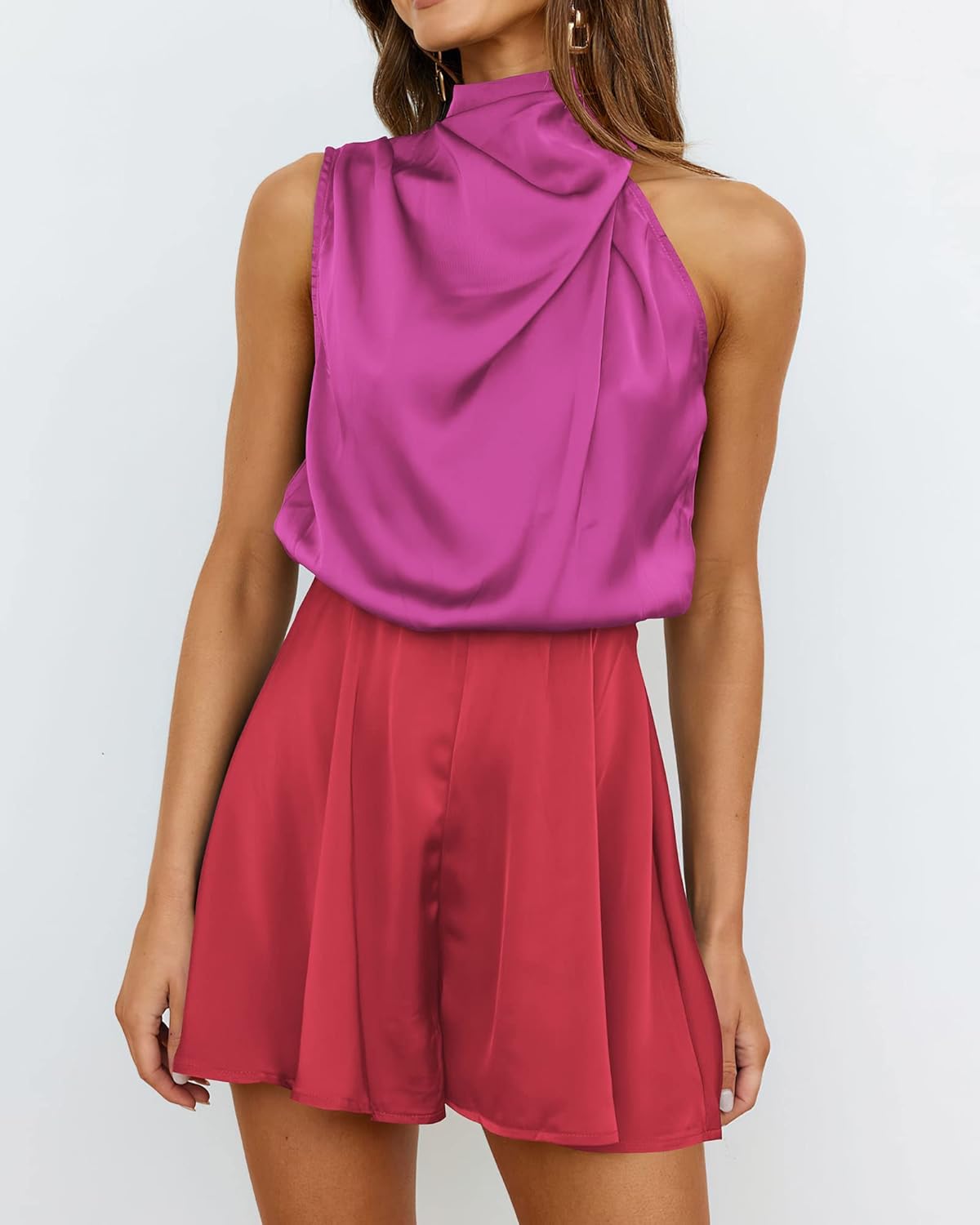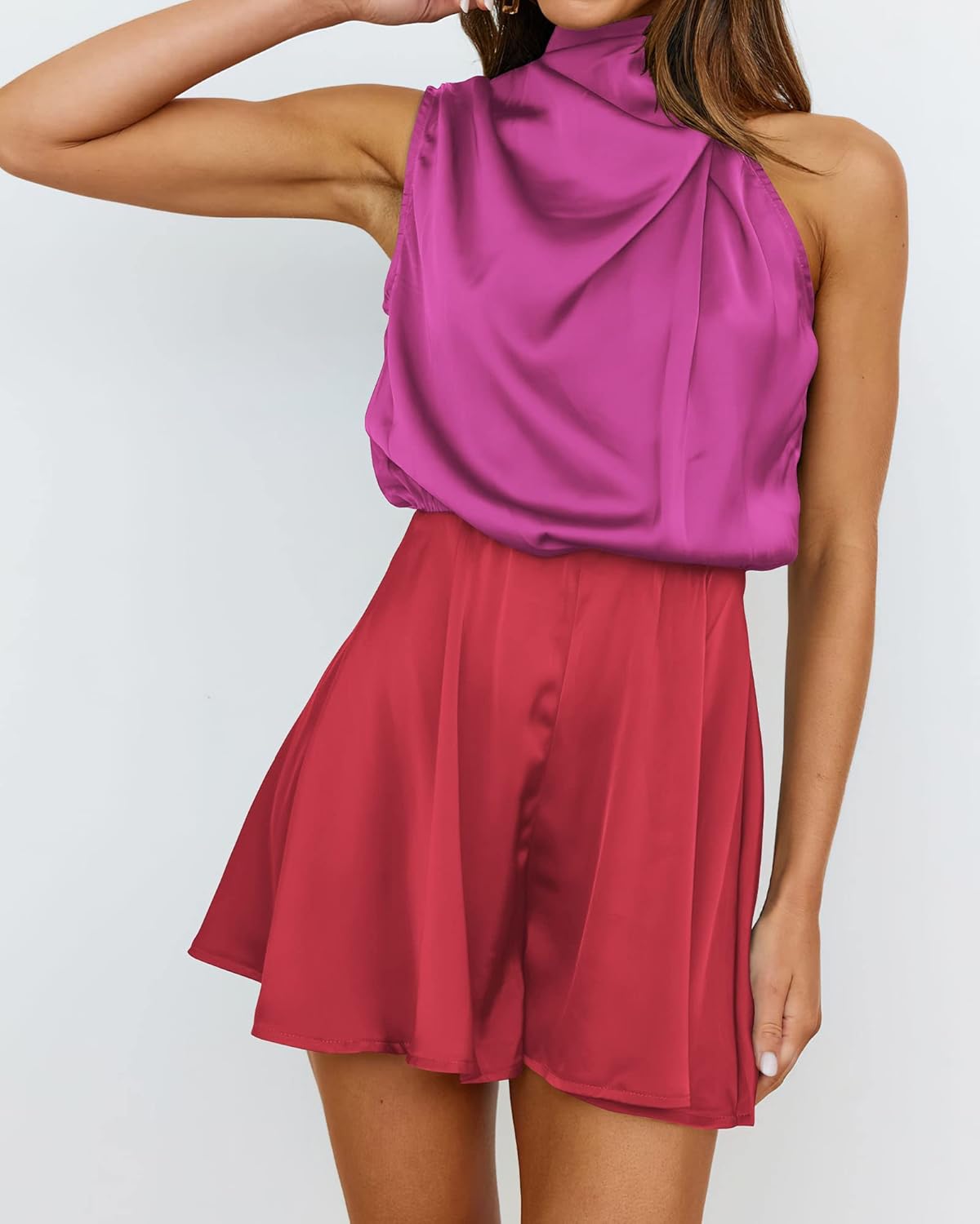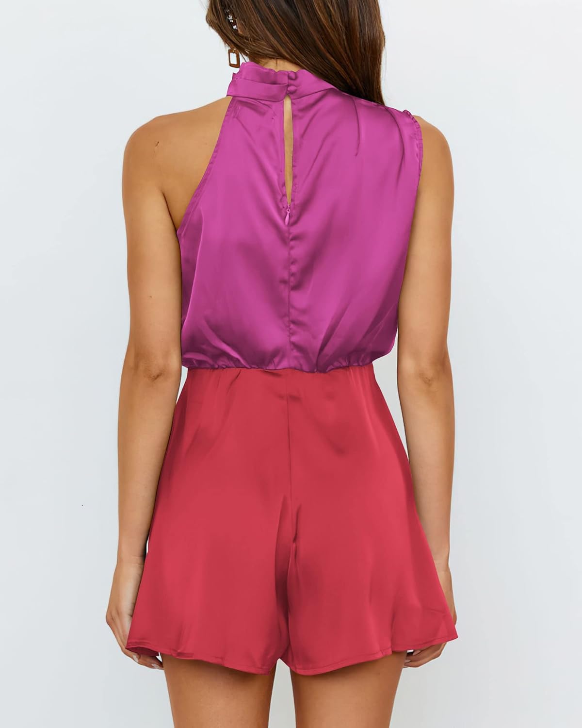 BTFBM Women’s Mock Neck Summer Romper Satin Sleeveless Elastic Waist Casual Beach Party One Piece Short Jumpsuit Rompers(Stitched Rose Red)