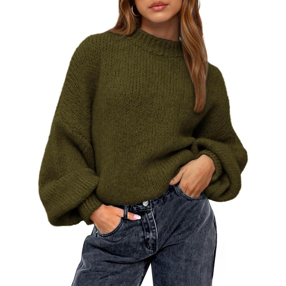 BTFBM Women's Pullover Sweaters Fall Winter 2025 Crew Neck Lantern Long Sleeve Casual Oversized Knit Sweater Tops(Army Green)