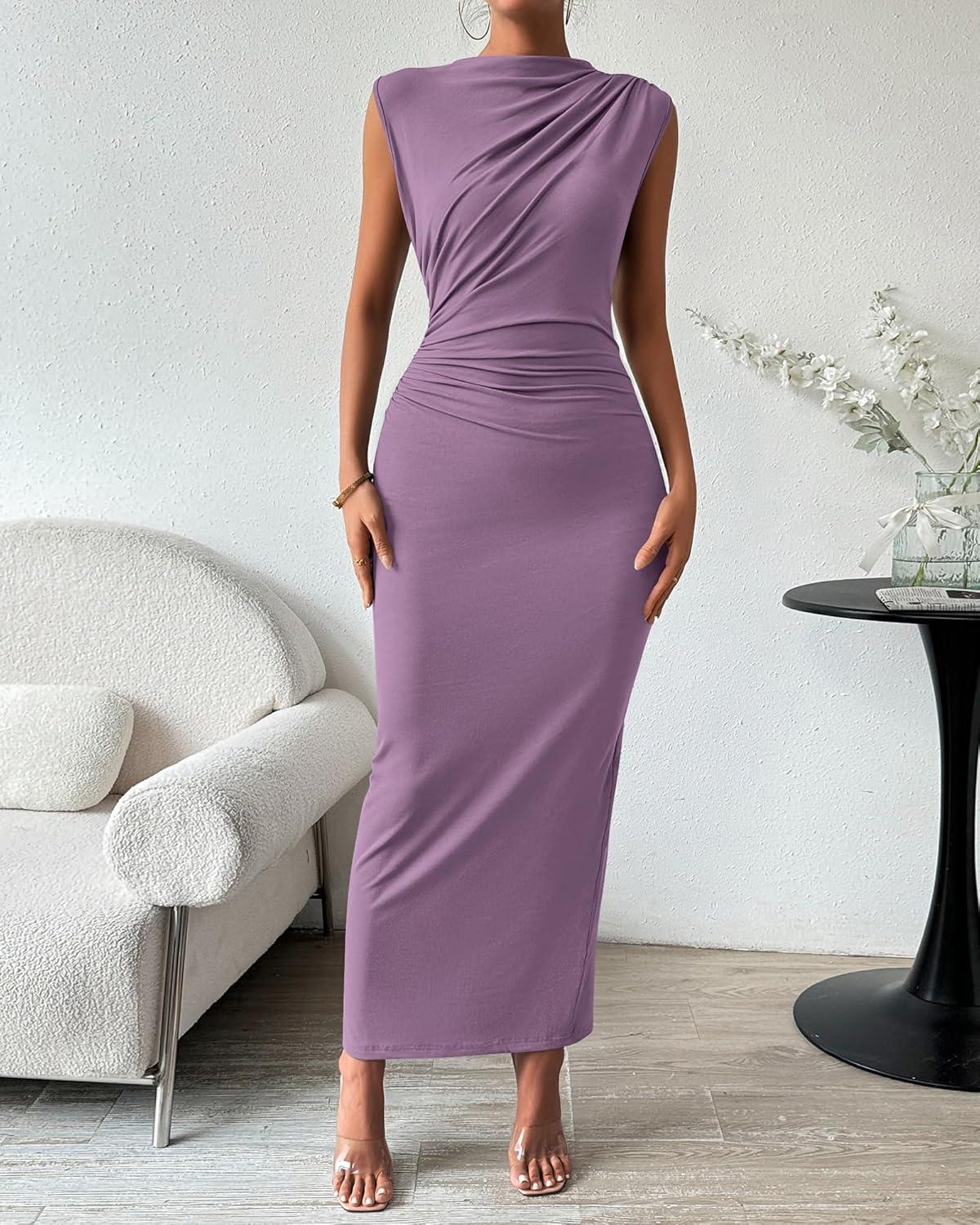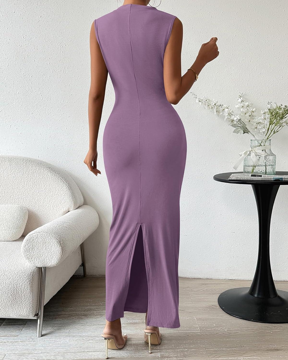BTFBM Women’s Ruched Bodycon Dress Summer Casual Sleeveless Back Slit Elegant Club Evening Party Cocktail Maxi Dresses(Solid Purple)