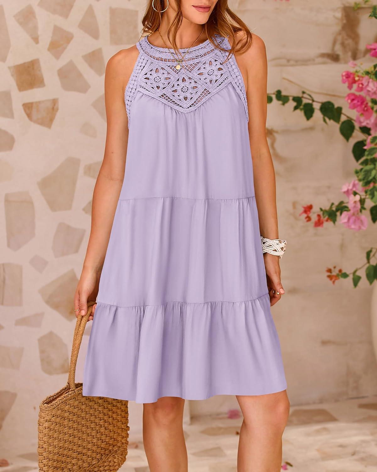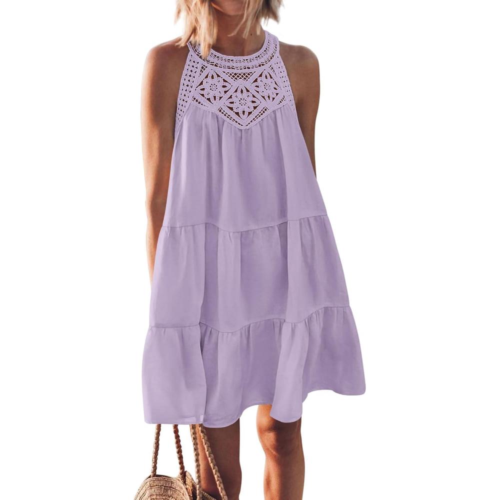 Don’t miss out on our limited-time offer: get a free {accessory} with your purchase of BTFBM Women’s Summer Hollow Out Halter Dresses Casual Sleeveless A-Line Tiered Swing Sundress Beach Vacation Mini Dress(Solid Light Purple).