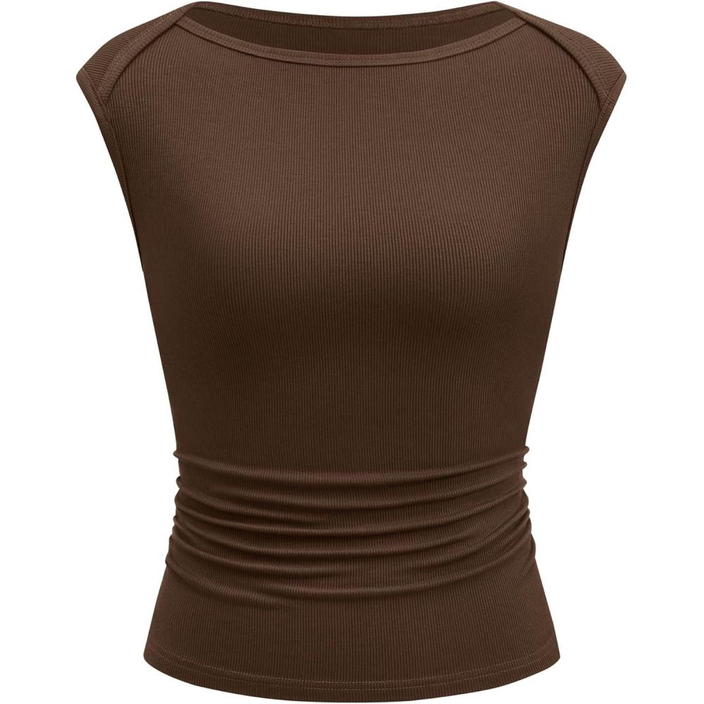 BTFBM Womens Summer Tops 2025 Boat Neck Cap Sleeve Tee Shirts Ruched Slim Fit Knit Going Out Tank Top Fashion Clothing(Brown)