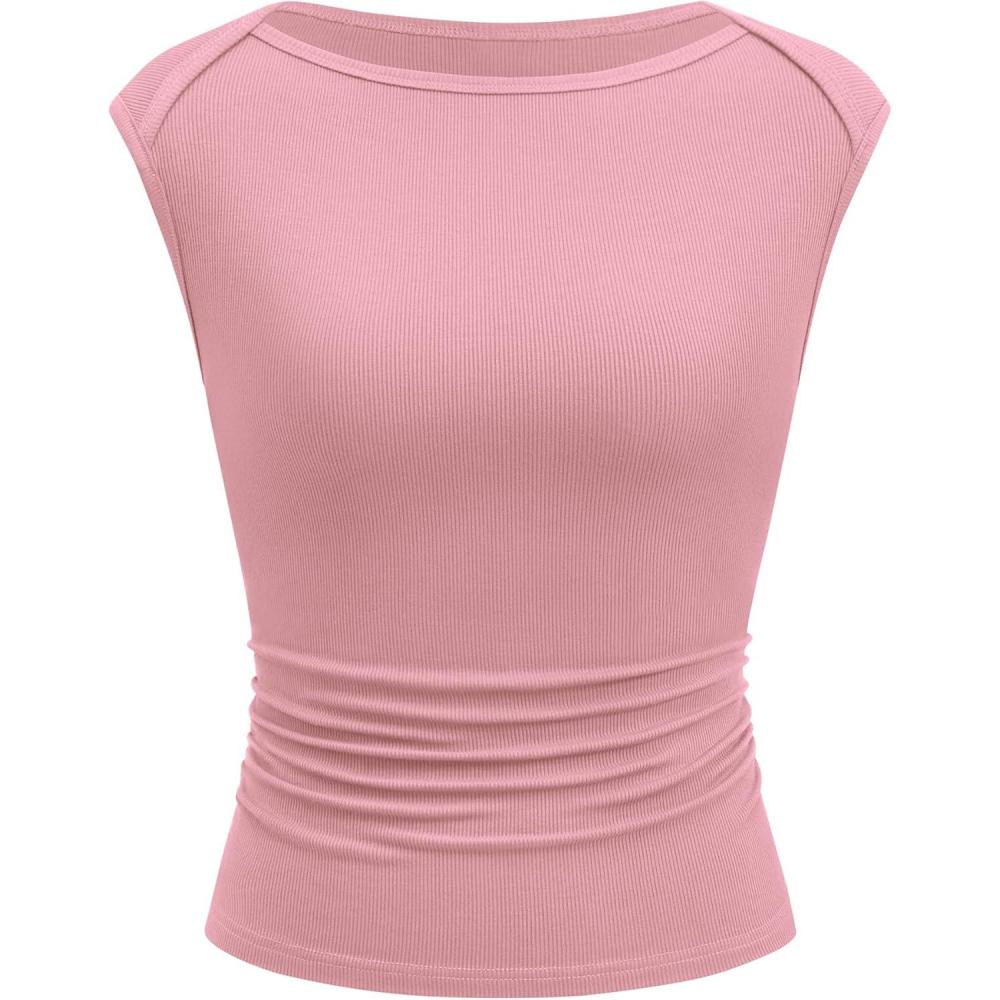 BTFBM Womens Summer Tops 2025 Boat Neck Cap Sleeve Tee Shirts Ruched Slim Fit Knit Going Out Tank Top Fashion Clothing(Pink)