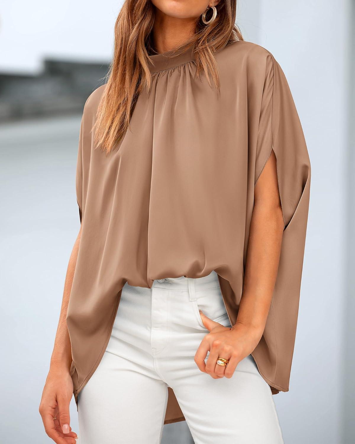 BTFBM Womens Summer Tops 2025 Fall Mock Neck Batwing Sleeve Shirts Loose High Low Hem Oversized Dressy Casual Blouses(Khaki)