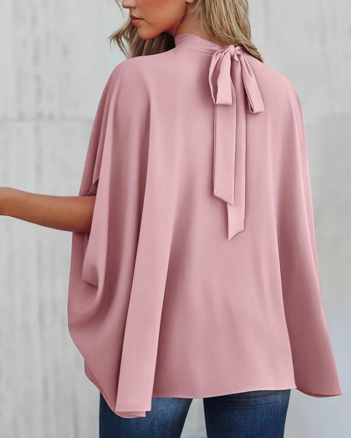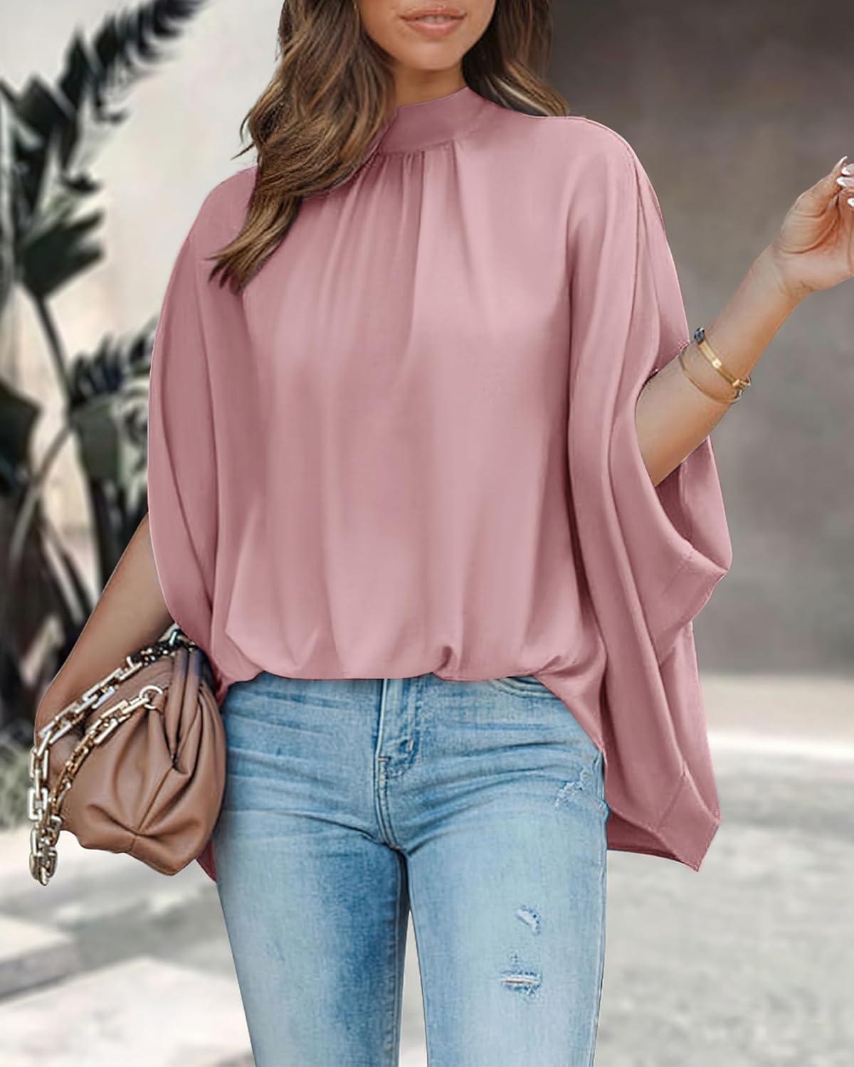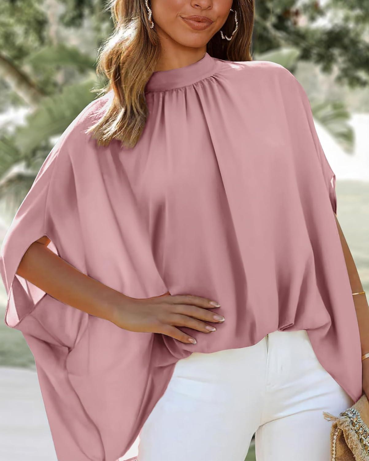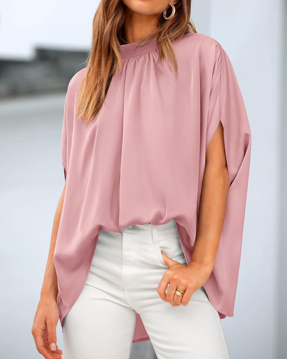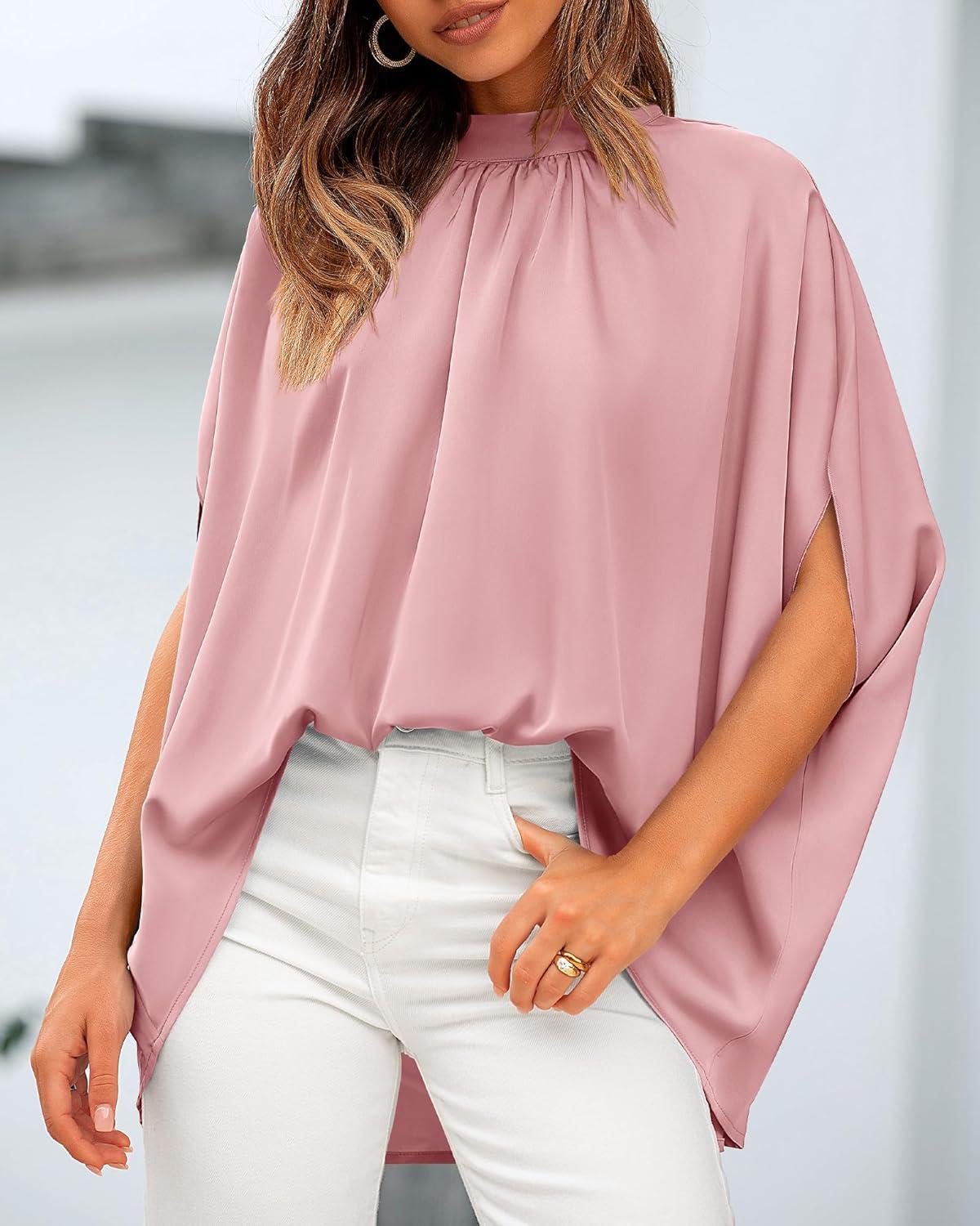 BTFBM Womens Summer Tops 2025 Fall Mock Neck Batwing Sleeve Shirts Loose High Low Hem Oversized Dressy Casual Blouses(Pink)