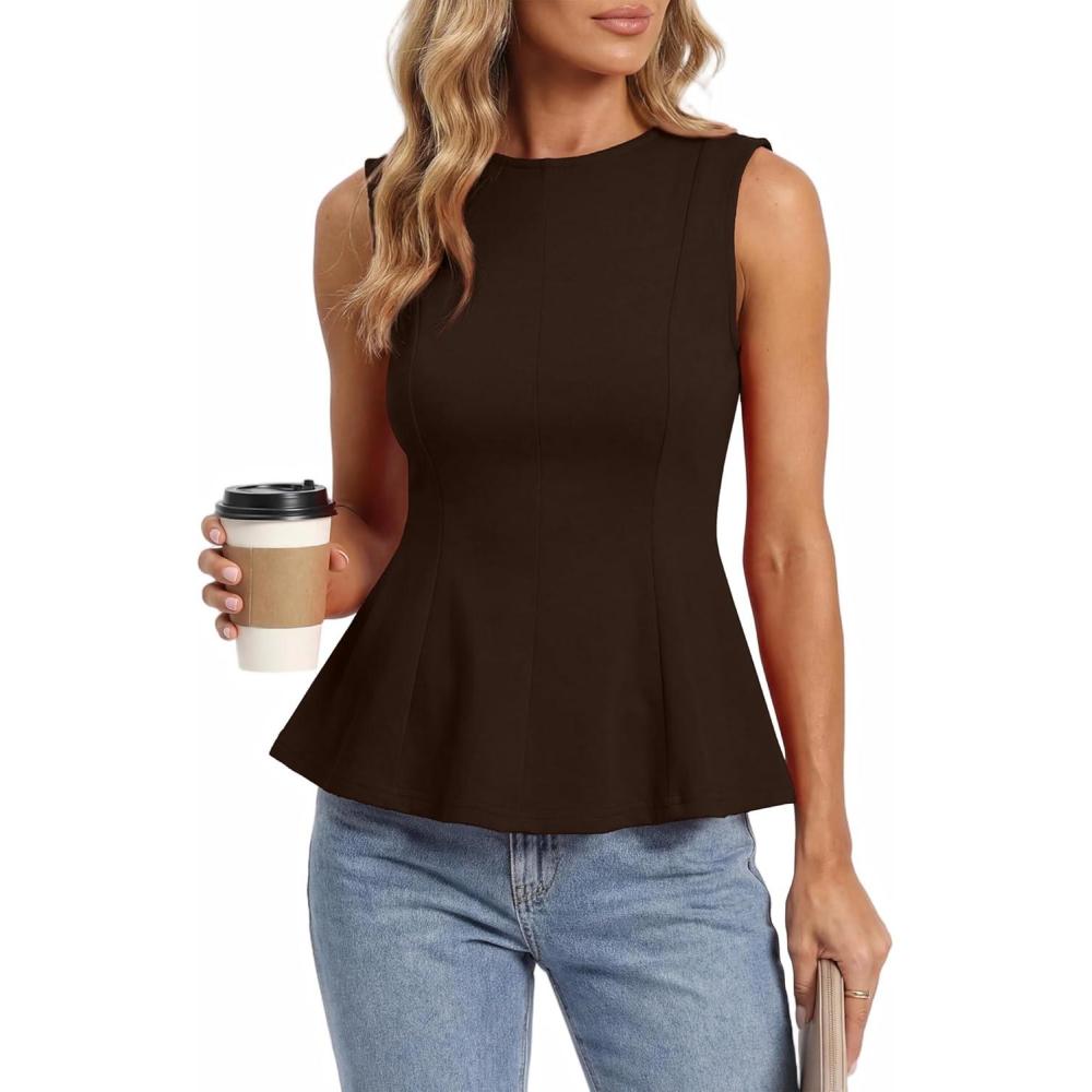 BTFBM Womens Summer Tops 2026 Business Casual Outfits Crew Neck Sleeveless Shirts Slim Fit Peplum Tank Top(Dark Brown)
