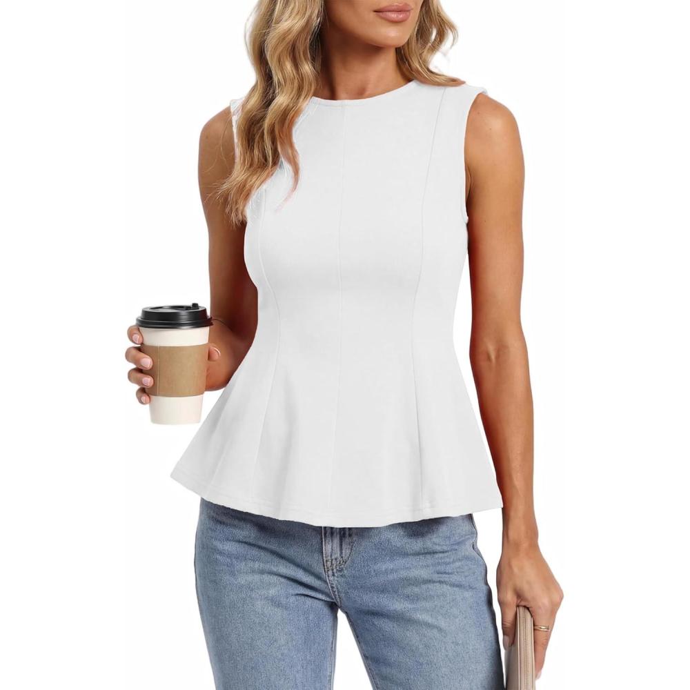 BTFBM Womens Summer Tops 2026 Business Casual Outfits Crew Neck Sleeveless Shirts Slim Fit Peplum Tank Top(White)